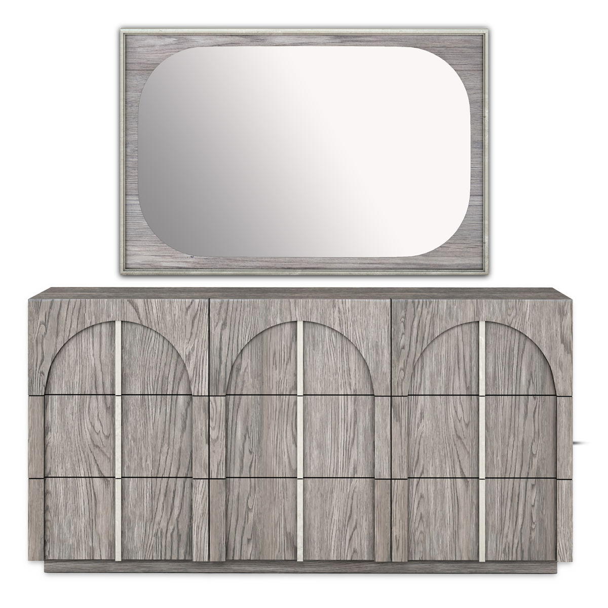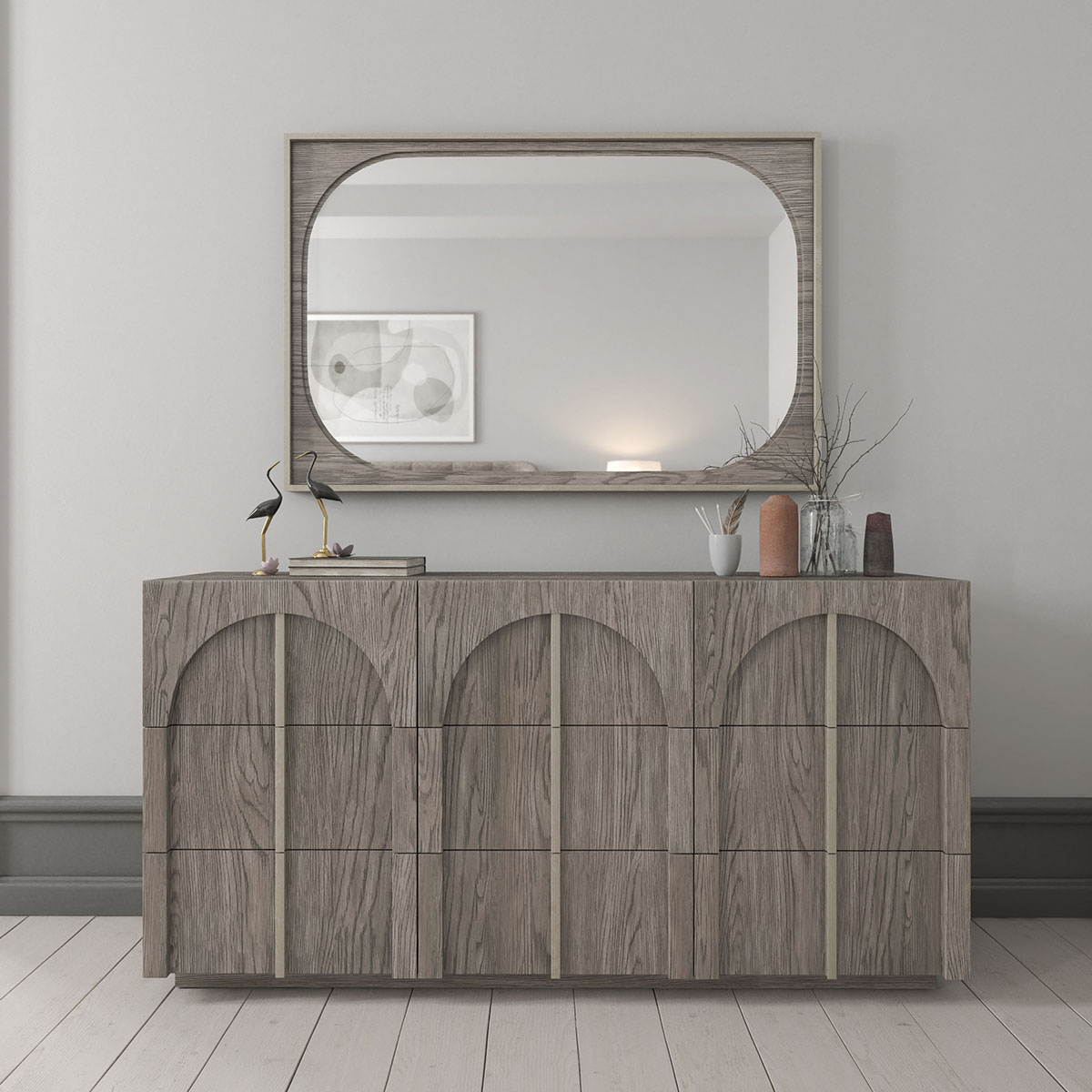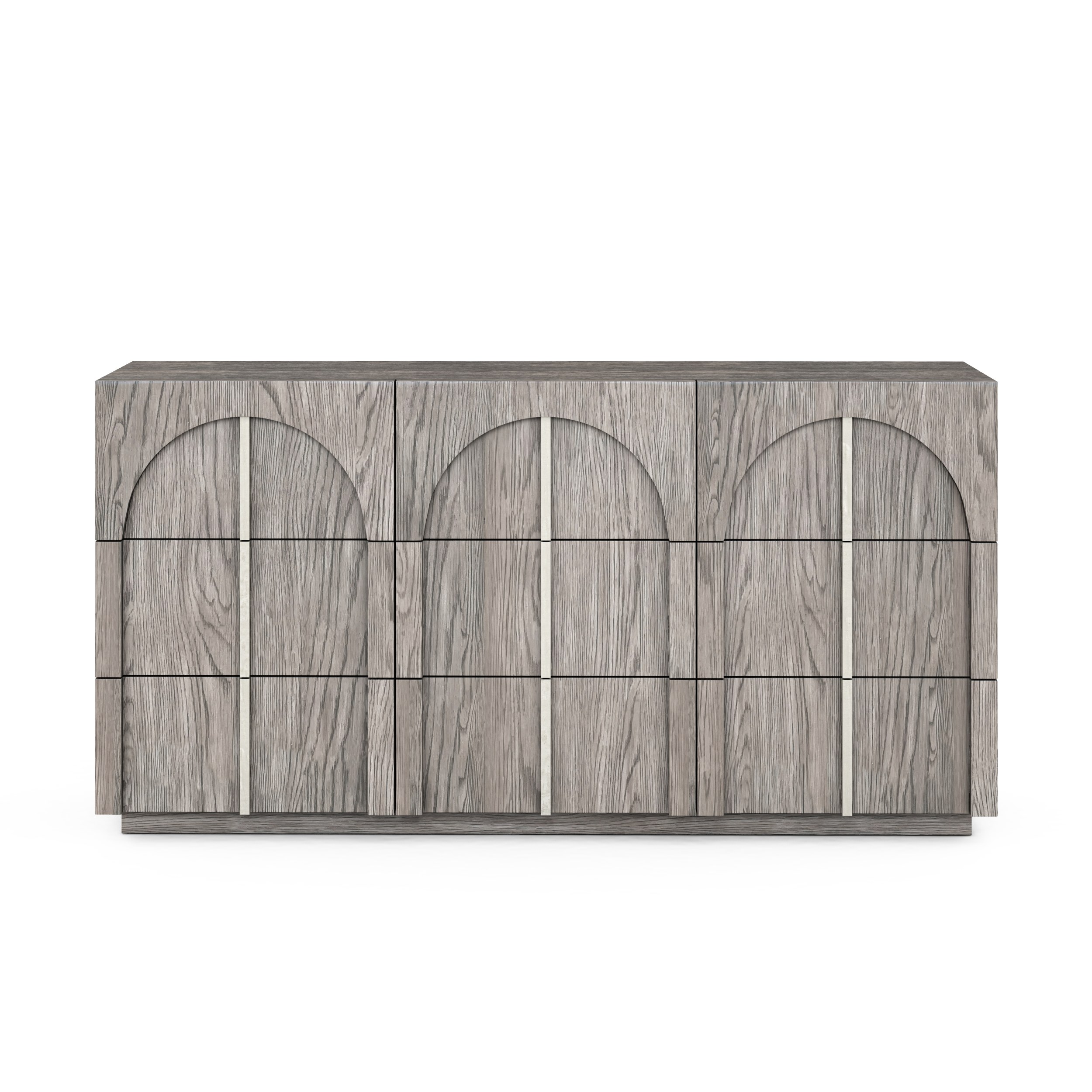 تجمع هذه التسريحة بين الشكل والوظيفة بأسلوب يعكس قوة وثبات العمارة الحديثة. يزينها تصميم بثلاثة أقواس تضيف طابعاً مميزاً، بينما توفر تسعة أدراج مساحة تخزين واسعة. يكتمل المظهر بتشطيب رمادي دافئ بلون منك مع مقابض عصرية أنيقة تمتد بشكل عمودي متصل من الأعلى إلى القاعدة، مما يعزز من انسجام التصميم وأناقة التفاصيل.