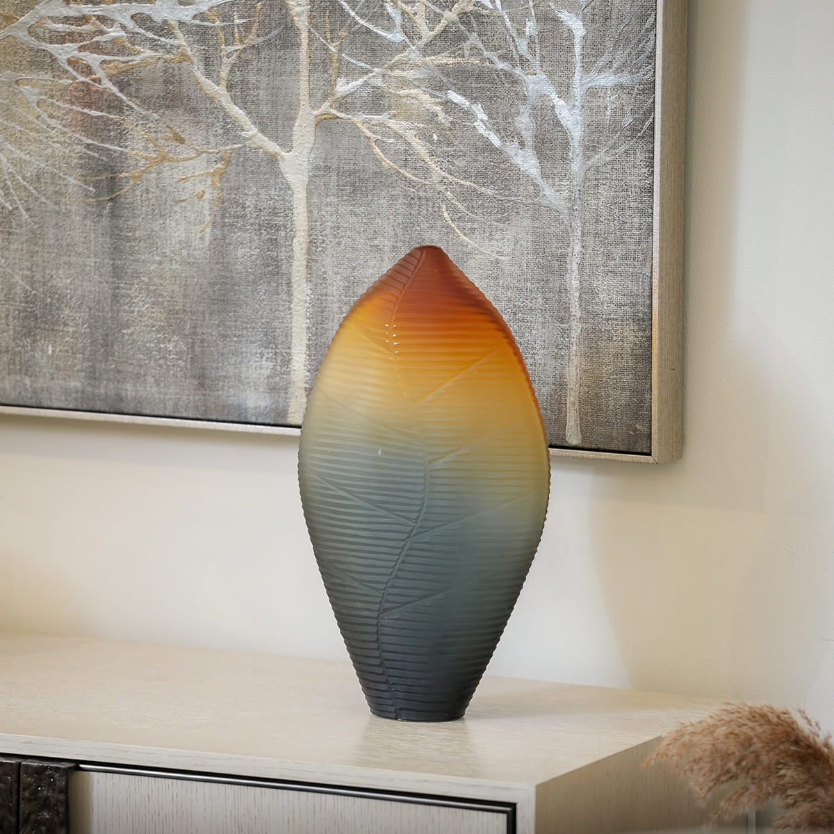 يمتزج اللون البرتقالي الداكن مع الرمادي في مزهريات فيسبير ليكشف عن تدرج ألوان غني يتفتح إلى طيف من الدرجات الطبيعية. صُنعت على يد حرفيين موهوبين، حيث تضفي القمة الدقيقة والسطح المحكم إحساساً بالطبيعة، مع اختلافات مميزة في اللون والملمس تجعل كل مزهرية قطعة فريدة من نوعها. تتوفر بحجمين مختلفين.