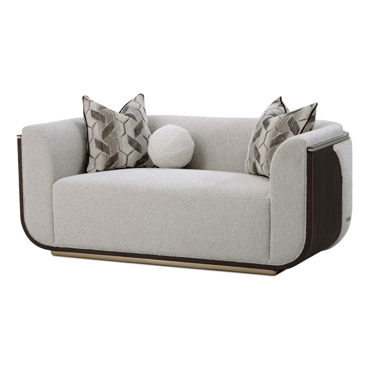 أريكة ويست كنسينغتون لوف سيت صغيرة الحجم لكنها لافتة بتصميمها، تجمع بين الأناقة الراقية والحضور المعماري الجريء. مغطاة بقماش منسوج سميك وفاخر بخيوط متعددة الألوان، يمنح ملمسًا ناعمًا يدعو للاسترخاء، بينما تضفي الألواح الجانبية المزخرفة بتشطيب إسبريسو داكن تباينًا أنيقًا يعزز جاذبيتها. تكتمل أناقتها بقاعدة مذهبة رشيقة وزخارف دقيقة تتبع انحناءاتها بانسيابية تضيف لمسة فاخرة رقيقة. أما الوسائد المنسقة بعناية، فتجمع بين خامات الشنيل الجاكار ووسادة دائرية من الفرو الصناعي لتضفي طبقات من الراحة والعمق. بتصميمها المنحني الأنيق وخطوطها النحتية، تحقق الأريكة مزيجًا متناغمًا بين الأسلوب المعاصر والأناقة الكلاسيكية الخالدة.