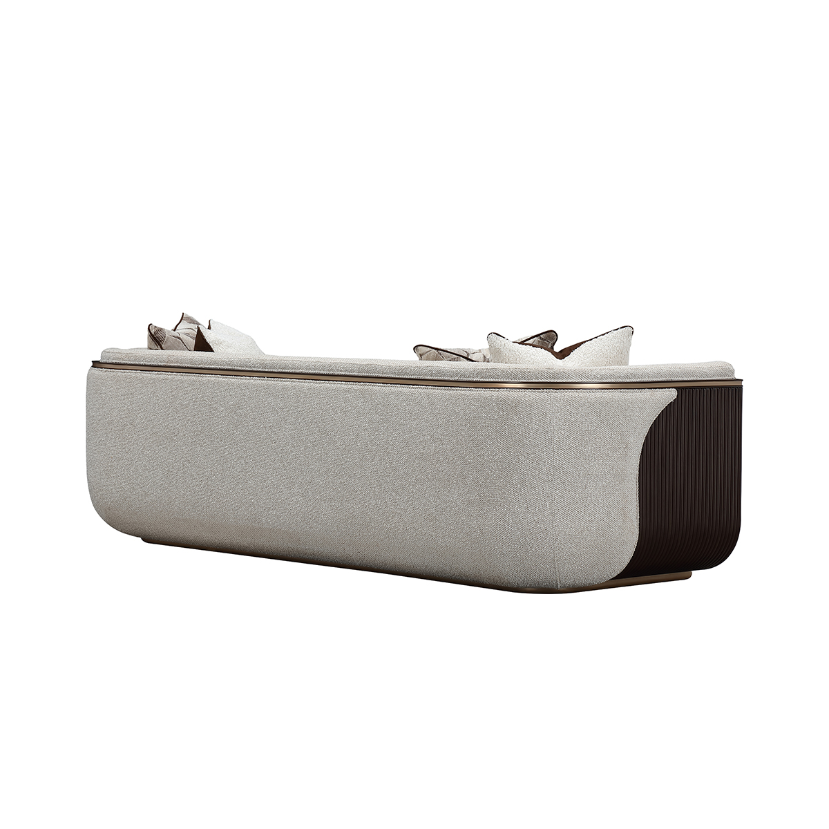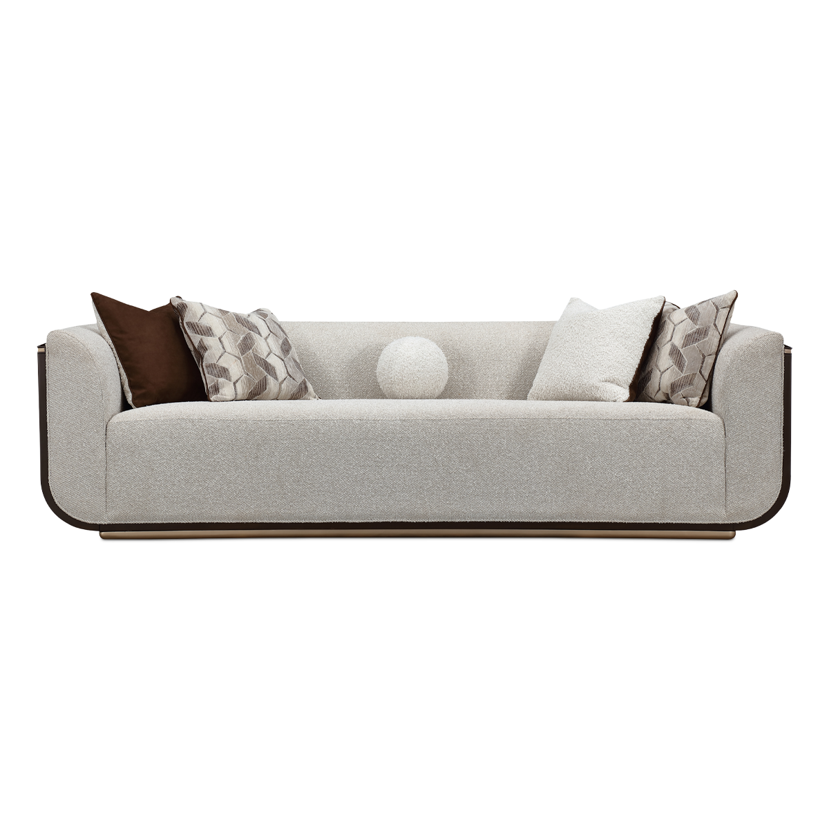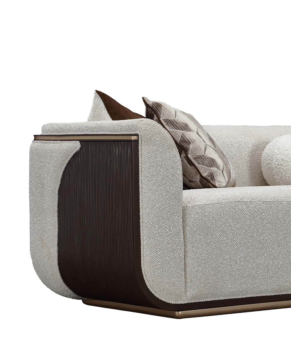أريكة ويست كنسينغتون رشيقة، مُصمّمة بعناية، وأنيقة بلا عناء — تمثل ذروة الفخامة الراقية. مُنجدة بقماش منسوج سميك وفاخر بخيوط متعددة الألوان، تمنح ملمسًا غنيًا وتجربة حسية متميزة. تحيط بها ألواح خشبية مزخرفة بتشطيب إسبريسو داكن يبرز شكلها ويخلق تباينًا لافتًا مع النسيج الناعم. قاعدة ذهبية أنيقة مع زخارف دقيقة تتبع انحناءاتها، مما يبرز تصميمها المتوازن. تكتمل الإطلالة بخمس وسائد مختارة بعناية، تجمع بين خامات الجاكار الشنيل، الجلد الصناعي مع الفرو الصناعي، ووسادة دائرية من الفرو الصناعي، لتمنح أبعادًا إضافية وراحة متكاملة. تصميمها النحتي بأذرع منحنية بلطف وبروفايل أنيق يعكس جاذبية معاصرة لا تخلو من الطابع الكلاسيكي.