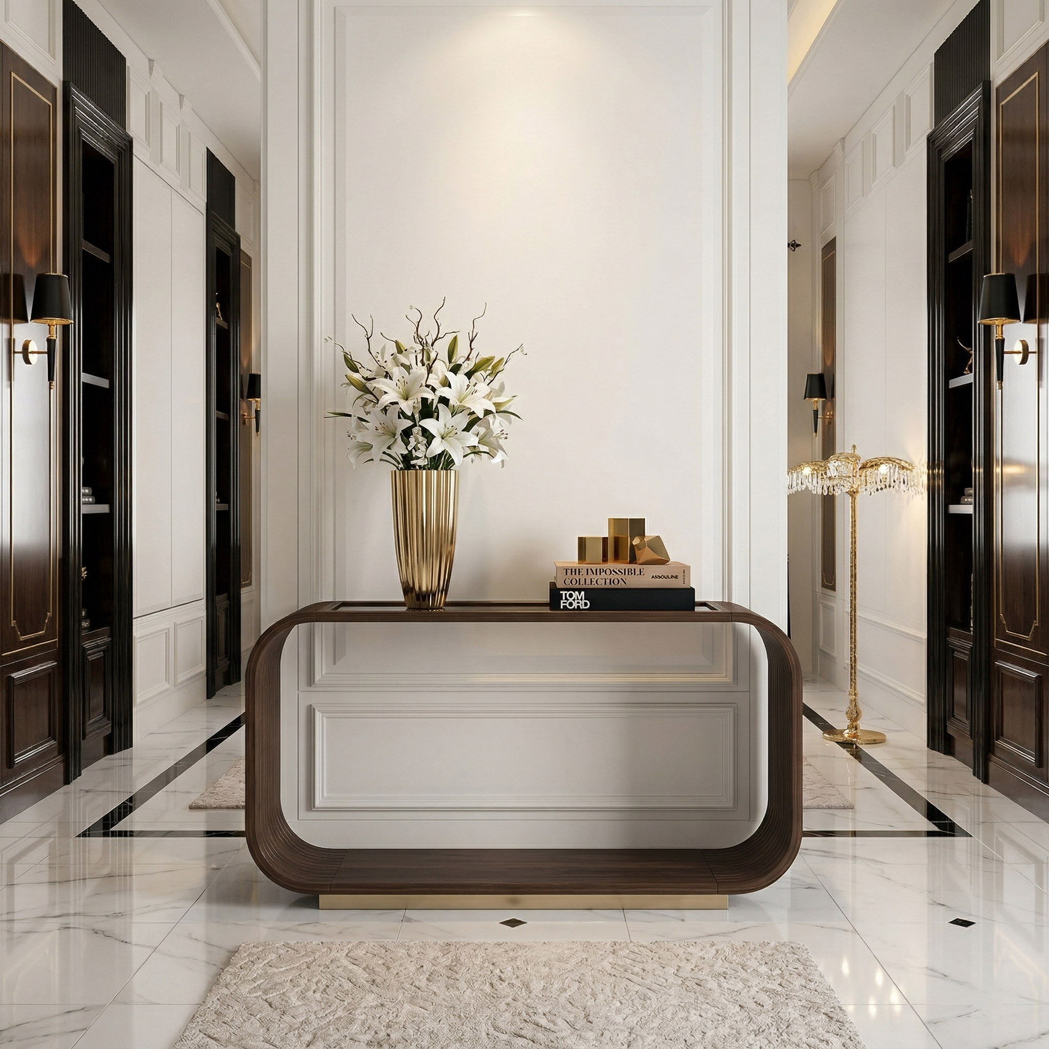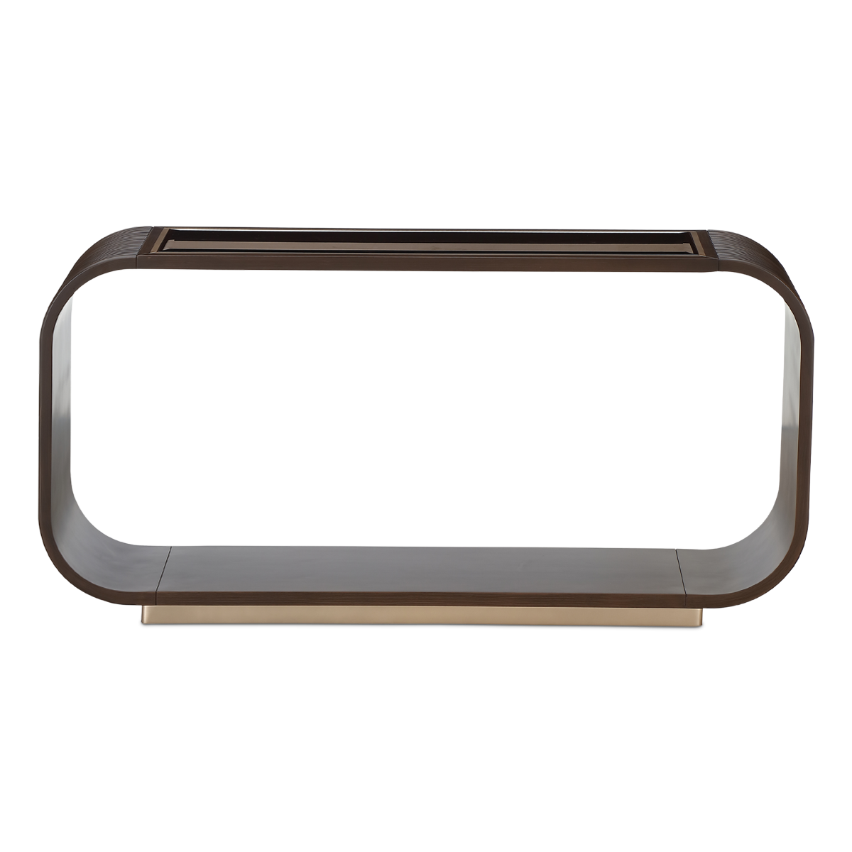 طاولة الكونsole ويست كنسينغتون أنيقة، عصرية، ومليئة بالفخامة البسيطة، فهي تحفة من التصميم المعاصر.يمنحها هيكلها المفتوح والانسيابي إحساسًا بالخفة،بينما تضيف النقوش المحفورة بتشطيب إسبريسو غني عمقًا وملمسًا مميزًا.يزيد سطحها الزجاجي المدخن من جاذبيتها الفاخرة،محاطًا بحواف مزينة بلمسات ذهبية تضفي بريقًا راقيًا.صُممت لتكون ملفتة للنظر ومتعددة الاستخدامات،مما يجعلها قطعة مثالية لتزيين المداخل أو غرف المعيشة أو خلف الأرائك.