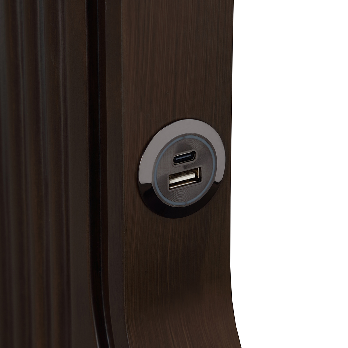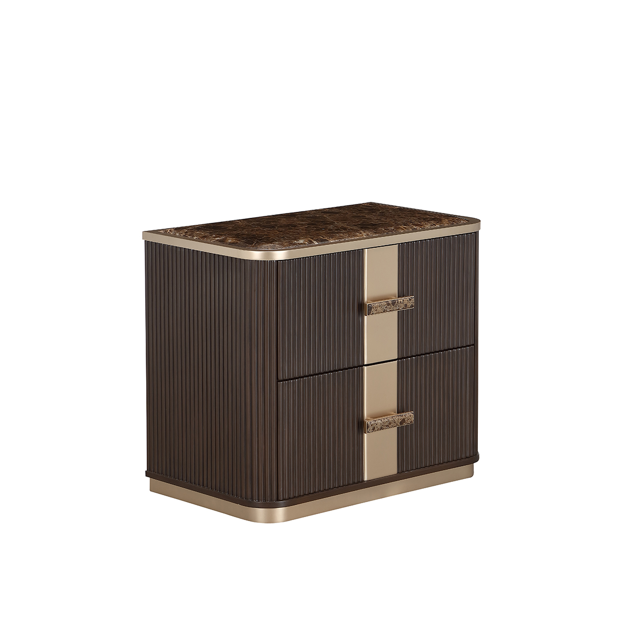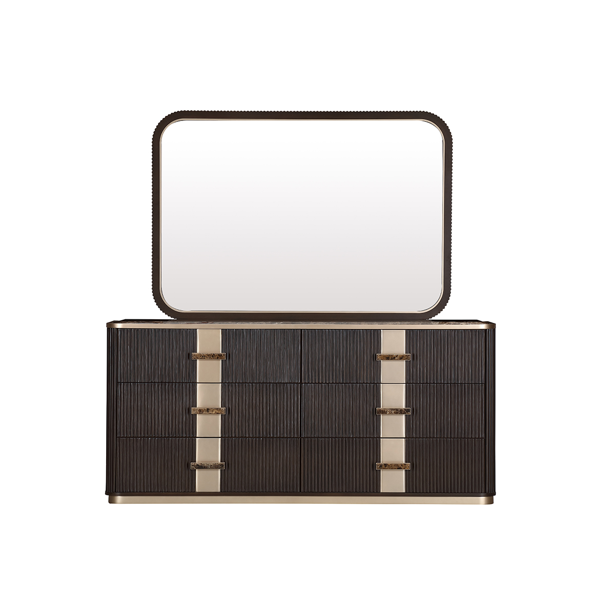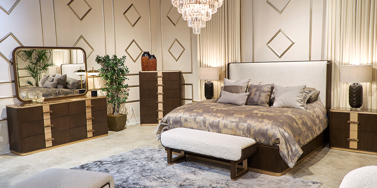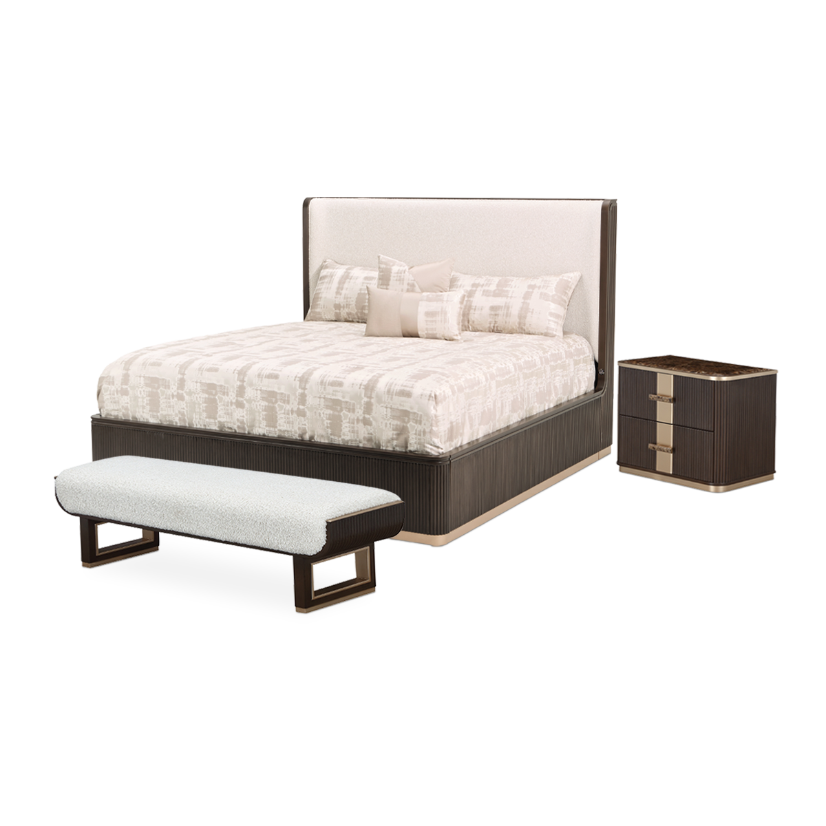 سرير ويست كنسينغتون تحفة من الرقي العصري حيث تلتقي الحرفية المتقنة مع الفخامة البسيطة.مغطى بقماش فاخر منسوج متعدد الألوان يمنح لوح الرأس المبطّن ملمسًا دافئًا يدعو للاسترخاء،بينما يضفي تصميم الجناحين الجانبيين لمسة من الأناقة المترفة.يكتمل التصميم بإطار نحتي بتشطيب إسبريسو مزخرف بنقوش محفورة مع قاعدة مطعمة بالذهب تضيف عمقًا معماريًا لافتًا.لمسة عصرية مبتكرة تتجسد في وجود مداخل USB مخفية تمنح الراحة والفخامة معًا،لتجعل غرفة النوم مزيجًا من الأسلوب والوظيفة.الطاولة الجانبية ويست كنسينغتون هي قمة التوازن بين المواد الفاخرة والوظائف الحديثة.يغلفها تشطيب إسبريسو داكن مع نقش محفور يمنحها حضورًا نحتياً بارزاً،وتعلوها طبقة من قشرة رخام إمبرادور الفاخرة التي تشع بالفخامة.تضيف اللمسات المذهبة بريقًا متلألئًا يرفع من فخامتها،فيما تقدم الأدراج المبطنة بالمخمل والمزودة بآلية إغلاق ناعم تجربة تخزين مترفة.كما يضمن الضوء الحركي داخل الدرج العلوي سهولة الوصول حتى في الظلام،لتجمع الطاولة بين العملية والأناقة الراقية.خزانة الأدراج والمرآة ويست كنسينغتون تمثل تحفة من الفخامة المصقولة،حيث تمتزج الخامات الجريئة مع اللمسات الفاخرة.تغلفها طبقة من إسبريسو داكن مزخرف بالنقوش،وتعلوها قشرة رخام إمبرادور المبهرة التي تضيف لمسة فاخرة متألقة.تعززها اللمسات الذهبية والمقابض المزينة بالرخام،فيما توفر الأدراج الستة المبطنة بالمخمل مساحات تخزين مترفة.تكتمل المجموعة بمرآة كبيرة مؤطرة بتشطيب إسبريسو نحتي وحدود ذهبية لامعة،مما يخلق توازناً بصريًا رائعًا بين العمق والإشراق.المقعد ويست كنسينغتون يرفع من جمالية المساحة بفضل تصميمه الذي يجمع بين الفخامة العصرية والأناقة الكلاسيكية.مغطى بكسوة فاخرة من الفرو الصناعي تمنحه دفئًا وأناقة في آن،فيما توفر قاعدته بتشطيب إسبريسو مزخرف مع لمسات مذهبة تباينًا جذابًا مع المقعد المترف.بفضل تصميمه النحتي الأنيق،يناسب هذا المقعد غرف النوم والمداخل وغرف المعيشة،ليضفي لمسة من الرقي الخالد على أي مساحة.