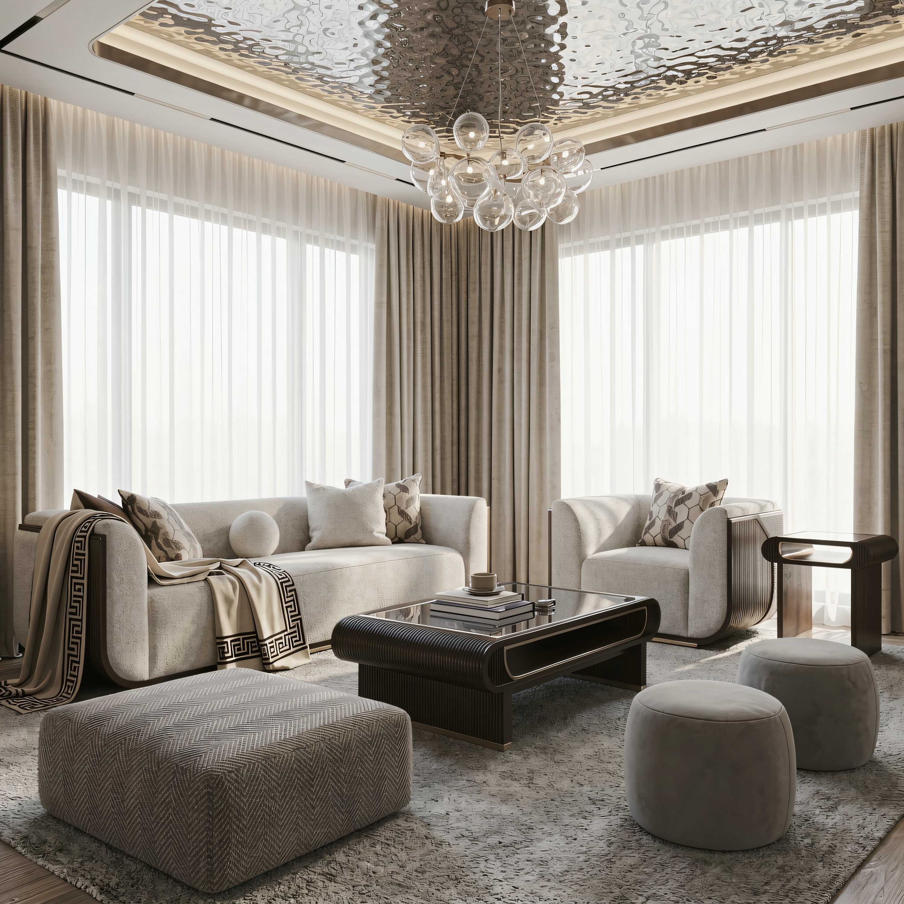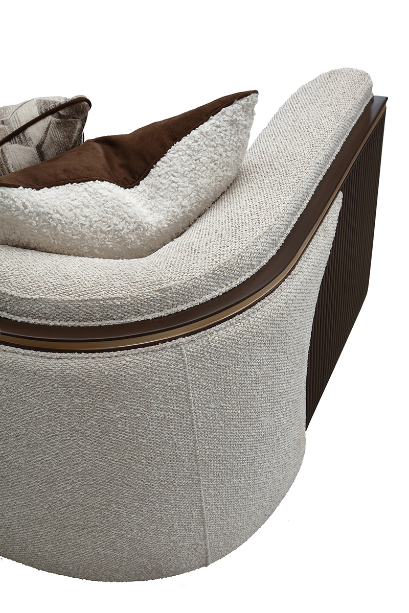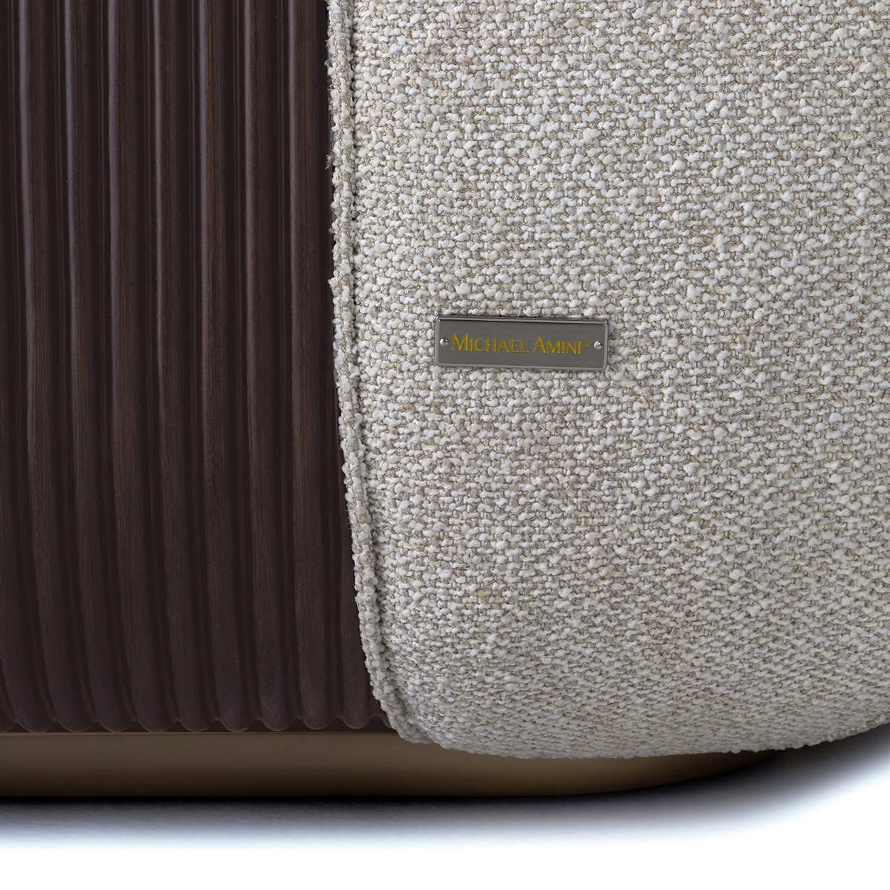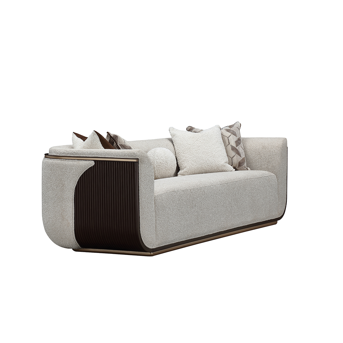 أريكة ويست كنسينغتون رشيقة ومُتقنة التصميم وأنيقة بلا عناء، تمثل عنوانًا للفخامة الراقية. مُنجدة بقماش فاخر منسوج سميك بخيوط متعددة الألوان يمنح ملمسًا غنيًا وتجربة حسية مميزة، فيما تُؤطرها ألواح خشبية مزخرفة بتشطيب إسبريسو داكن يبرز شكلها ويمنح تباينًا رائعًا مع القماش الناعم. تزداد أناقتها بقاعدة مذهبة وزخارف دقيقة تتبع انحناءاتها بخطوط متوازنة، بينما تكتمل تفاصيلها بخمس وسائد مختارة بعناية تجمع بين خامات الجاكار الشنيل، الجلد الصناعي مع الفرو الصناعي، ووسادة دائرية من الفرو الصناعي لإضفاء عمق وراحة إضافية. بلمستها النحتية وأذرعها المنحنية بلطف وبروفايلها الأنيق، تحقق الأريكة مزيجًا متناغمًا يجمع بين الحداثة والجاذبية الكلاسيكية الخالدة.