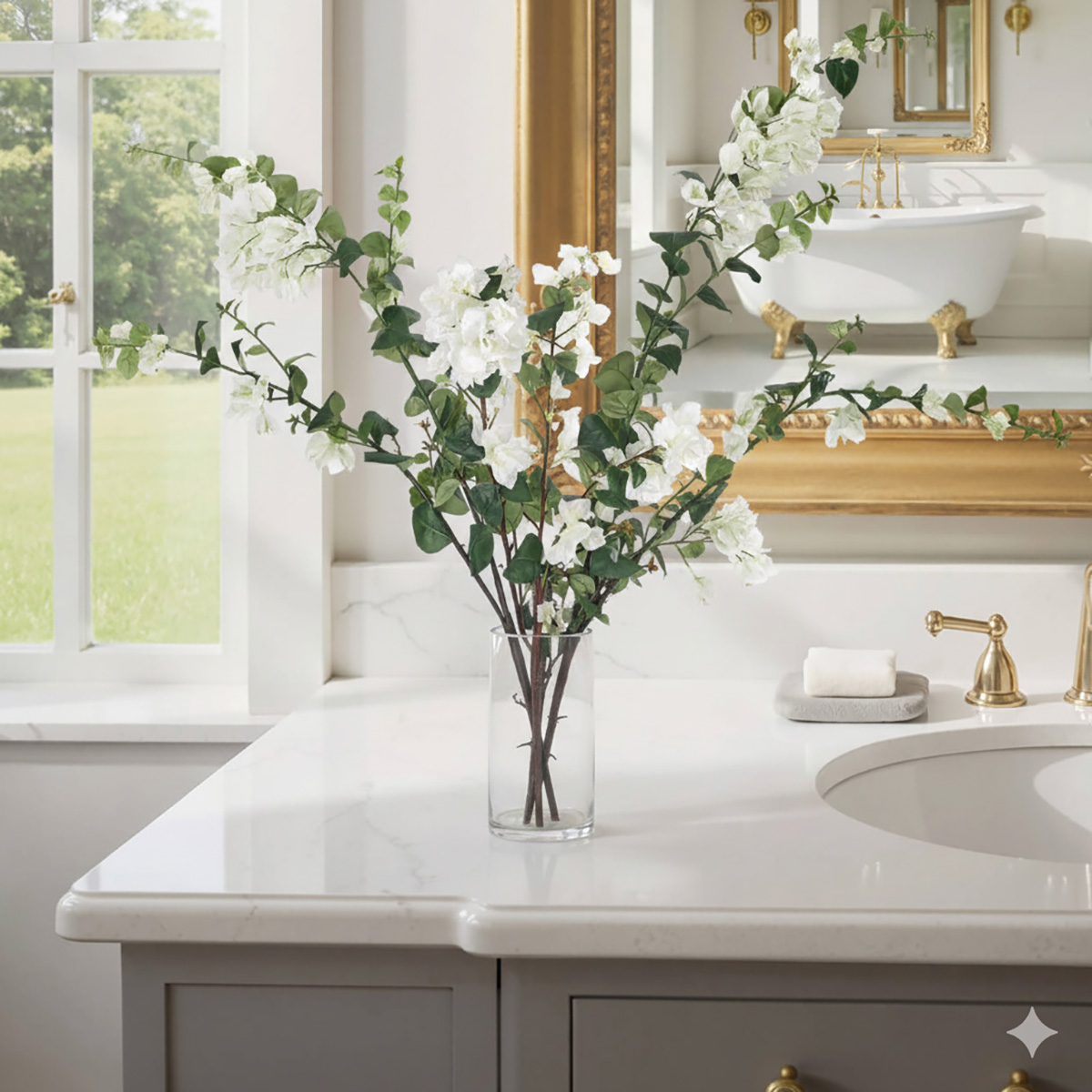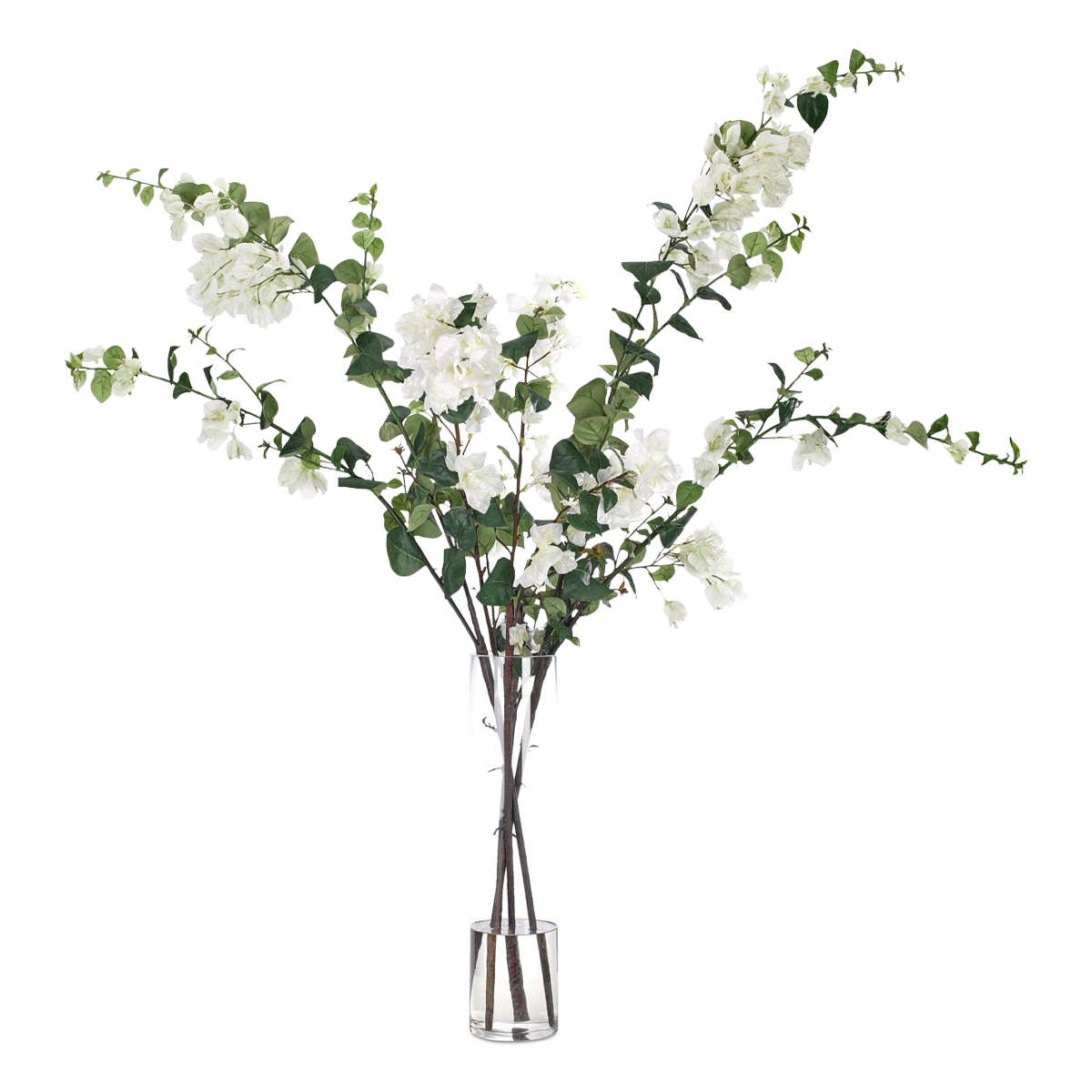 تنسيق البوقنفيليا البيضاء الاصطناعية يستوحي جمال الطبيعة، ويأتي داخل أسطوانة زجاجية شفافة تمنح شعوراً بالانتعاش الدائم. تعتمد تصاميم “ووترغاردن” على تثبيت السيقان داخل الزجاج في طبقة من “الماء” البلوري الواقعي، مما يخلق إيحاء باقة مقطوفة للتو بكل تفاصيلها الطبيعية. تضفي تدرجات البتلات وملامسها الناعمة مظهراً حقيقياً نابضاً بالحياة، ومع ذلك يبقى التنسيق محافظاً على رونقه طوال العام دون أي عناية أو صيانة. قطعة مثالية لإضافة لمسة هادئة وطبيعية إلى أي مساحة.