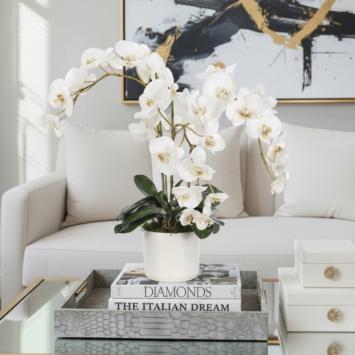 تنسيق أزهار الأوركيد الفالانوبسيس البيضاء هذا مصمم بعناية ليبدو نابضاً بالحياة، حيث يأتي داخل وعاء خزفي أنيق يمنحه حضوراً راقياً في أي مساحة. تتميّز البتلات بملمس ناعم وتفاصيل دقيقة تعكس واقعية متقنة، فيما يتيح التصميم طويل الأمد الاحتفاظ بجماله دون أي صيانة. تنسجم هذه الأوركيد بسهولتها وأناقتها الهادئة مع المساحات العصرية والبسيطة، لتضفي لمسة رقي طبيعية ومتوازنة على الديكور.