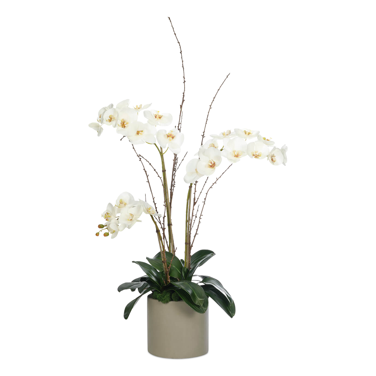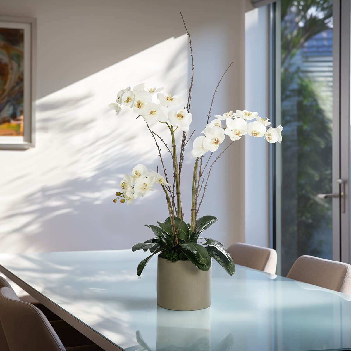 تنسيق أزهار الأوركيد الفالانوبسيس البيضاء المصنوع يدوياً يضفي لمسة واقعية آسرة، حيث يأتي داخل وعاء خرساني أنيق يبرز جماله الطبيعي. تتميز بتلاته الناعمة وتدرجاته اللونية الدقيقة بعمق وبعد بصري ملفت، بينما يحافظ التنسيق على لونه وشكله موسمًا بعد موسم دون أي عناية. يمنح هذا التصميم لمسة رقي هادئة، وهو خيار مثالي للمساحات العصرية والبسيطة بفضل مظهره الأنيق وطابعه الطبيعي المتقن.