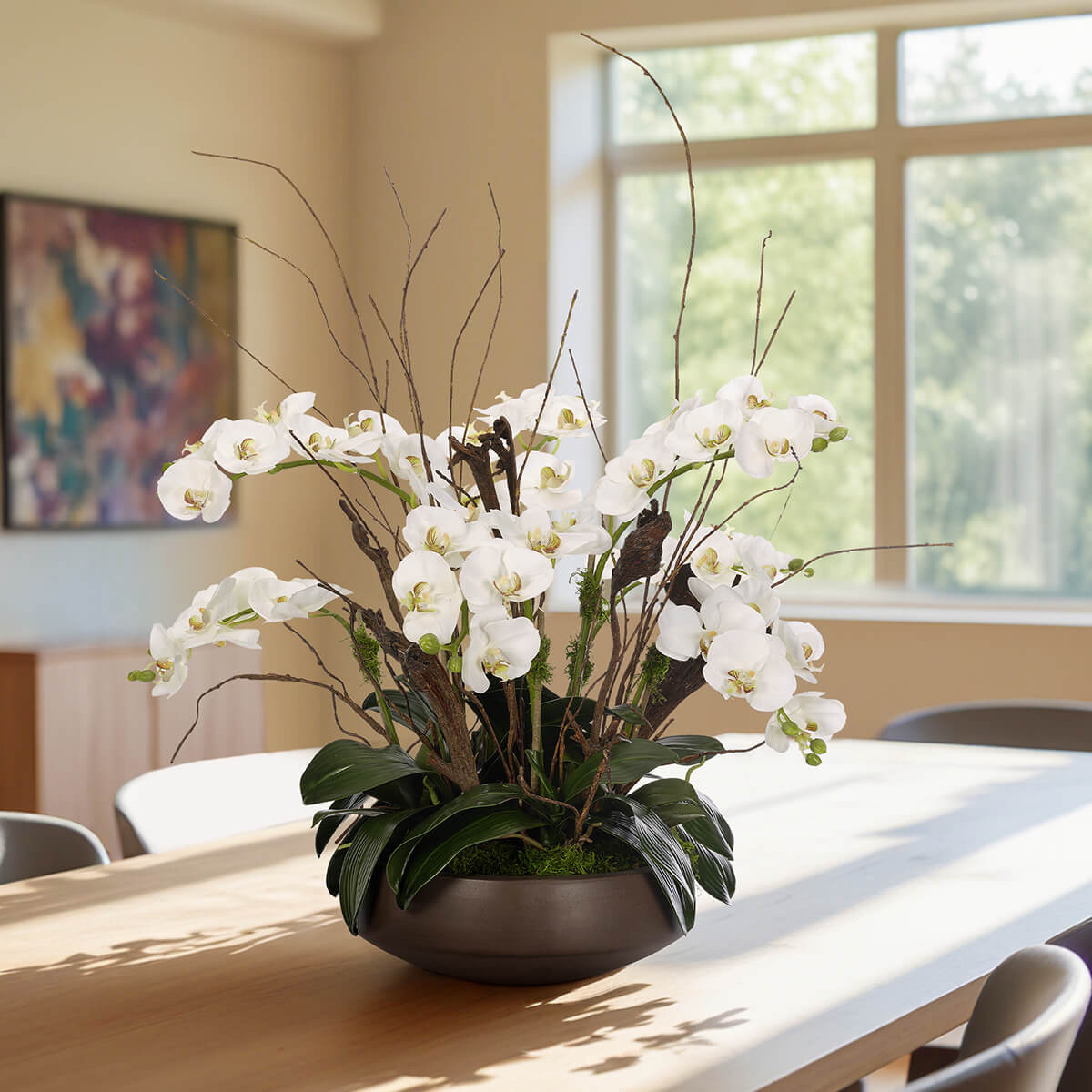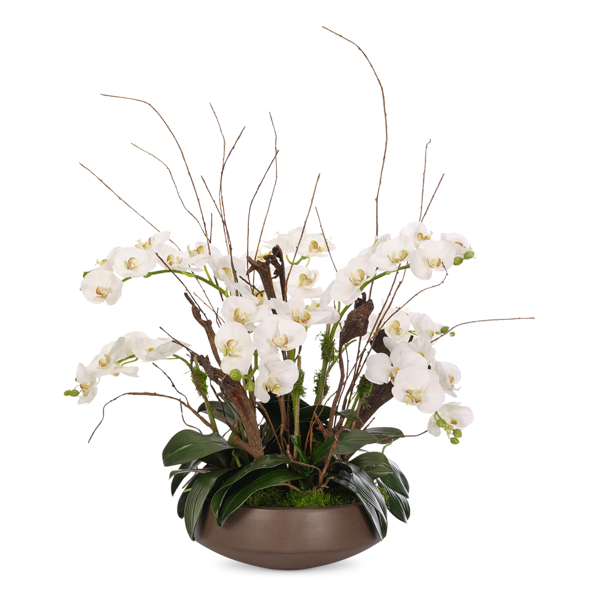 صُممت هذه الباقة الحريرية من زهور الأوركيد البيضاء الفالينوبسيس لتُجسّد جمال الموسم، وتُقدّم في وعاء خرساني. بتلاتها الناعمة وظلالها الواقعية تُضفي بُعدًا وعمقًا. تصميمها طويل الأمد يُضفي جمالًا يدوم طويلًا دون عناء. تُضفي زهور الأوركيد الغريبة لمسةً استوائيةً راقية على الديكورات الداخلية المعاصرة.