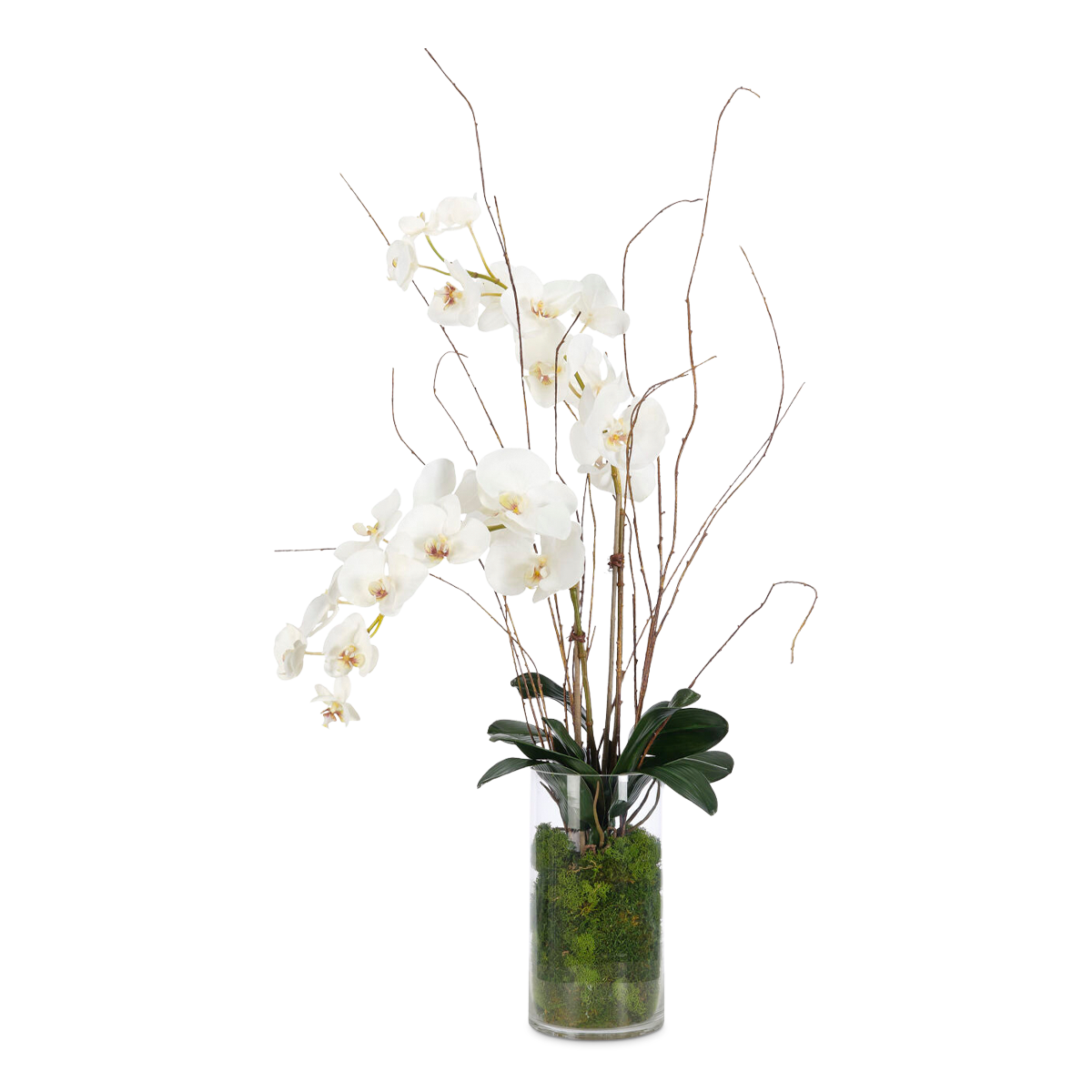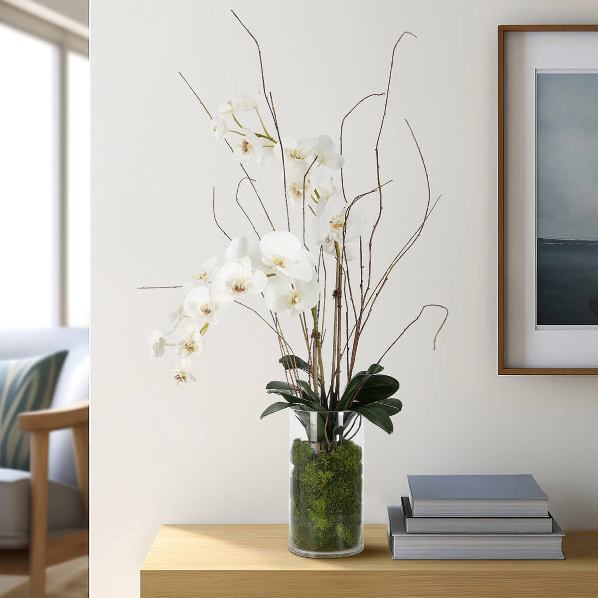 تنسيق أزهار الأوركيد الفالانوبسيس البيضاء هذا يمنح المساحة لمسة من الأناقة الطبيعية، حيث يأتي داخل أسطوانة زجاجية شفافة بتصميم مصقول يعكس جمال الباقة بطريقة نابضة بالحياة. تتميّز تصاميم *موس غاردن* بطبقة غنية من الطحالب الطبيعية في أسفل كل تنسيق، مما يوفّر قاعدة عضوية تربط الزهور بالطبيعة وتخلق توازناً بصرياً ينسجم مع أسلوب الفخامة الهادئة. تضفي البتلات الناعمة وتدرجاتها الطبيعية مظهراً يشبه الزهور المقطوفة حديثاً، بينما يحافظ التصميم على لونه وشكله موسمًا بعد موسم دون أي عناية. تناسب هذه الأوركيد المساحات العصرية والبسيطة بفضل حضورها الراقي وأناقتها المتقنة.