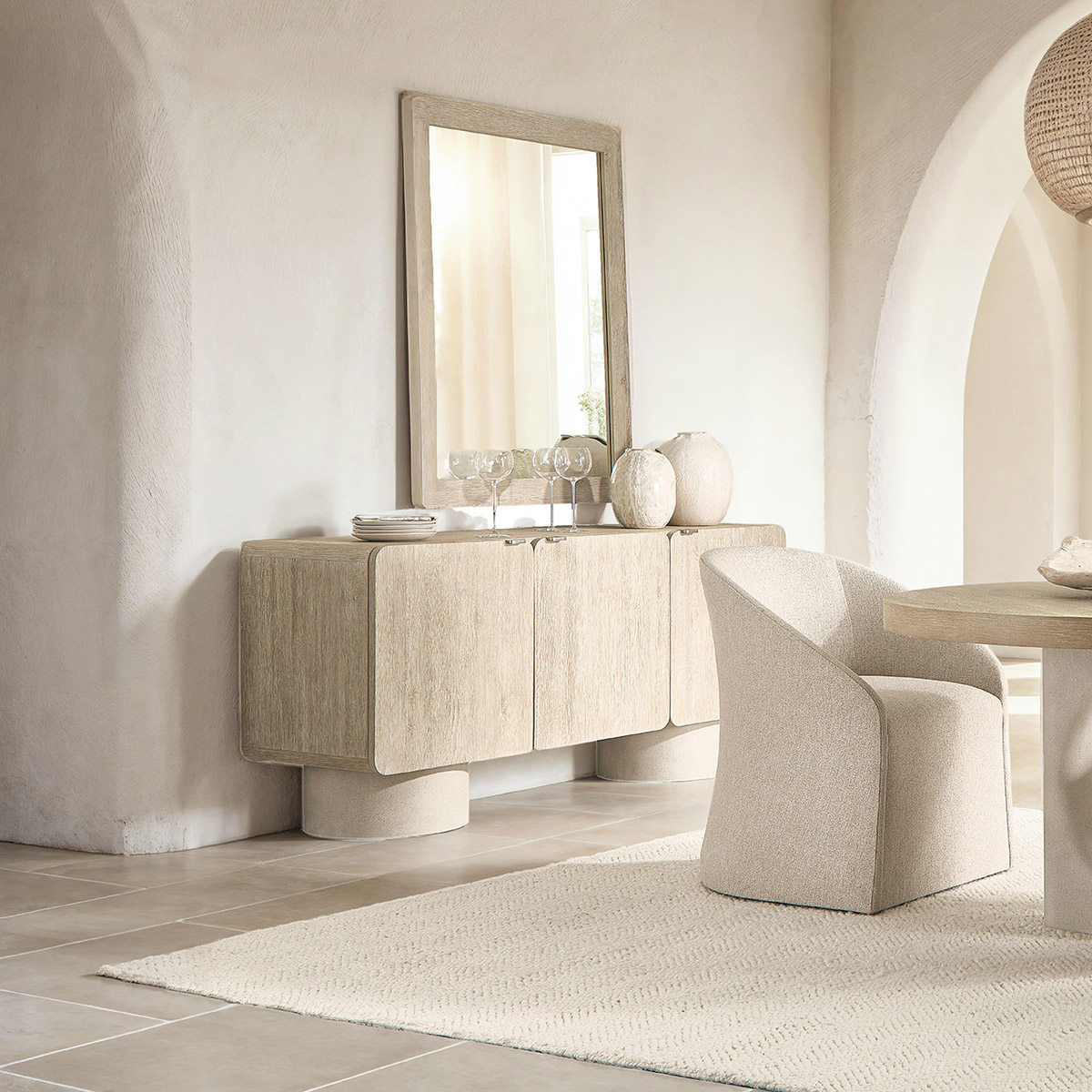 The antibes buffet takes an elemental approach to modern organic design. Two round pedestals are deeply textured in glass-reinforced concrete. They support the wooden case in a light roz finish, with three pull-to-open doors that have cast aluminum tab pulls. Interior storage includes adjustable shelves and one drawer.