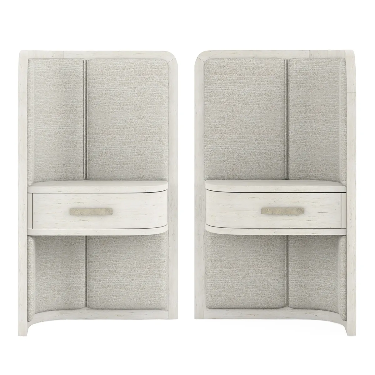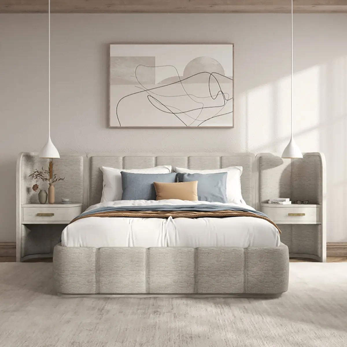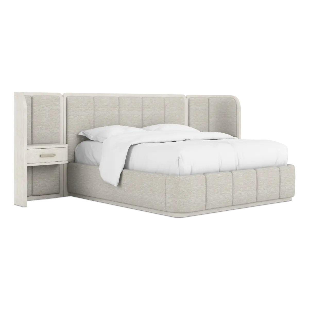 The Ashlar Complete King Bedroom Set by A.R.T. Furniture blends modern craftsmanship with timeless texture and warmth. The bed features a fully upholstered frame in a soft ecru-toned polyester fabric with elegant vertical channeling on the headboard and footboard. A refined dragged-paint finish enhances the wooden frame and inset plinth base, giving it a sophisticated, handcrafted appeal. Integrated end panels on the headboard include floating drawers with sleek metal hardware and a 3-way touch dimmer light for convenient functionality.