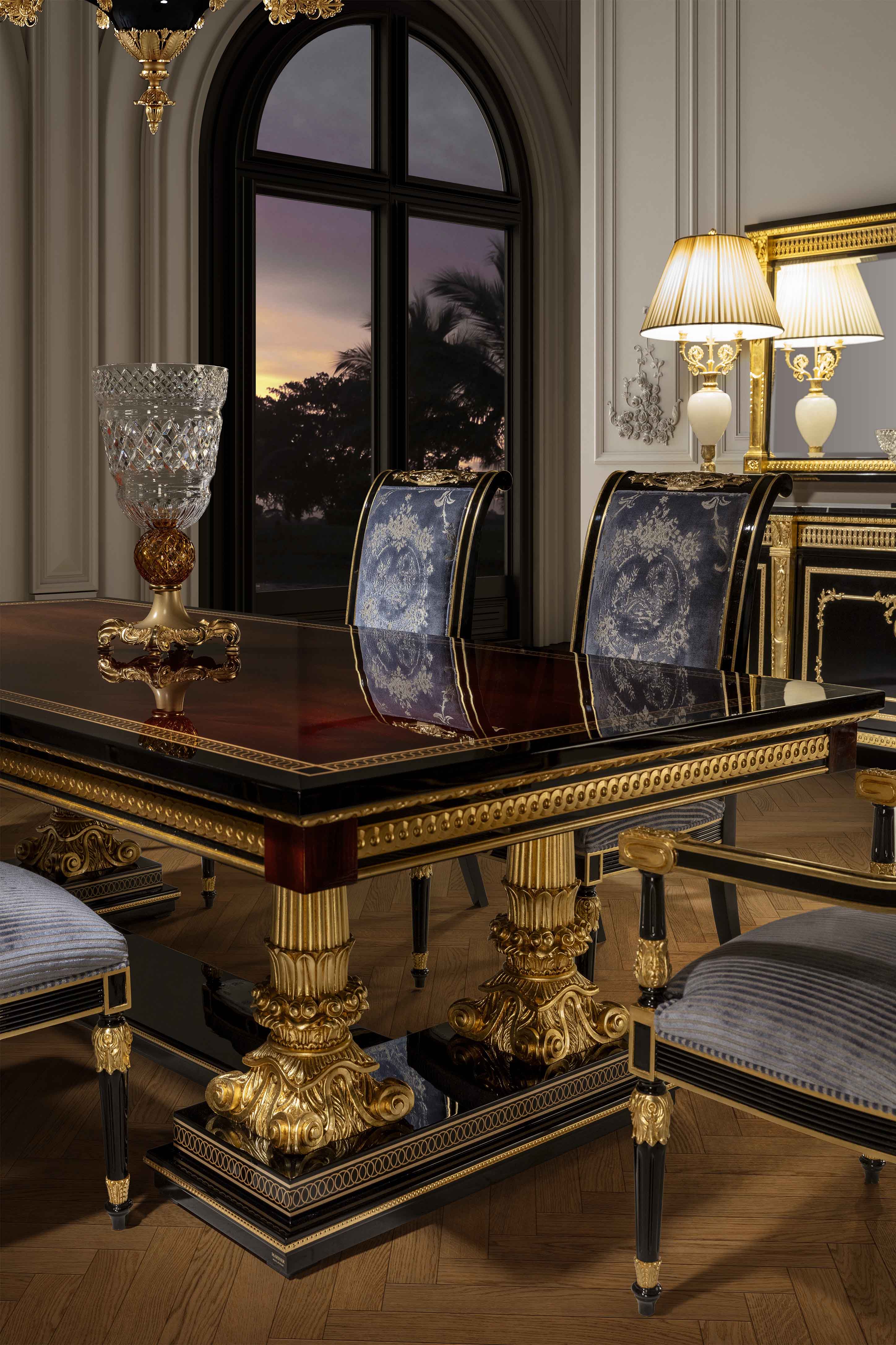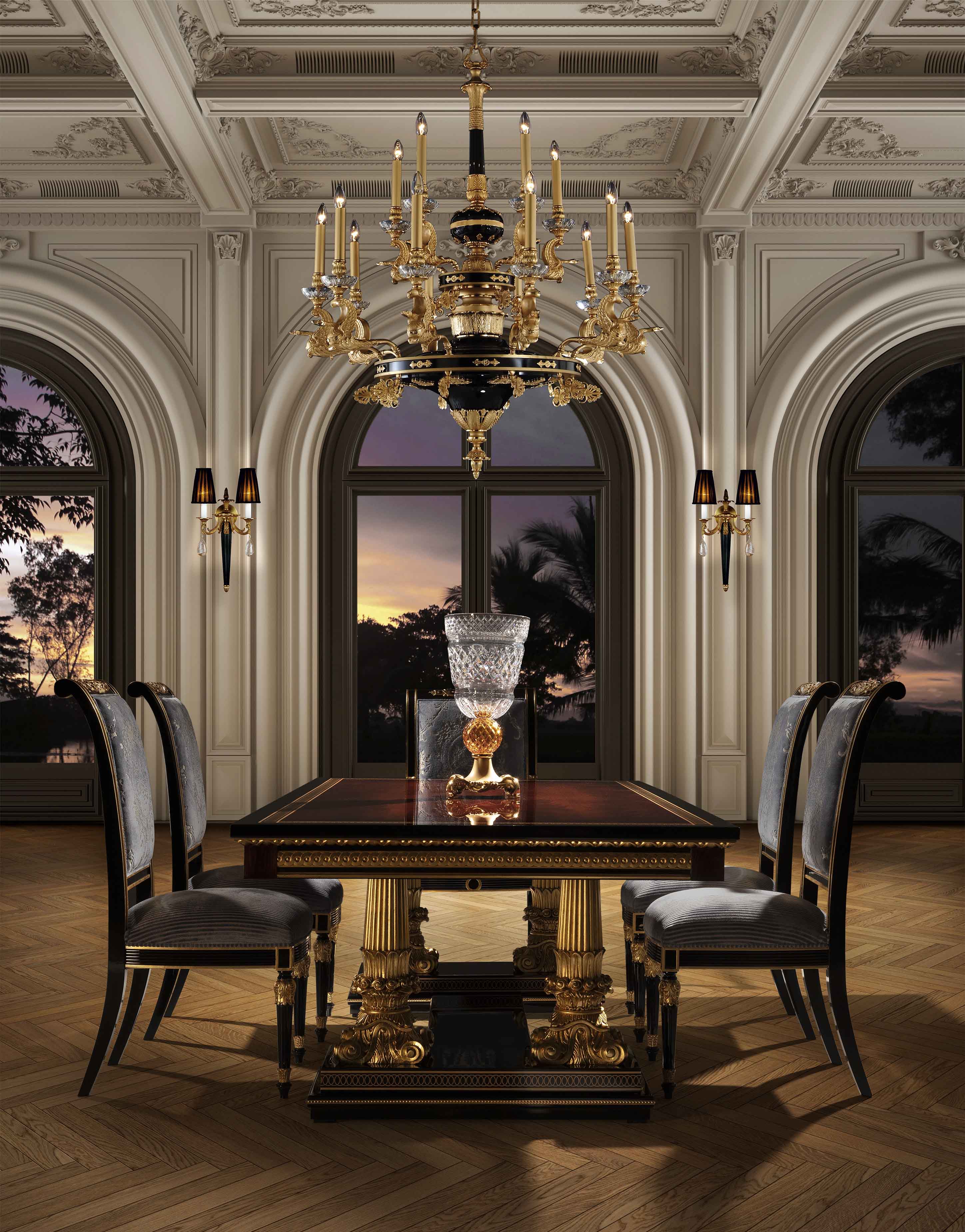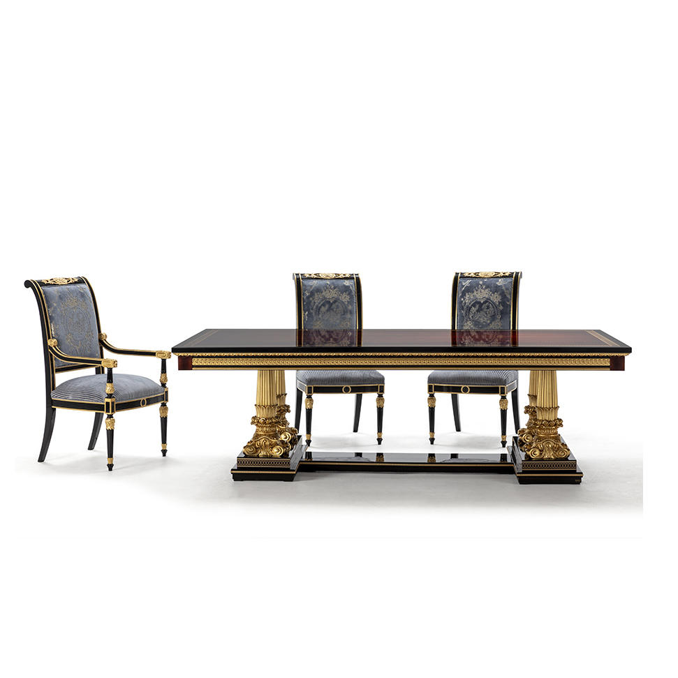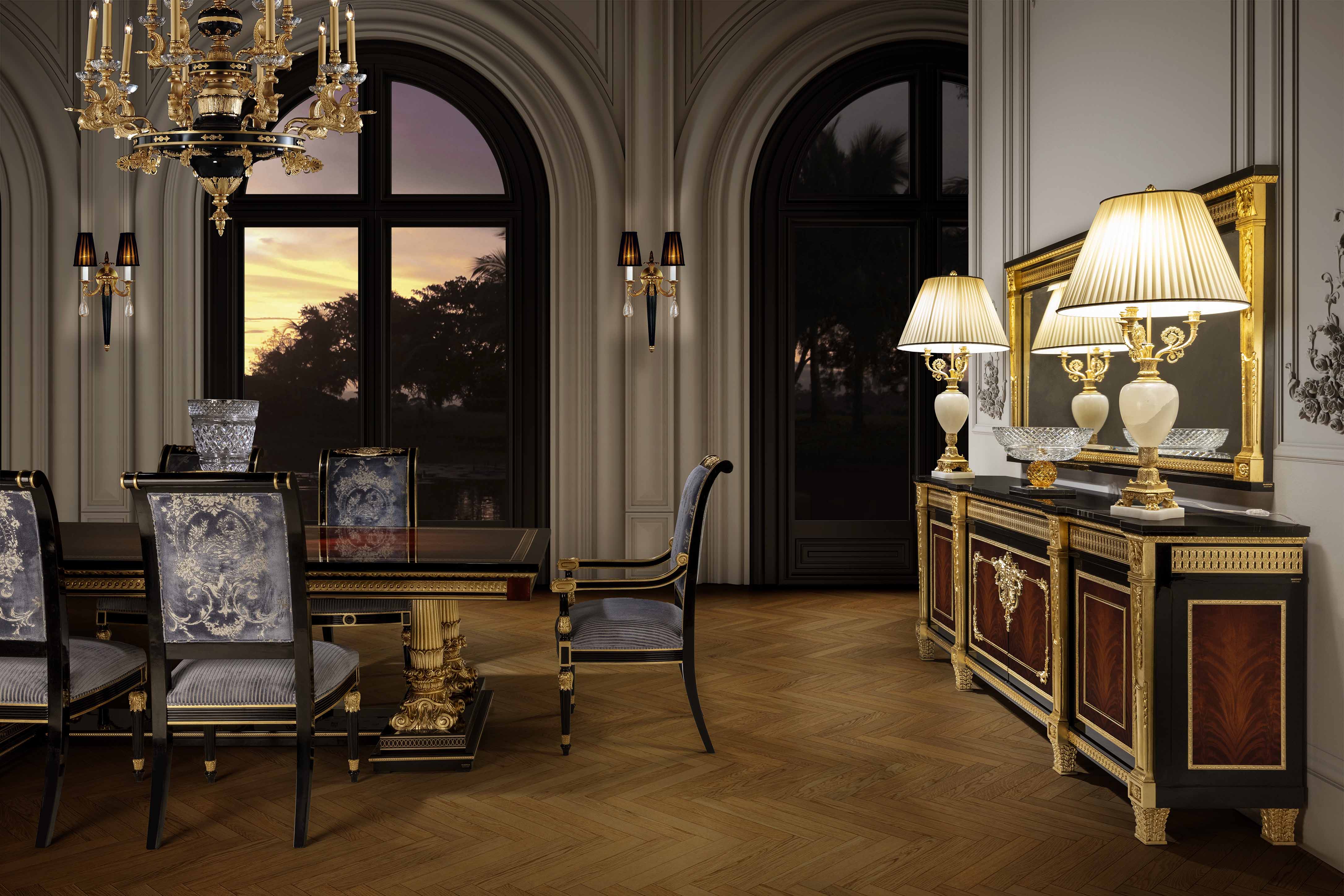 The Mariner Luxury Athens Dining Table is a high-end, classic-style piece from the Athens collection, manufactured in Spain. It features a combination of walnut wood, black finishes, and decorative bronze elements. Materials: Wood and Bronzes. Features: The furniture is typically fire-stamped and comes with a certificate of authenticity. Features: The furniture is typically fire-stamped and comes with a certificate of authenticity. Chair: It is characterized by its use of premium materials, including wood, bronze, and upholstery. Sideboard: Materials: the noblest materials are used, including selected veneers and woods, and patinated bronzes.