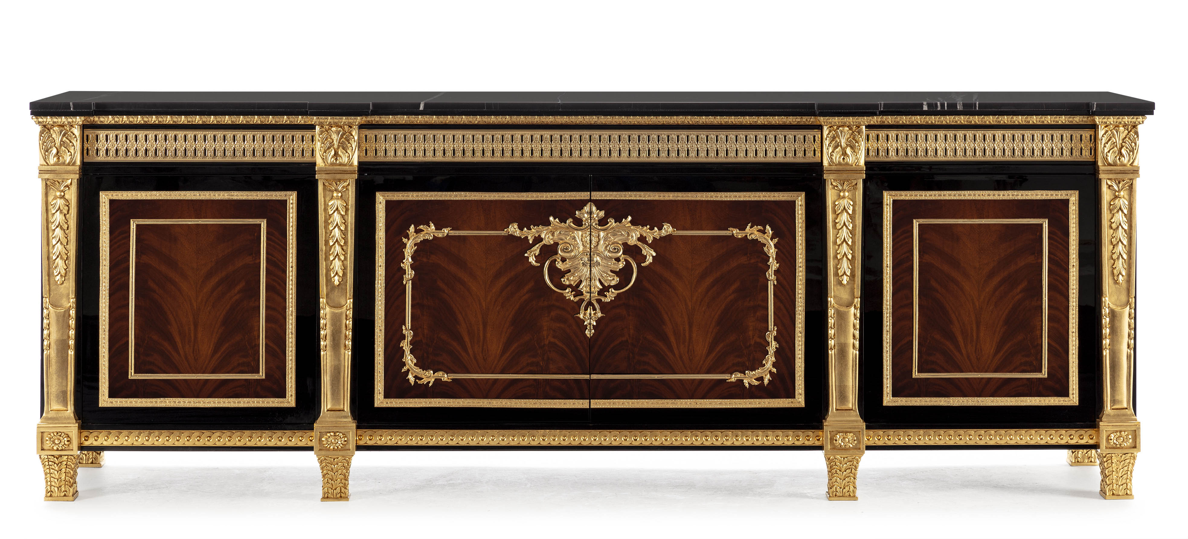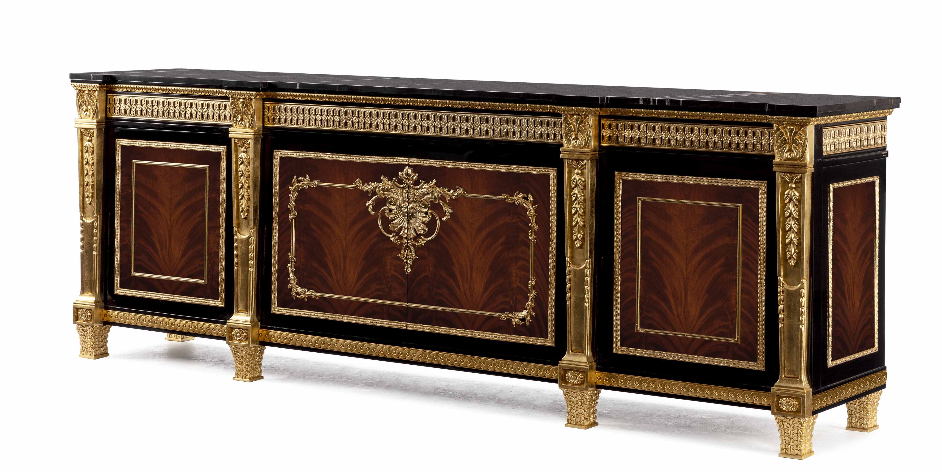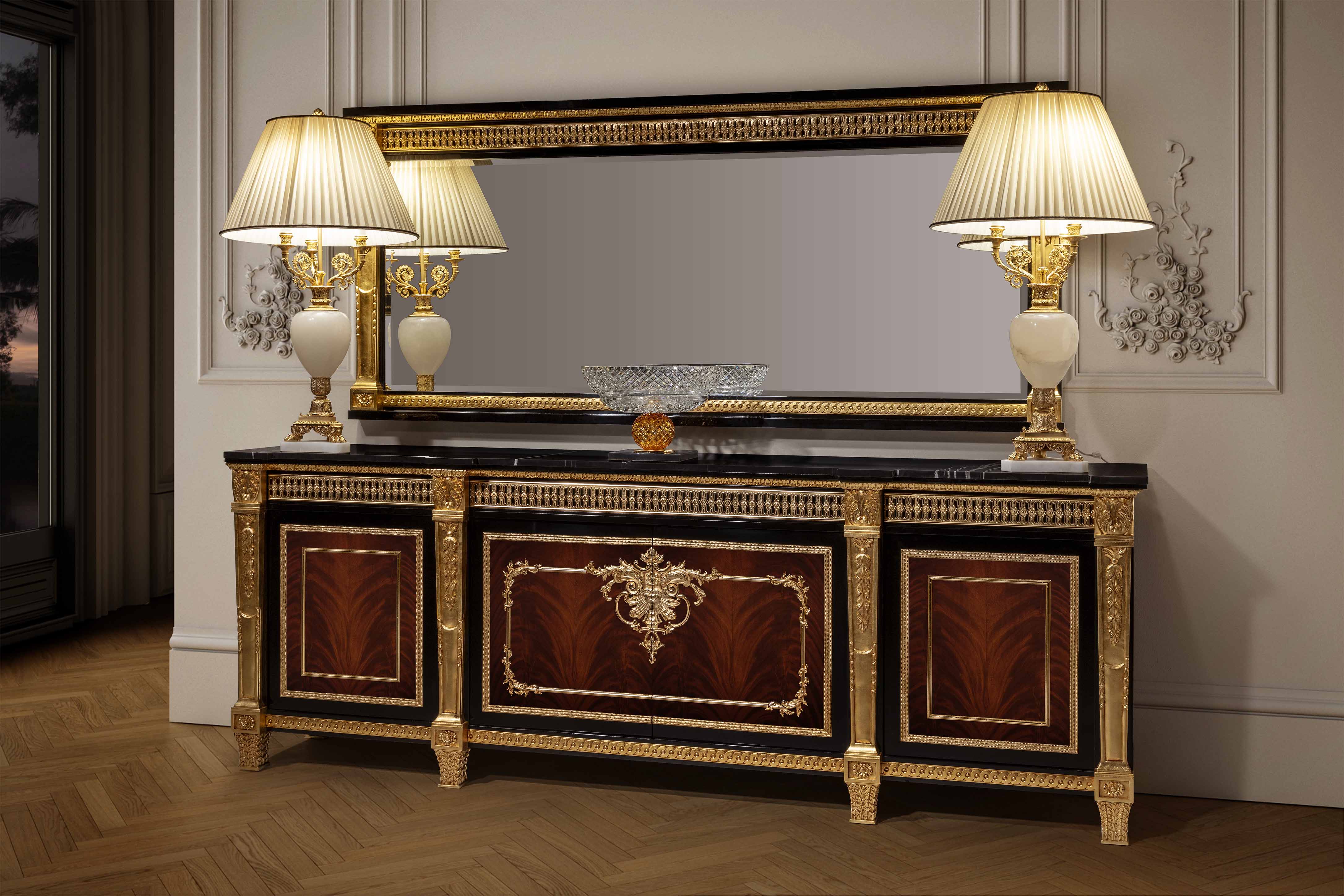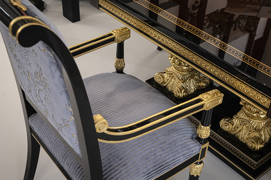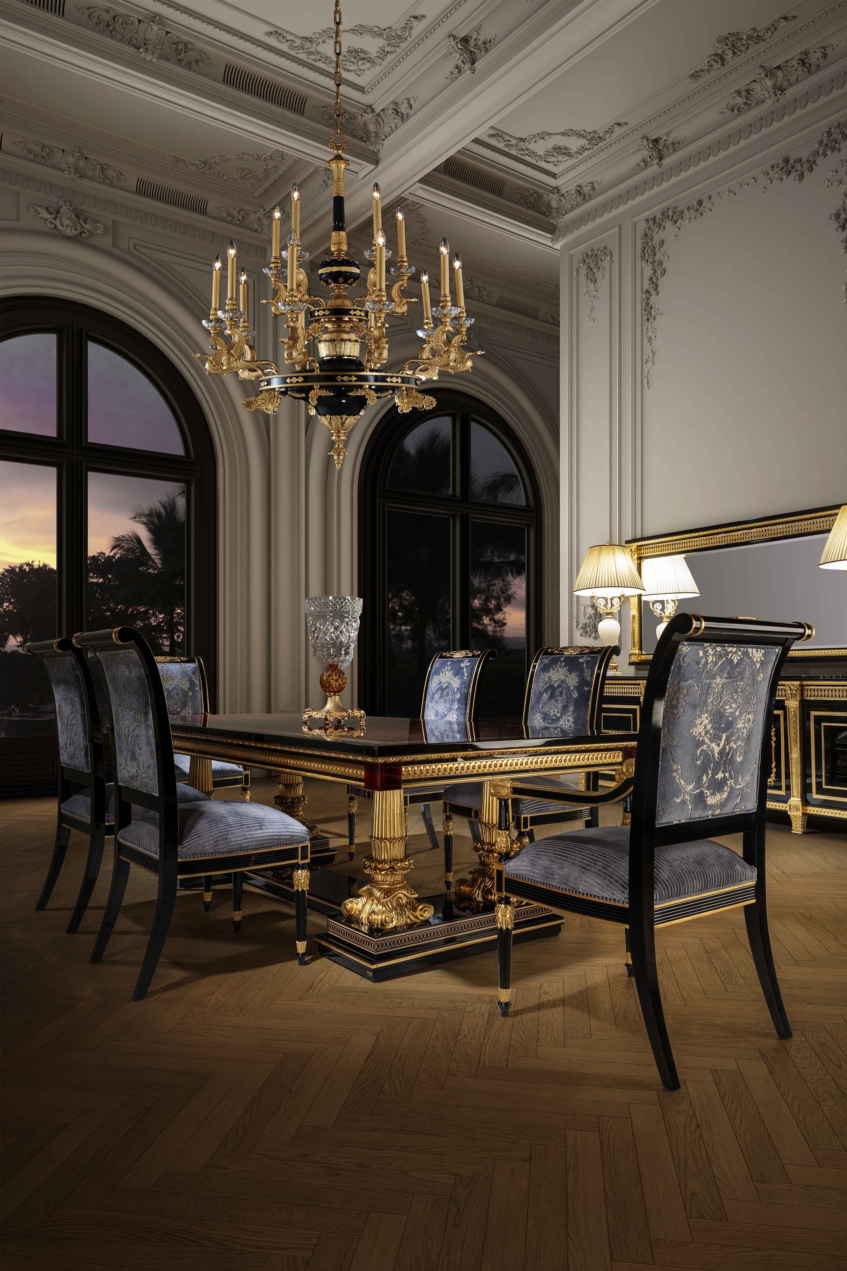 The Mariner Luxury Athens Dining Table is a high-end, classic-style piece from the Athens collection, manufactured in Spain. It features a combination of walnut wood, black finishes, and decorative bronze elements. Materials: Wood and Bronzes. Features: The furniture is typically fire-stamped and comes with a certificate of authenticity. Features: The furniture is typically fire-stamped and comes with a certificate of authenticity. Chair: It is characterized by its use of premium materials, including wood, bronze, and upholstery. Sideboard: Materials: the noblest materials are used, including selected veneers and woods, and patinated bronzes.