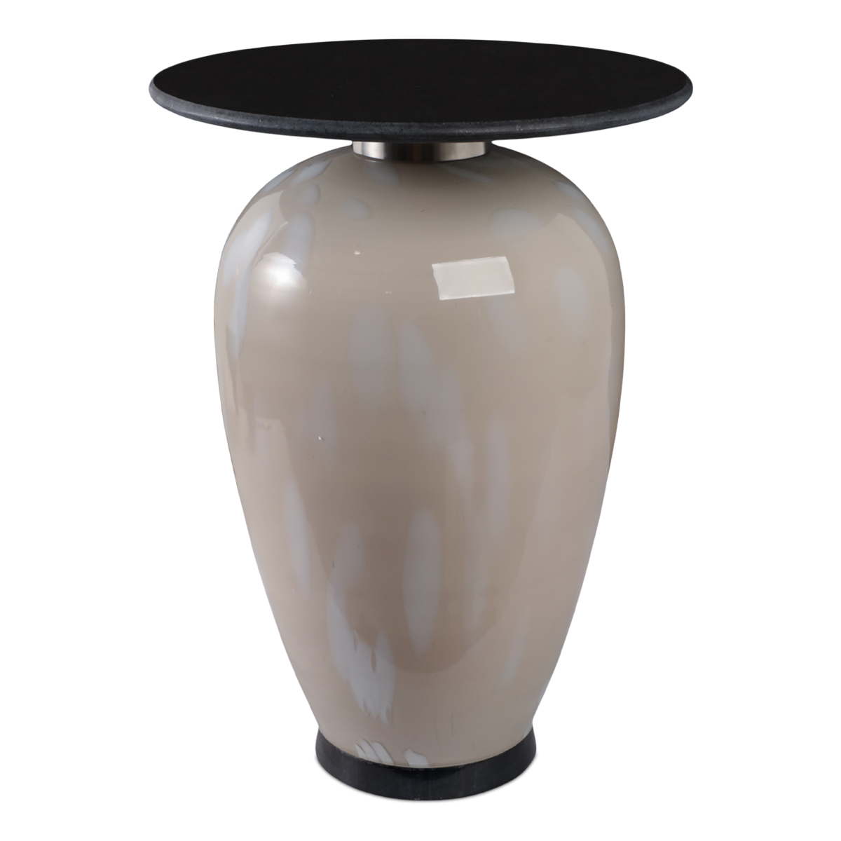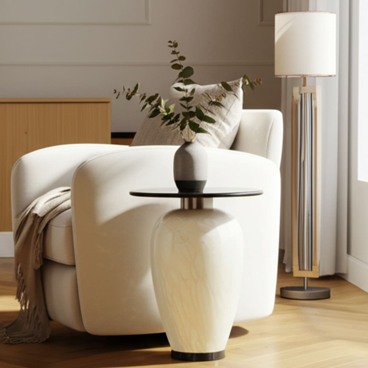 The Bahia Tall Art Table with Marble Top combines a refined marble surface with a sculptural metal base, functioning as both furniture and artistic décor.