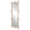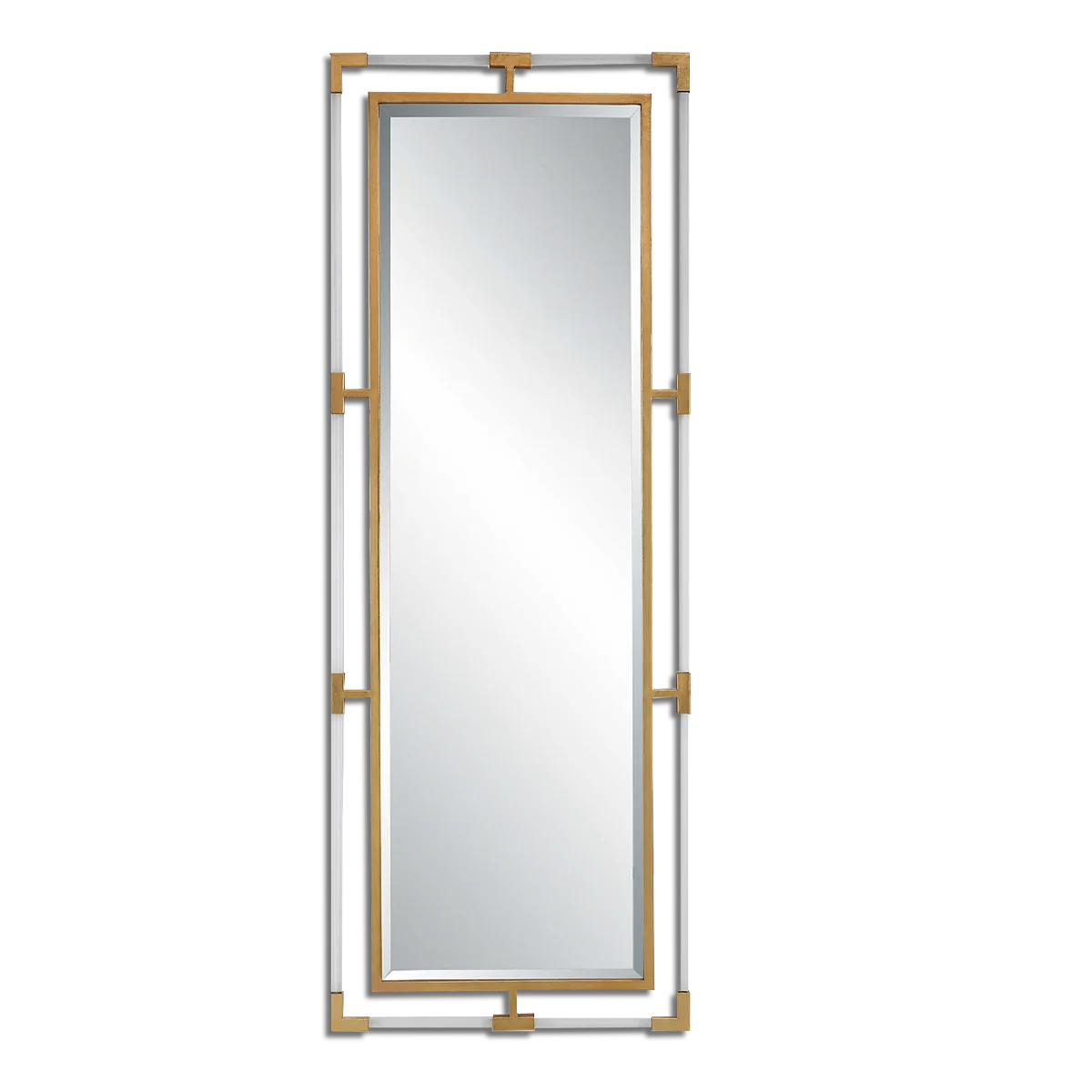 The Balkan Tall mirror features forged iron finished in a metallic gold leaf with suspended, clear acrylic solid bars creating a modern feel. Mirror has a generous 1 1/4" bevel and may be hung horizontal or vertical.