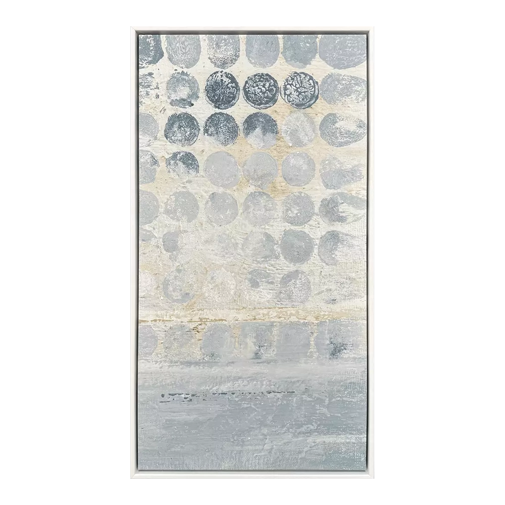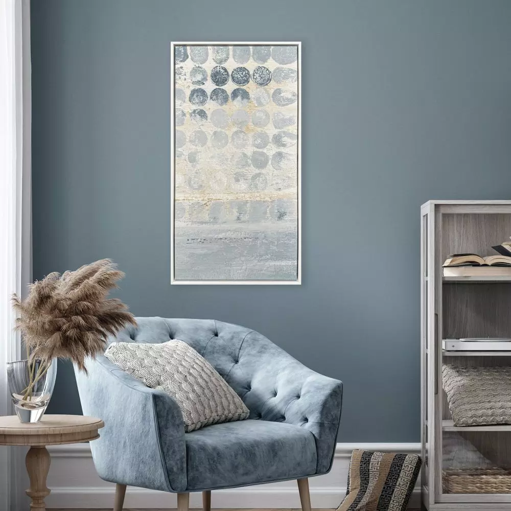 A cluster of blue dots forms a compelling geometric arrangement in a modern art display. Canvas is mounted in a matte white wood floater frame.