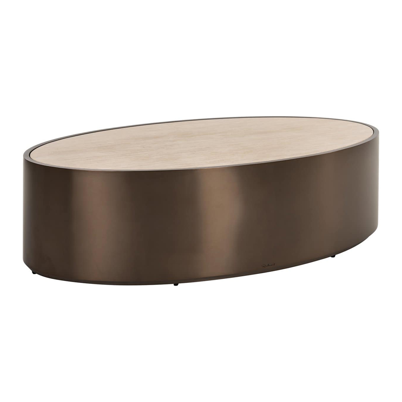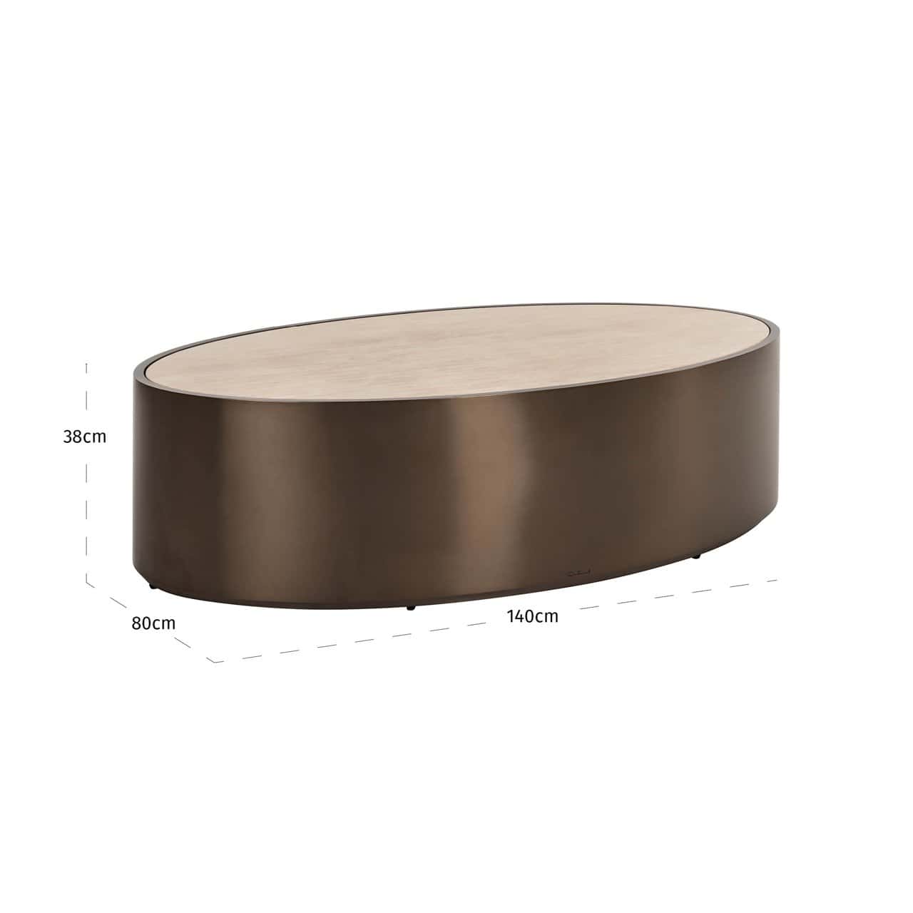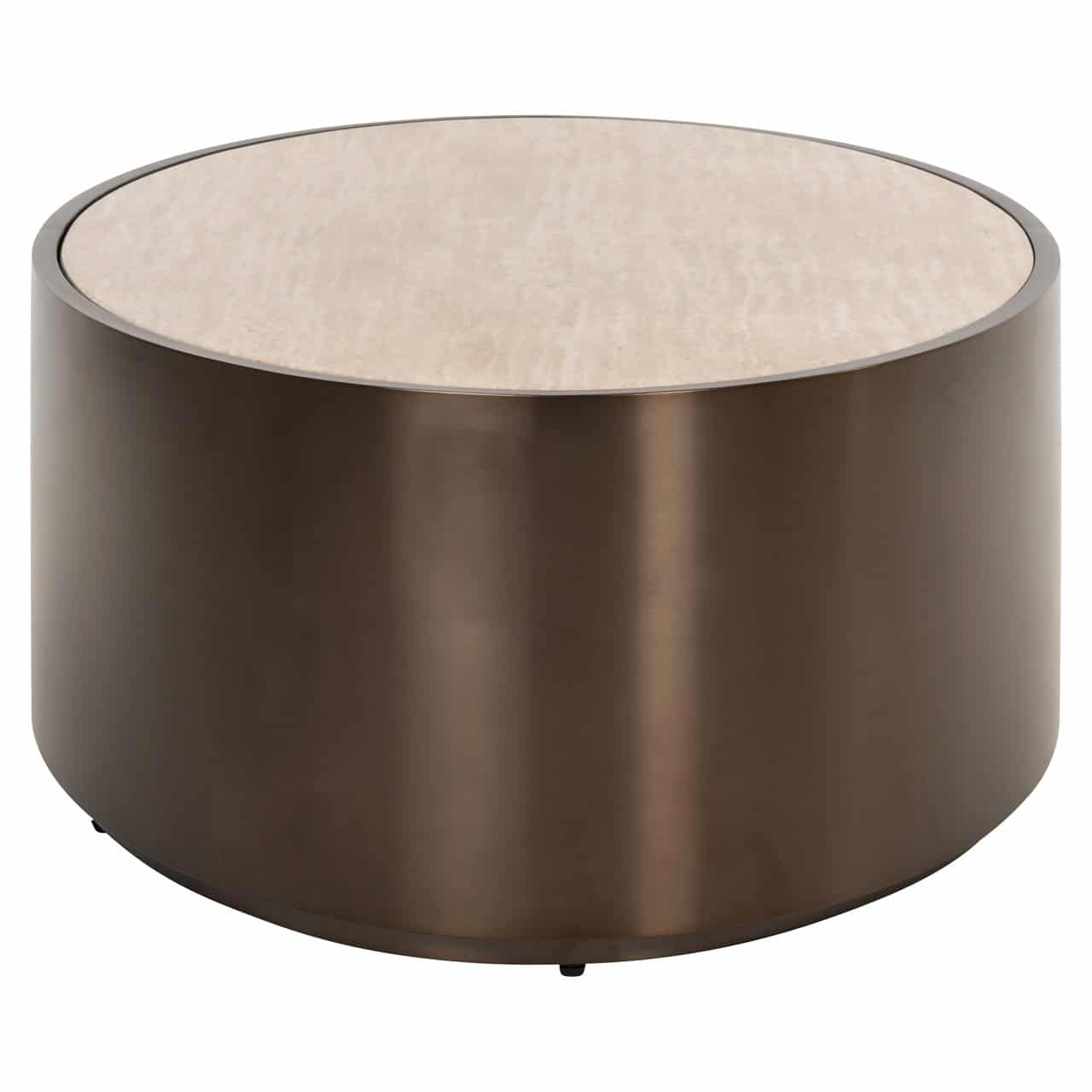 The Bonanza coffee table Bonanza an elegant round coffee table with a luxurious faux marble top and a bronze-colored stainless steel base. The combination of the refined marble-look surface and the warm metallic base gives this table a chic look that fits perfectly in a modern or hotel chic interior. A real eye-catcher for the sitting area.