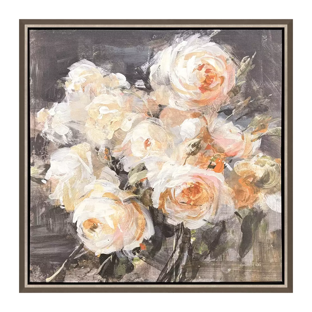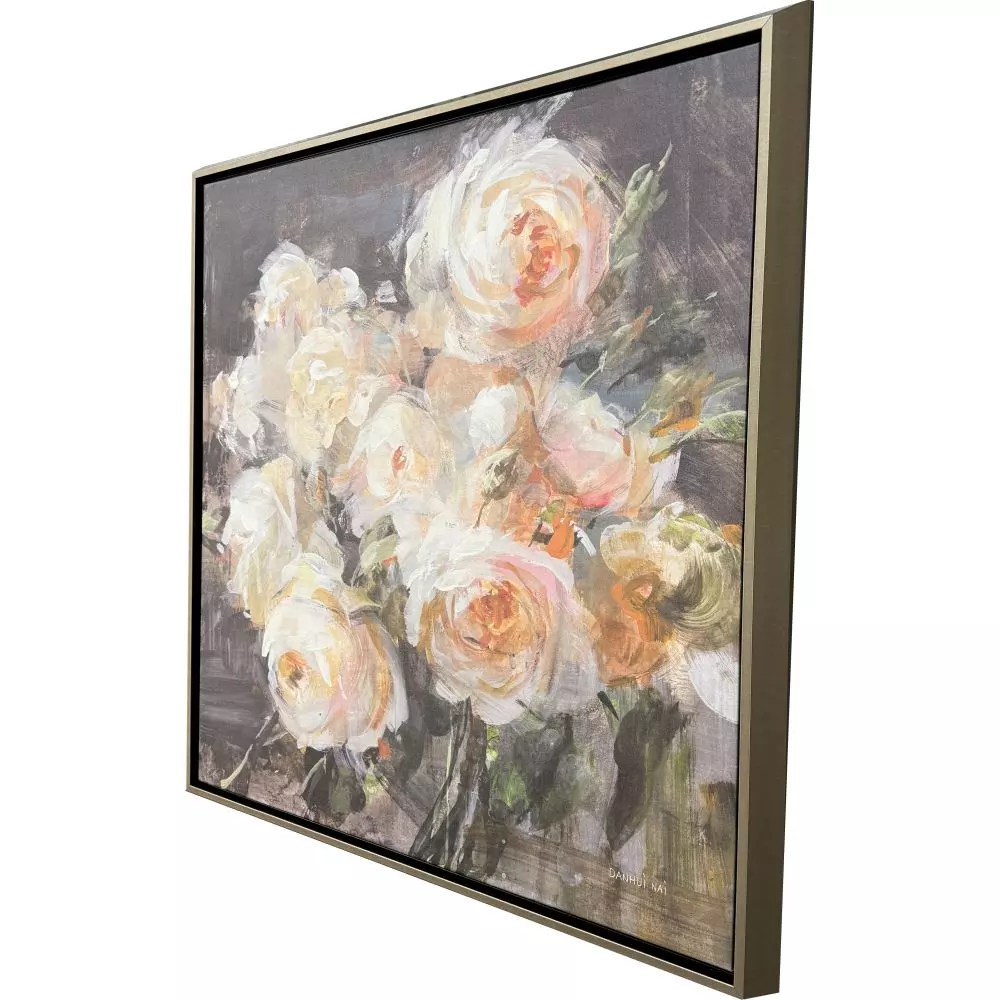 A gorgeous bouquet of roses adds a subtle touch of elegance and sophistication. Canvas is mounted in a champagne gold finish floater frame.