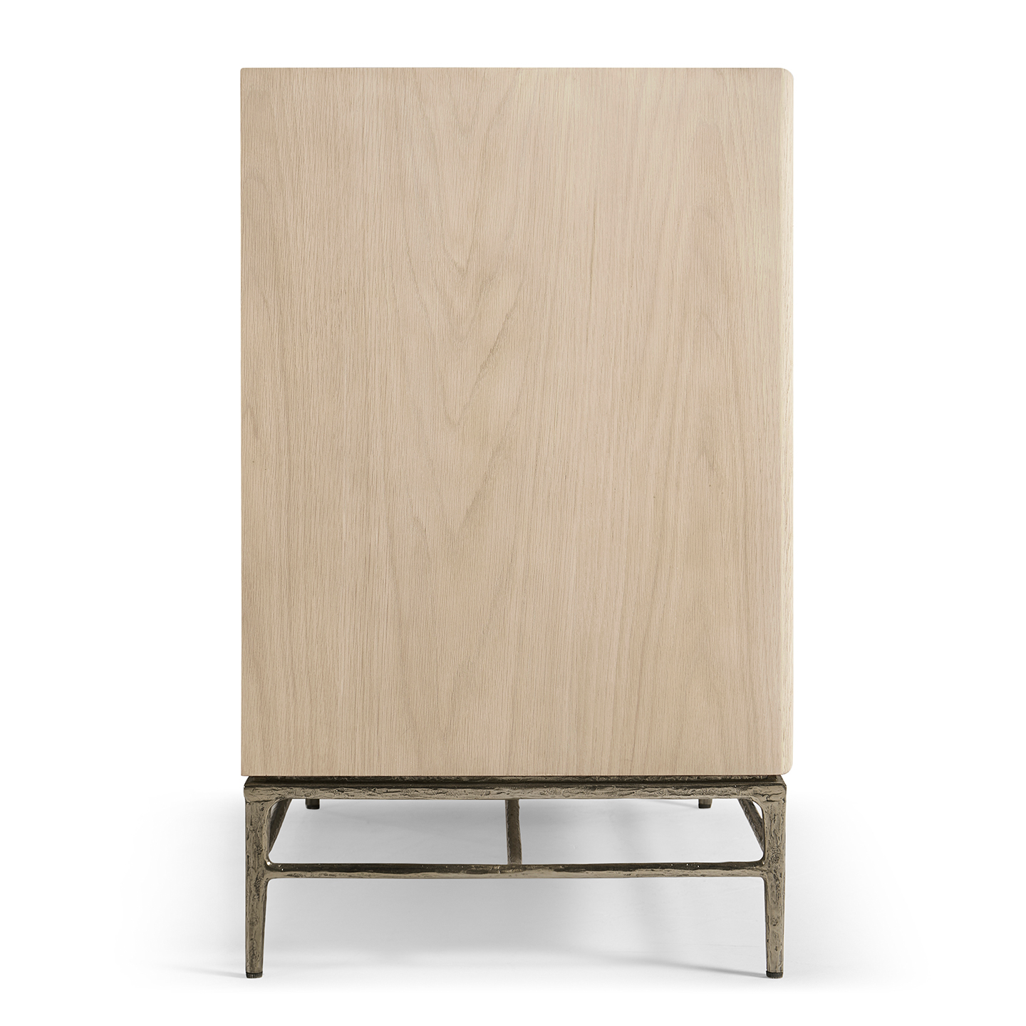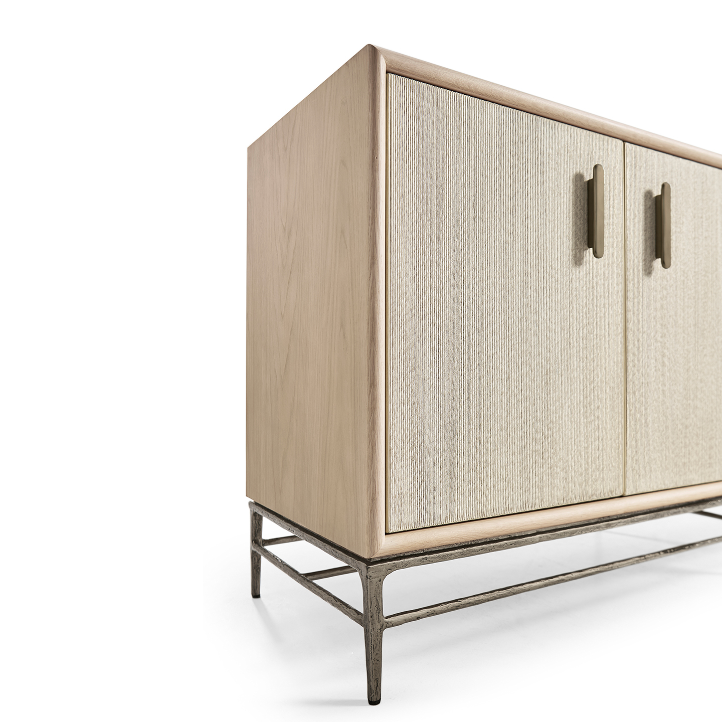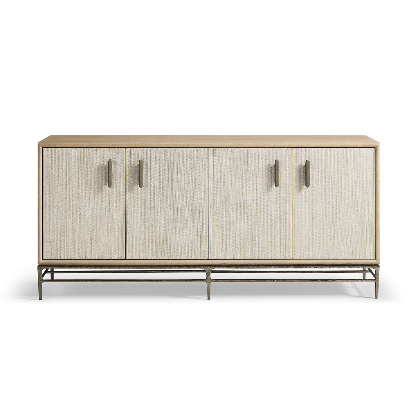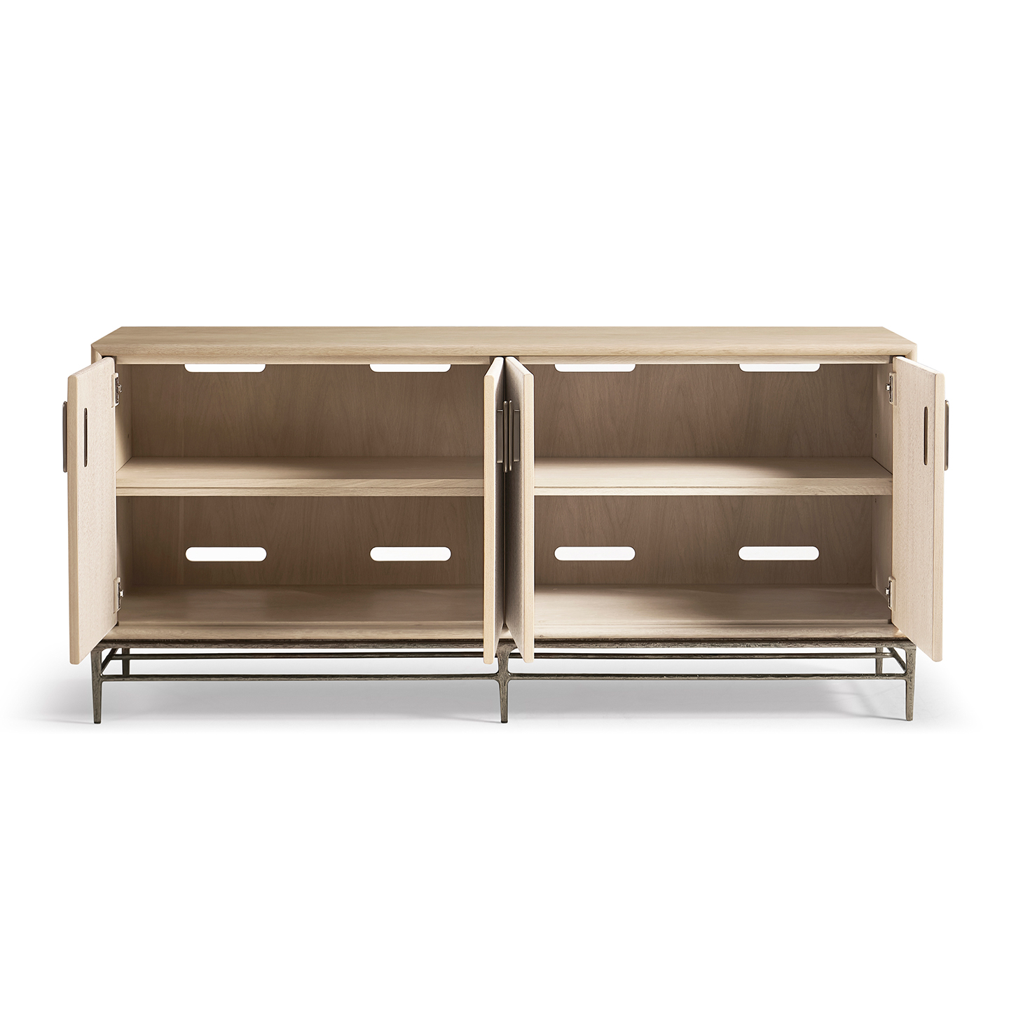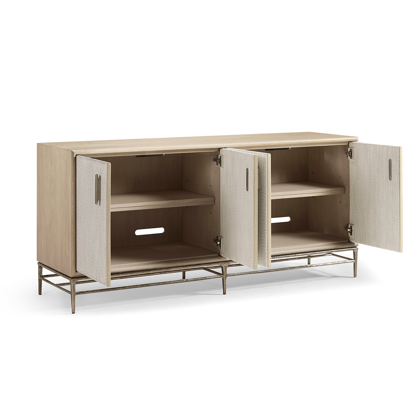The Clapotis Entertainment Console balances refined craftsmanship with understated modern design. Its clean-lined case is finished in a soft, light-toned veneer, while the four doors are wrapped in Danish cord, introducing a tactile, organic texture. Cast aluminum legs with a softly hammered surface elevate the piece and create an airy, architectural base. Vertical metal pulls complement the linear geometry, opening to reveal spacious interior storage with adjustable shelving for media components and household accessories. The result is a sophisticated, versatile console that blends artisanal detailing with contemporary ease.