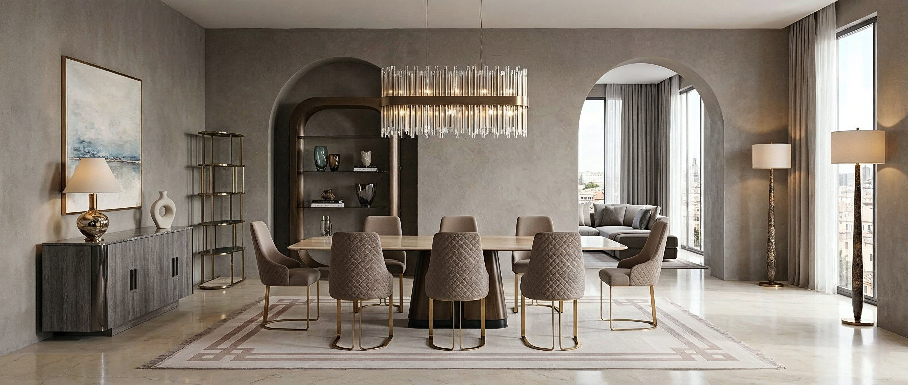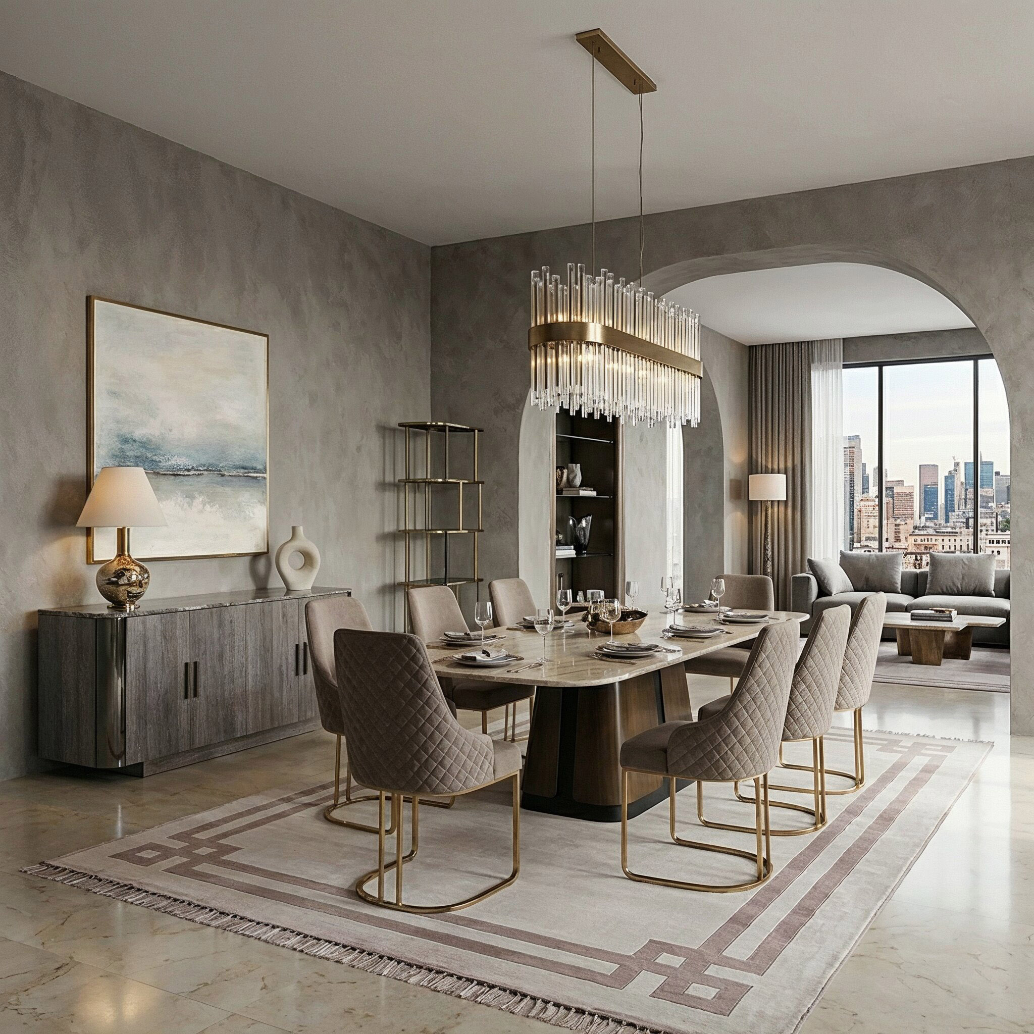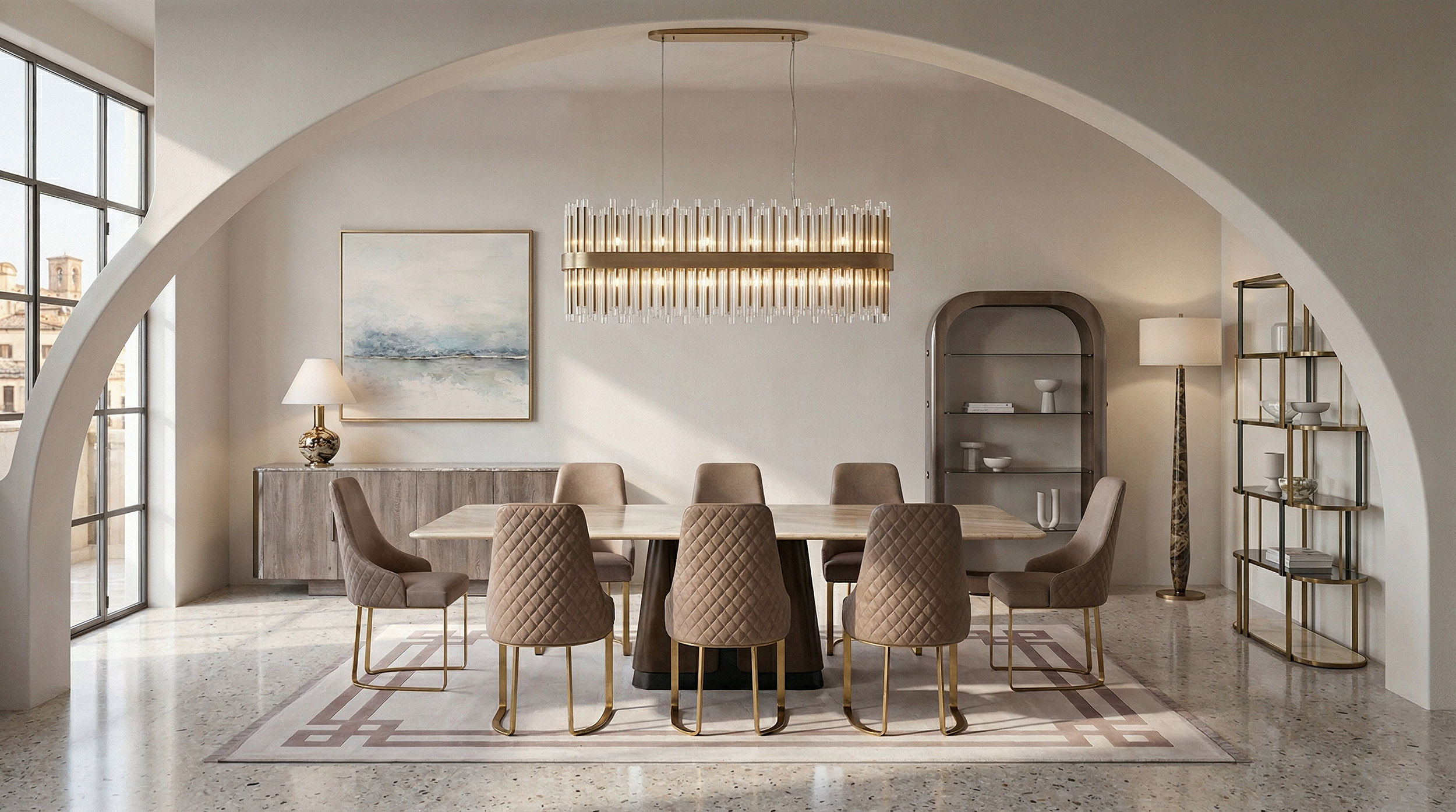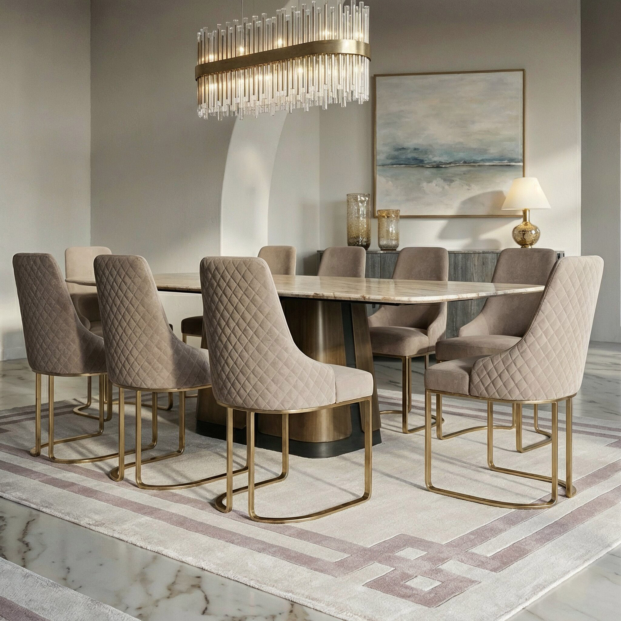 The Compass Dining Table redefines contemporary luxury through its tapered black base framed by radiant metallic accents that reflect light beautifully. The slender marble top is finished with softly rounded edges, hand-polished to achieve a smooth and refined touch, creating a harmonious blend of sculptural geometry and noble materials ideal for elegant modern interiors.