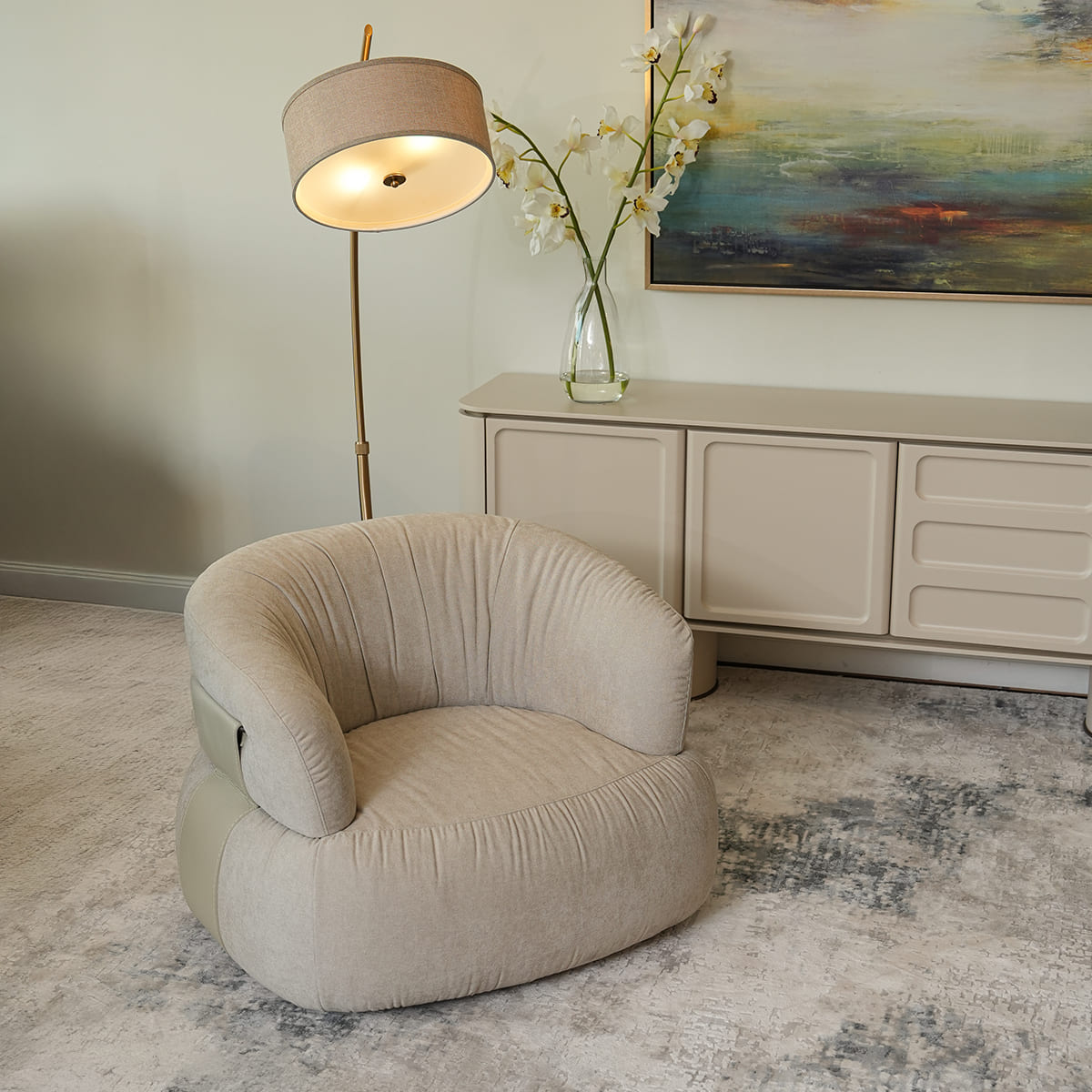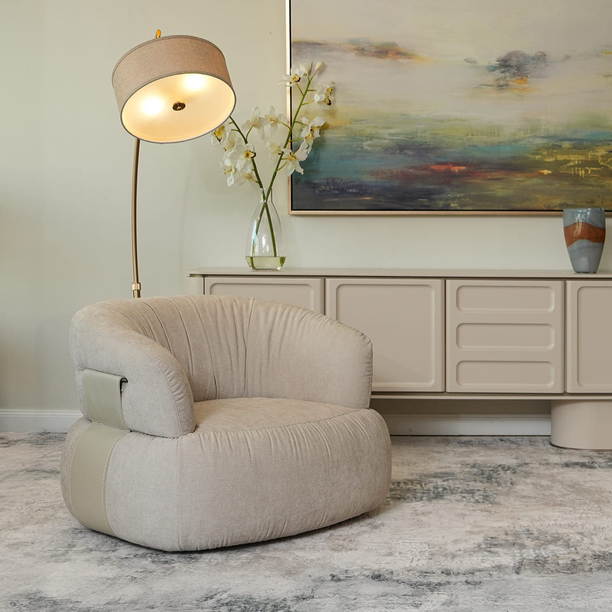 Generous and soft volumes for the dana armchair that combines the refinement of craftsmanship with extreme comfort. This armchair is characterized by a solid structure and generous round lines, as well as the details of the refined leather bands, sewn on both sides, connecting the seat to the backrest.
