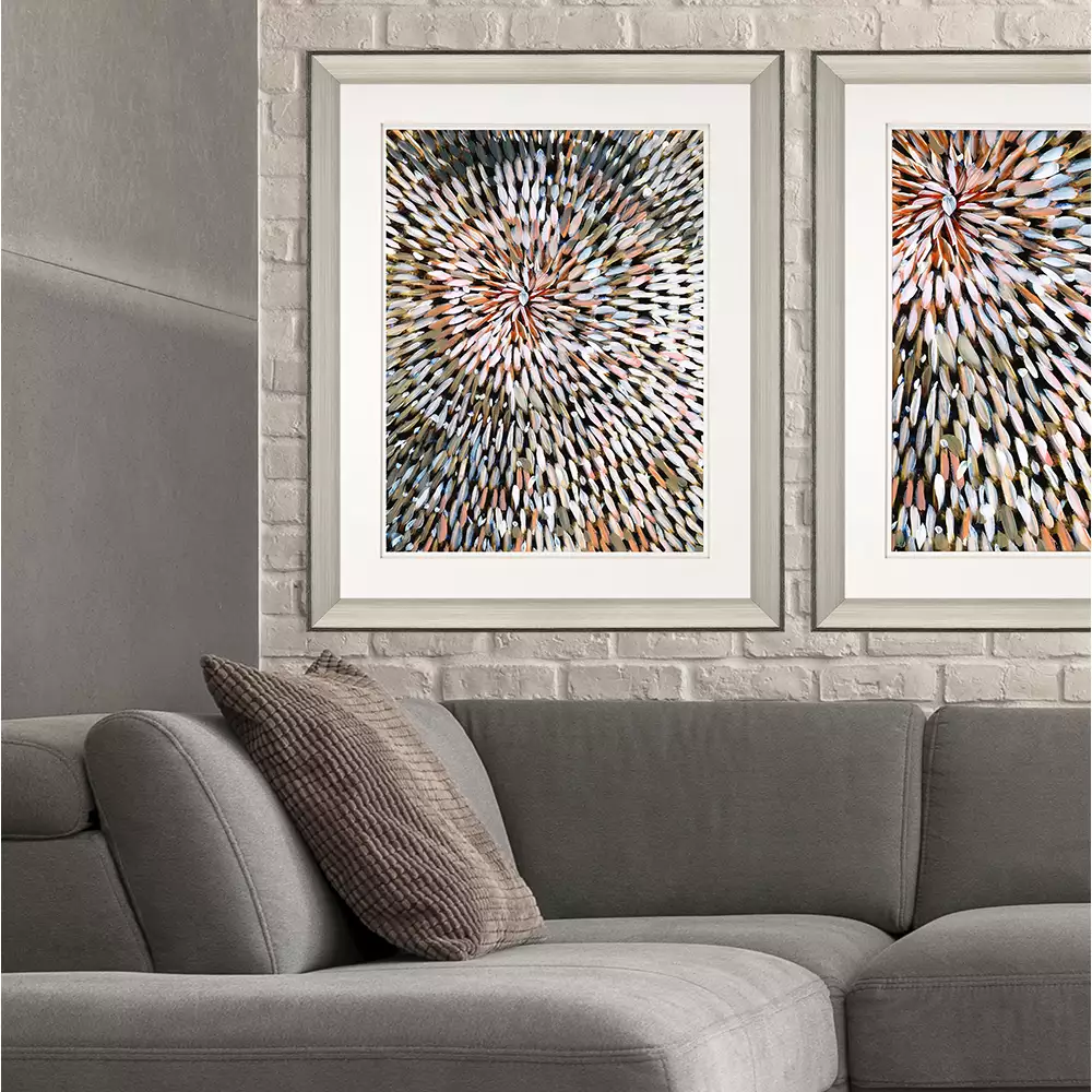 Fractal abstract designs are double matted in white with raised matting. Framed in a modern silver finish molding with black accents.