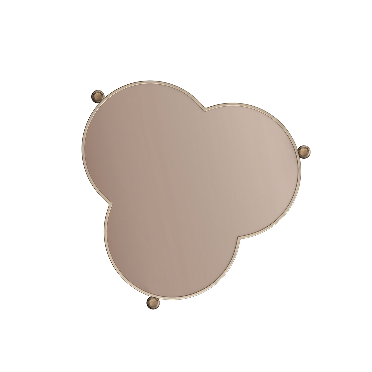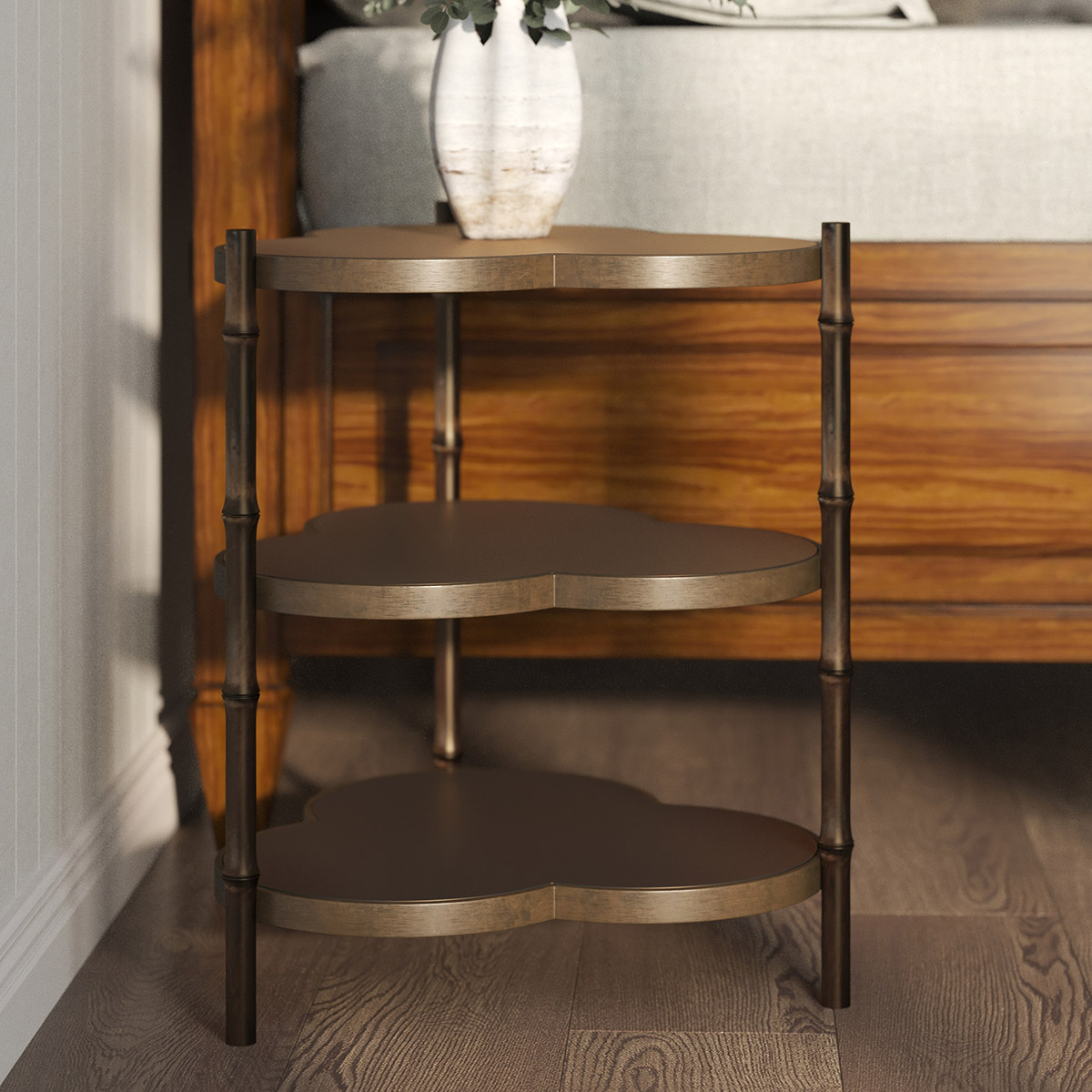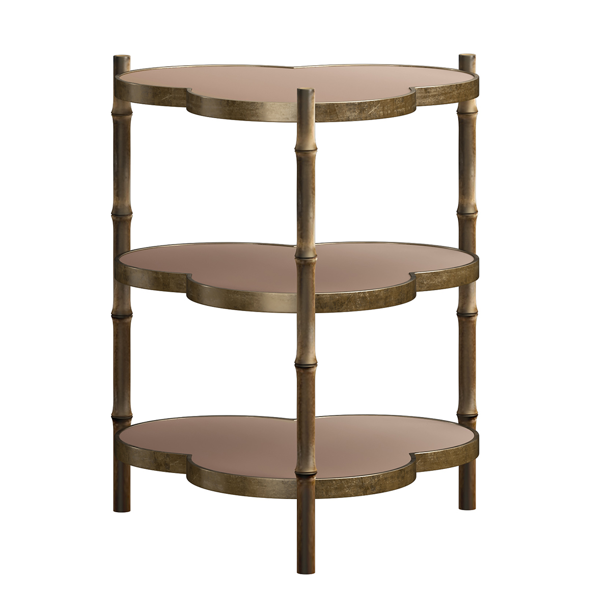 New Traditional Accent Table with Trefoil three trefoil shaped levels, each banded in Burnished Gold Finished Metal and inset with Bronze Frosted Glass. Materials: Poplar and Parawood Solids,Walnut Veneer
