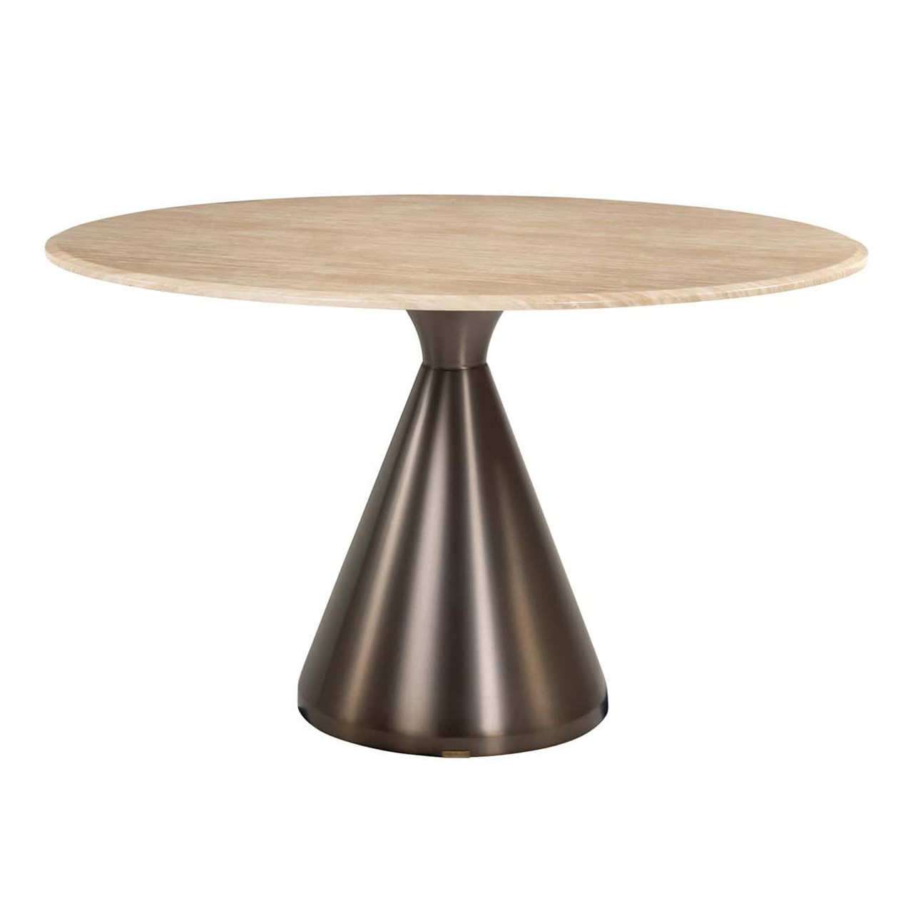 Montgommery Dining Table is a stylish round table that exudes a luxurious presence with its elegant faux marble tabletop and bronze stainless steel base. This refined combination of materials creates a chic, modern aesthetic perfectly suited for sophisticated hotel-chic interiors. Its compact proportions make it ideal for smaller spaces, offering both functionality and visual impact without compromising on elegance.