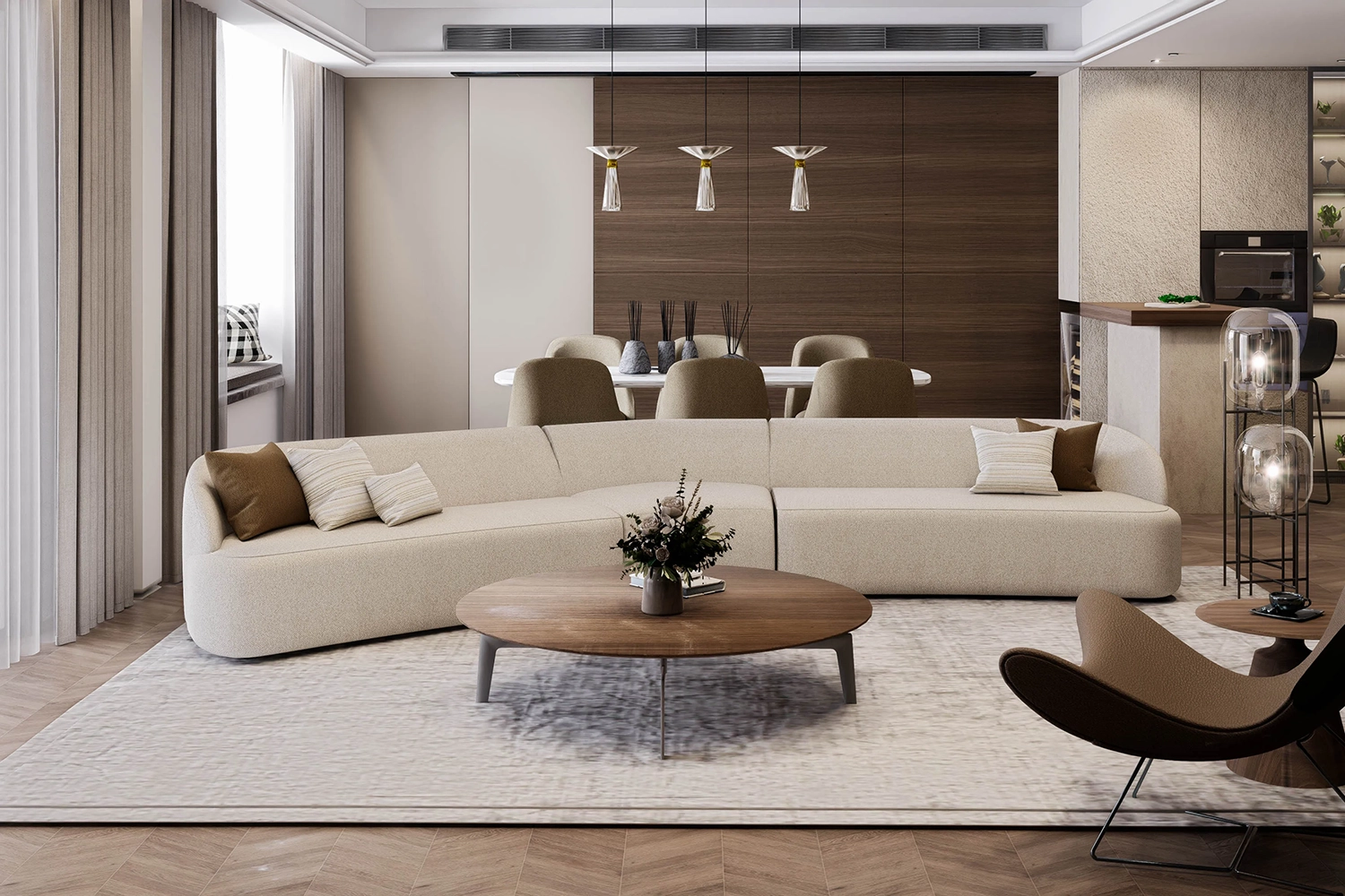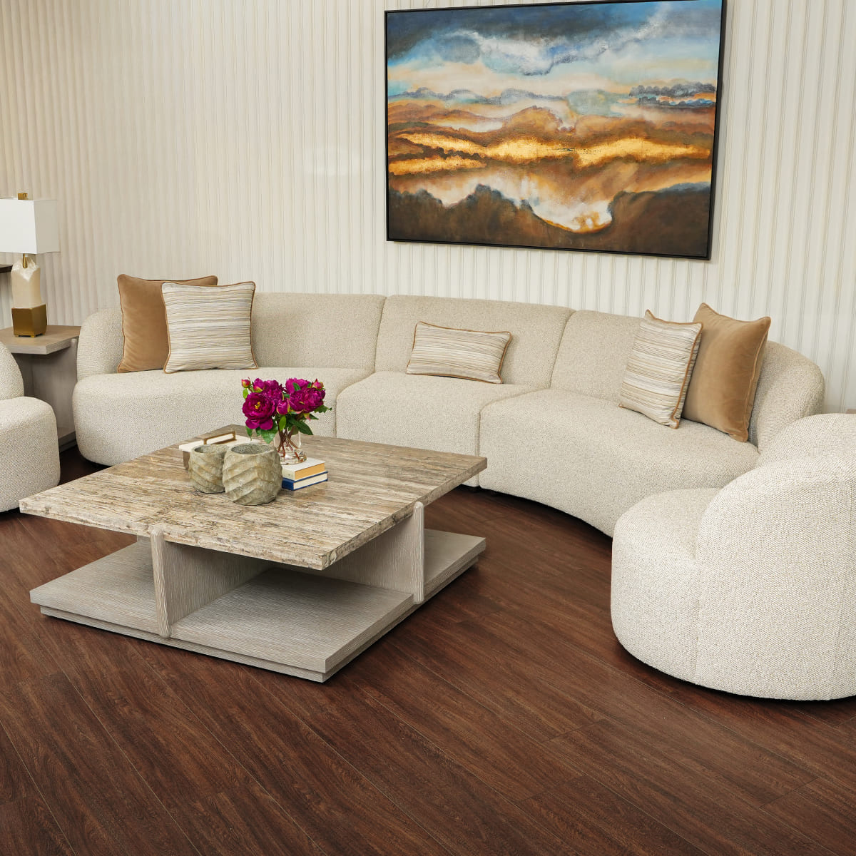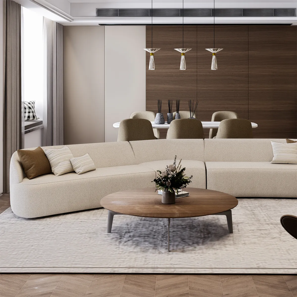 Sinuous curves and luxurious upholstery give the Elle sofa a cloud-like softness. Inspired by a traditional kidney-shaped design, the encircling back sweeps around to create a sheltering effect. The seat flows to the floor, allowing just a peek at the four feet.