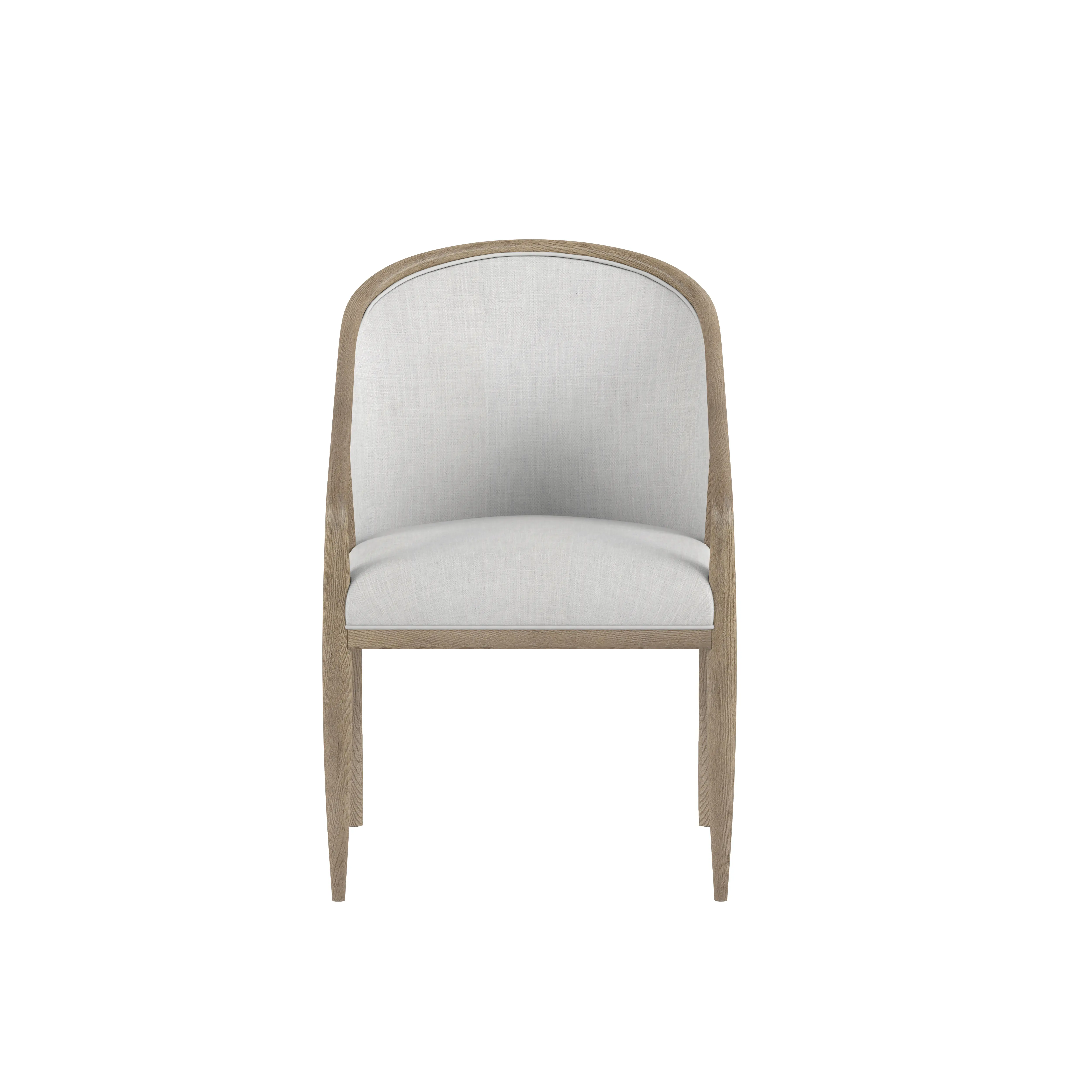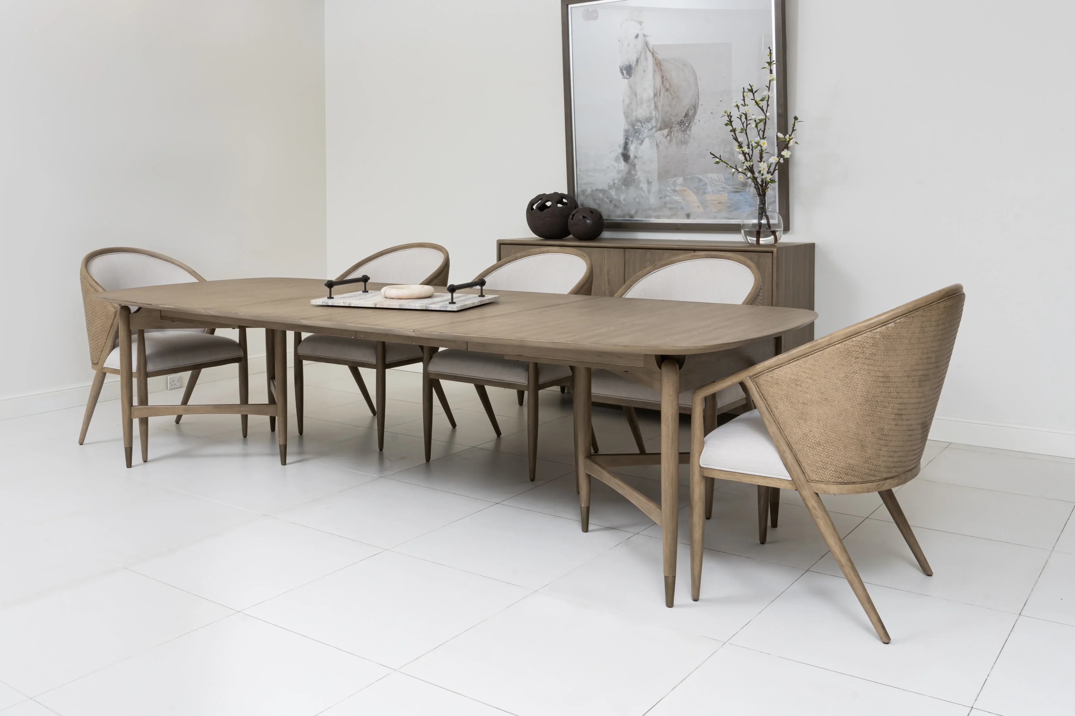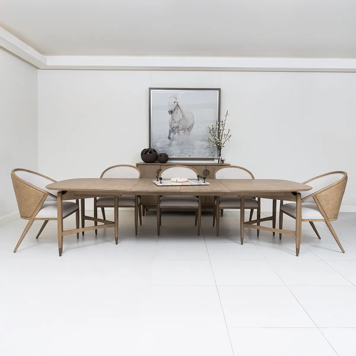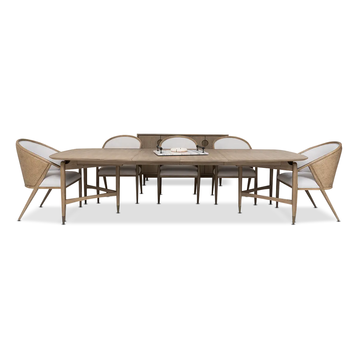 The Finn Rectangular Dining Table with Ten Side Chairs by A.R.T. Furniture captures the essence of mid-century sophistication with a modern twist. Its striking angular base, softened by subtly arched supports and rounded tabletop corners, creates a sense of balance and harmony. Crafted from parawood solids and elm veneer, the table showcases a warm grey finish that highlights the natural grain. Dual pedestal legs with antique gold metal ferrules add a refined touch, while two 20-inch leaves extend the table to comfortably seat up to ten guests.