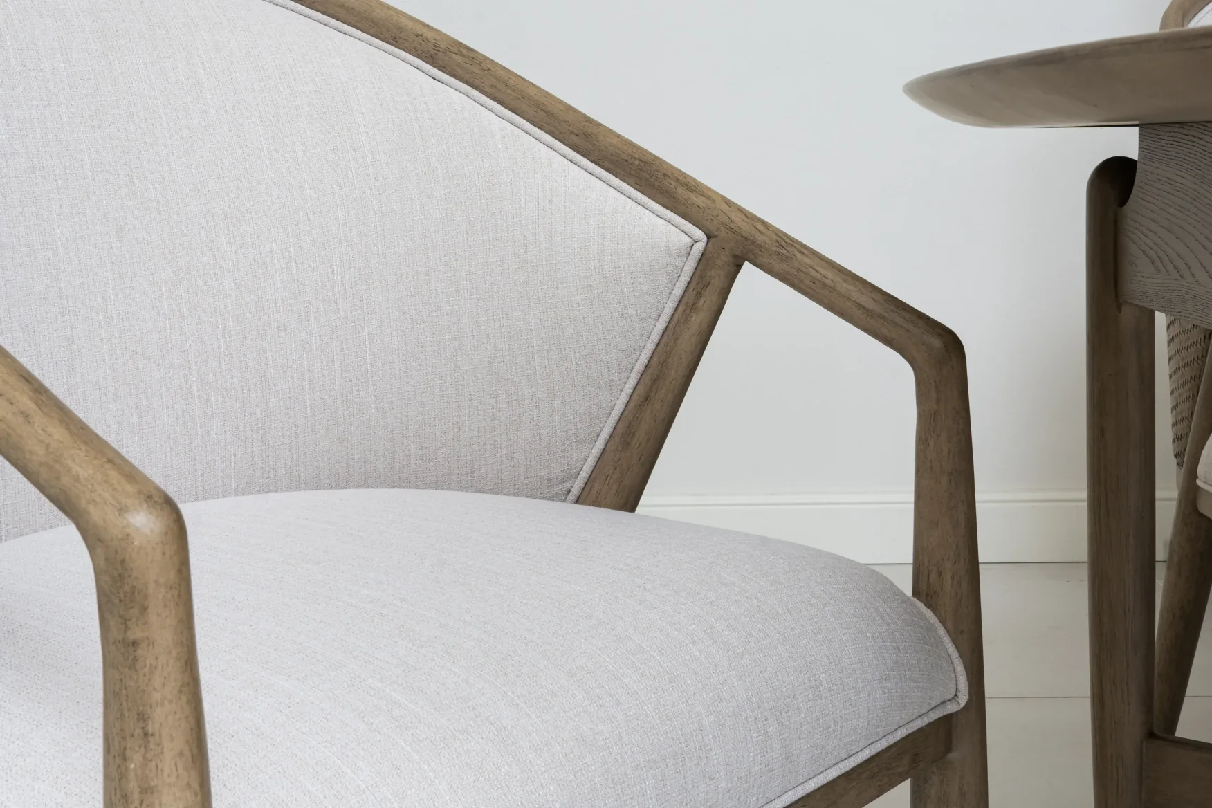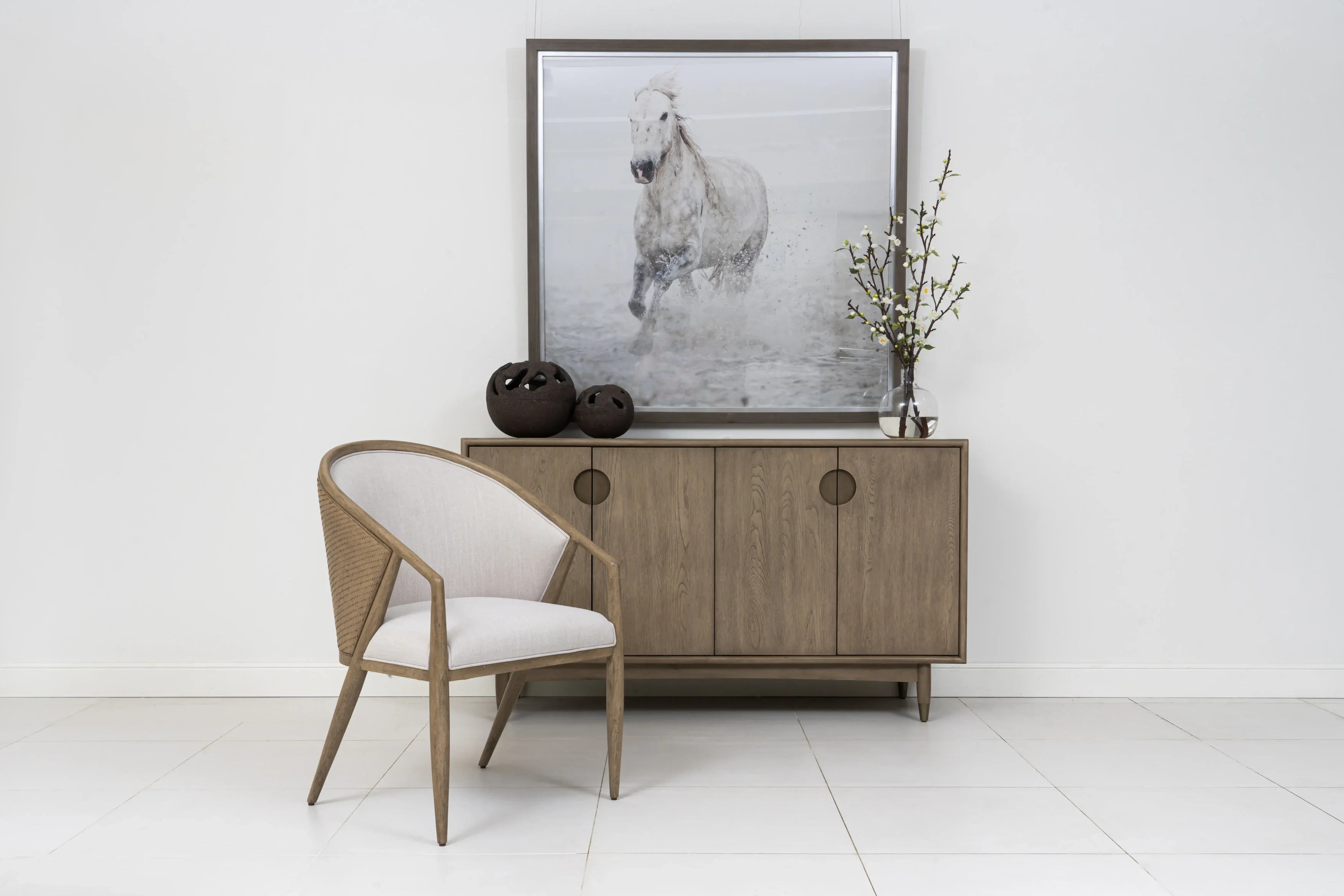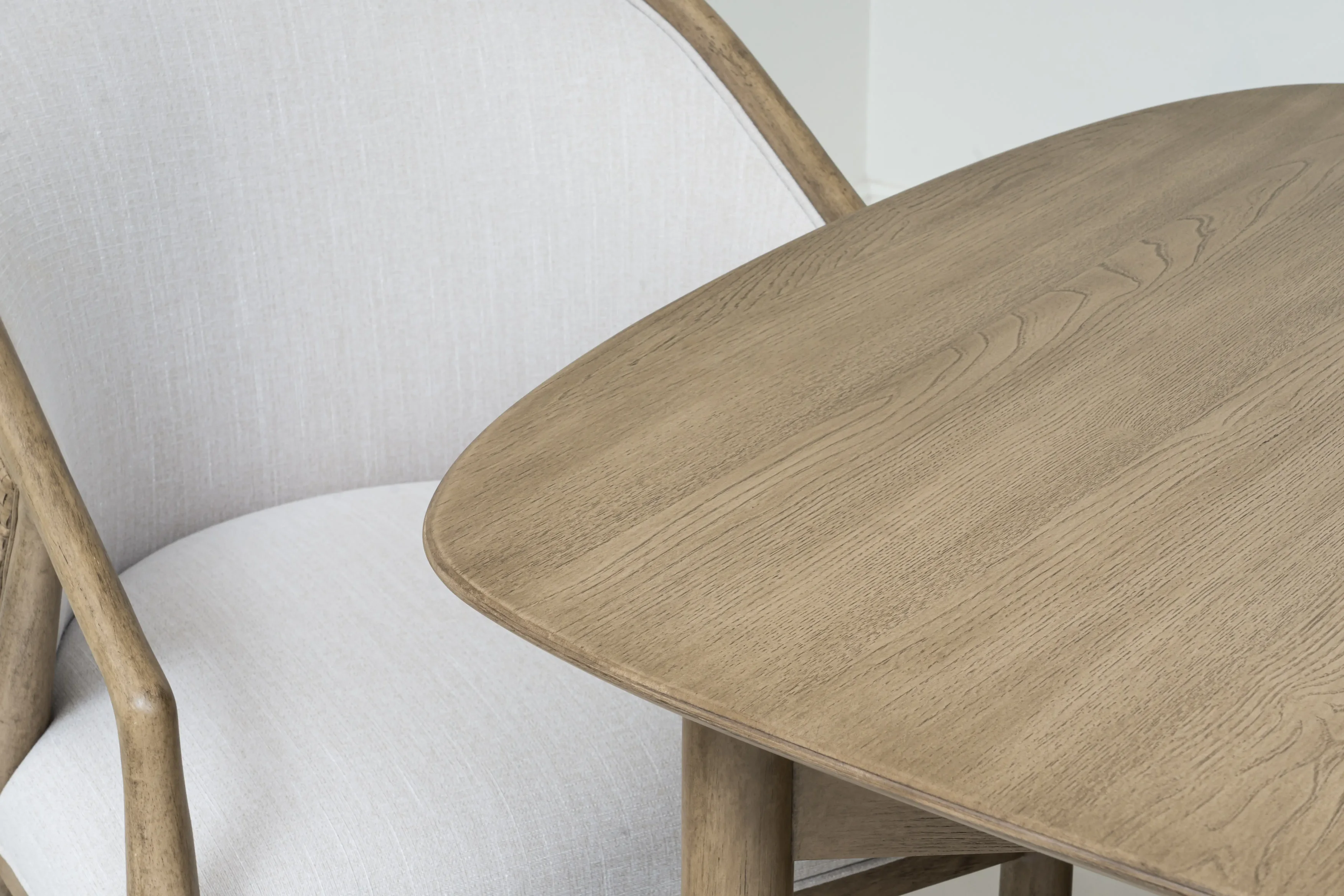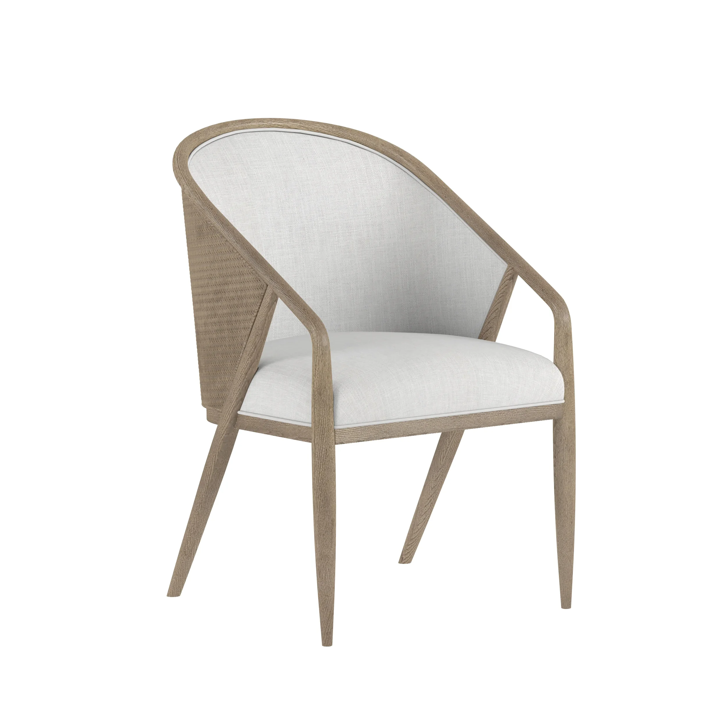 The Finn Rectangular Dining Table with Ten Side Chairs by A.R.T. Furniture captures the essence of mid-century sophistication with a modern twist. Its striking angular base, softened by subtly arched supports and rounded tabletop corners, creates a sense of balance and harmony. Crafted from parawood solids and elm veneer, the table showcases a warm grey finish that highlights the natural grain. Dual pedestal legs with antique gold metal ferrules add a refined touch, while two 20-inch leaves extend the table to comfortably seat up to ten guests.