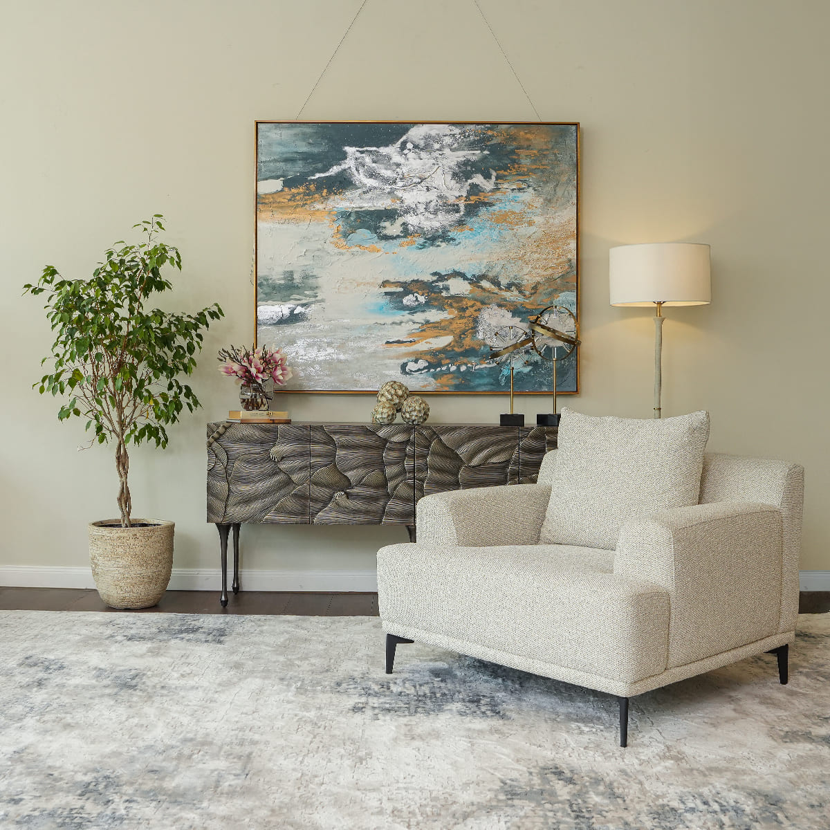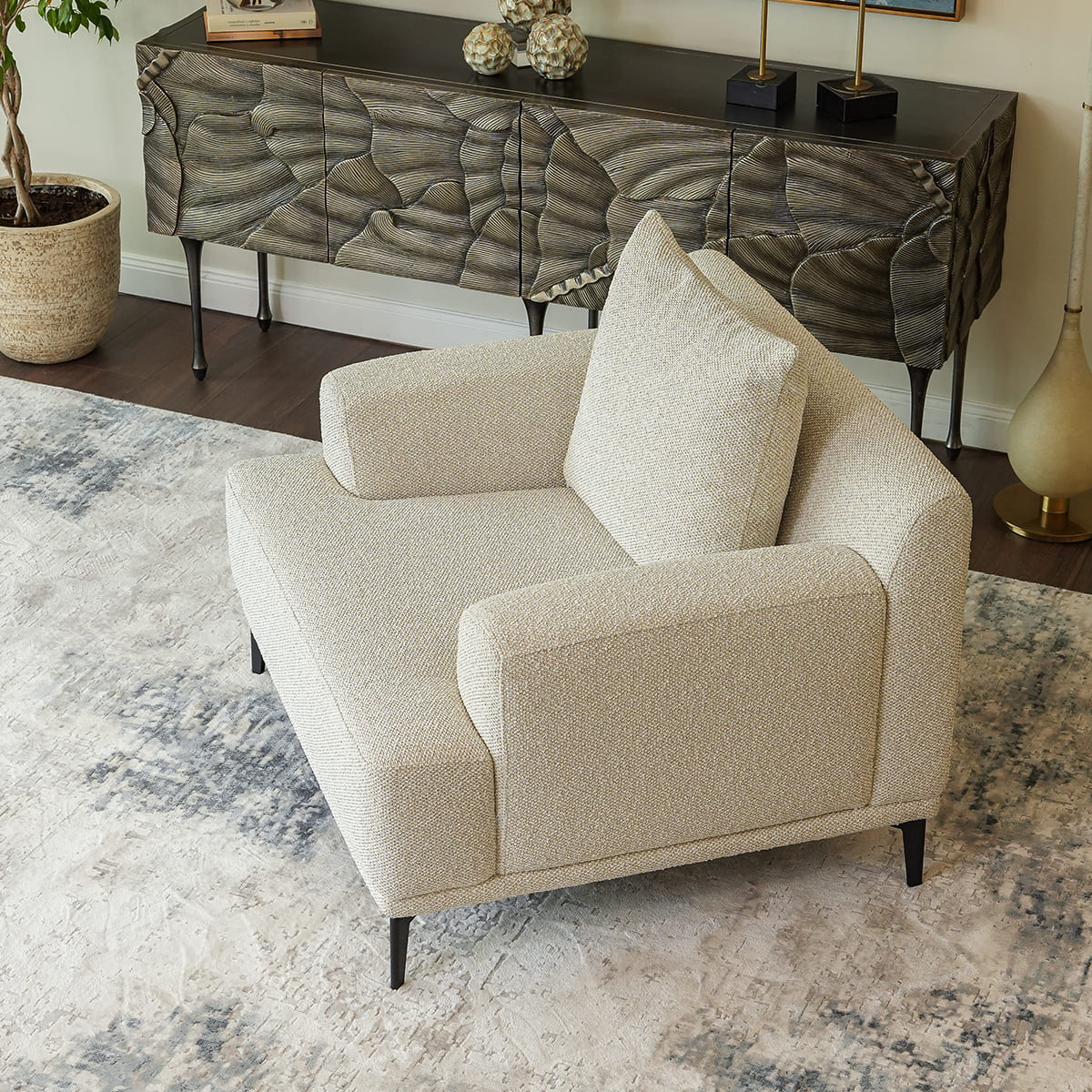 Experience tranquility in texture with the modern design. This one seater sofa isn't just about providing seating.It's about transforming your living space to meet your ever-changing needs. Pine Wood,HD35 Foam,Feather, Rubbeer Wood, Fabric