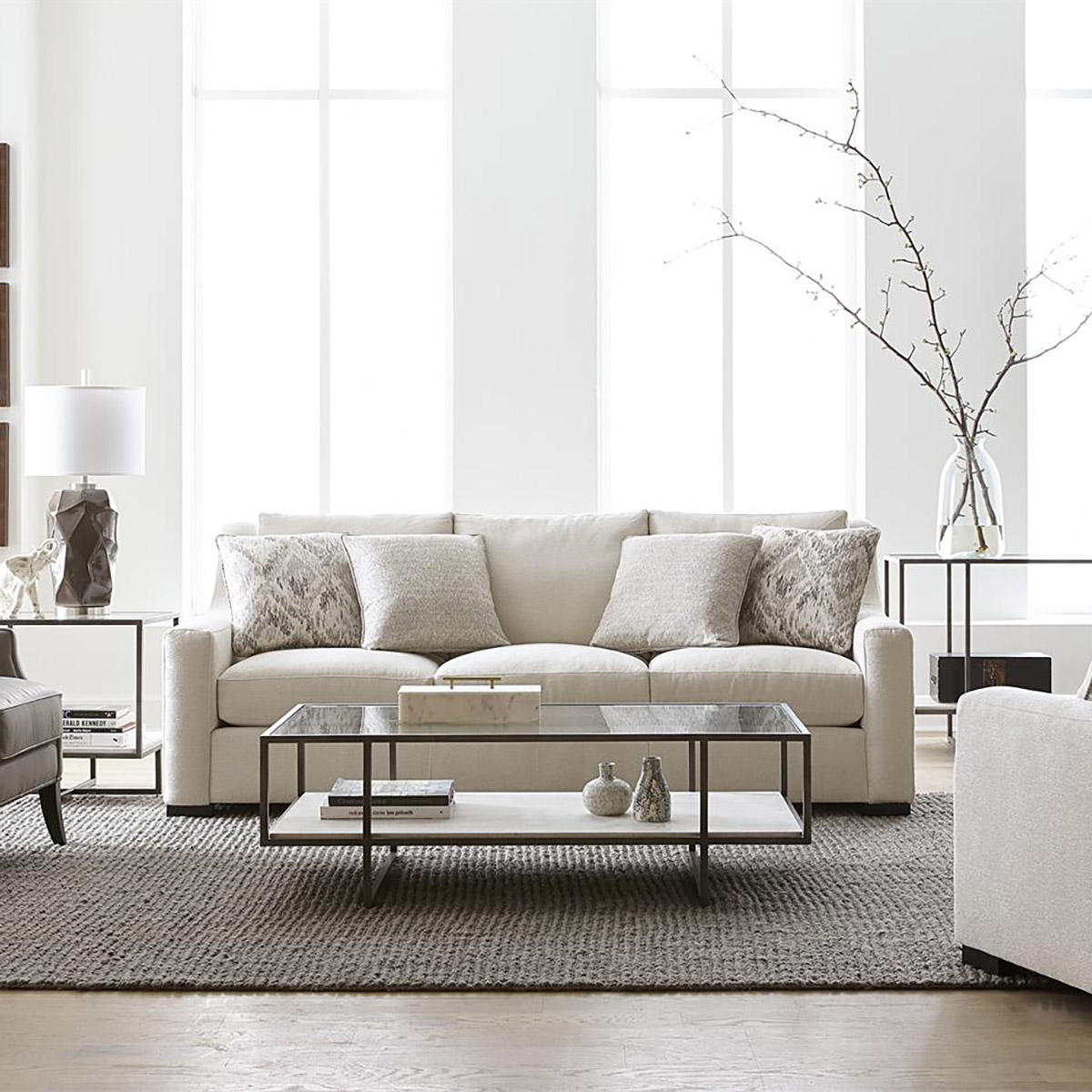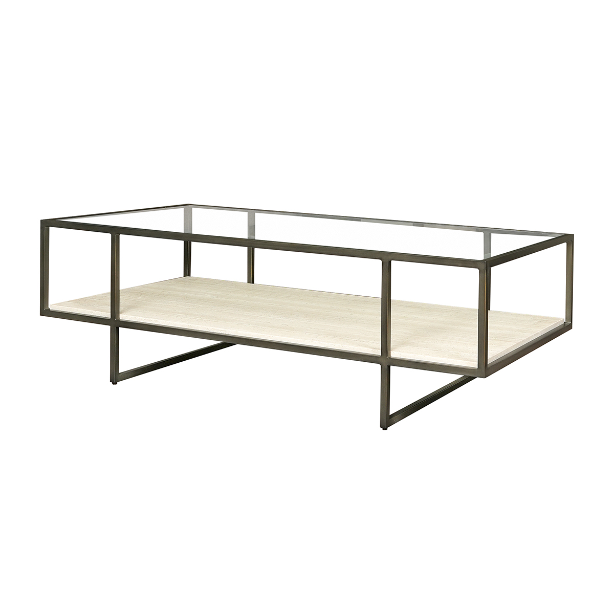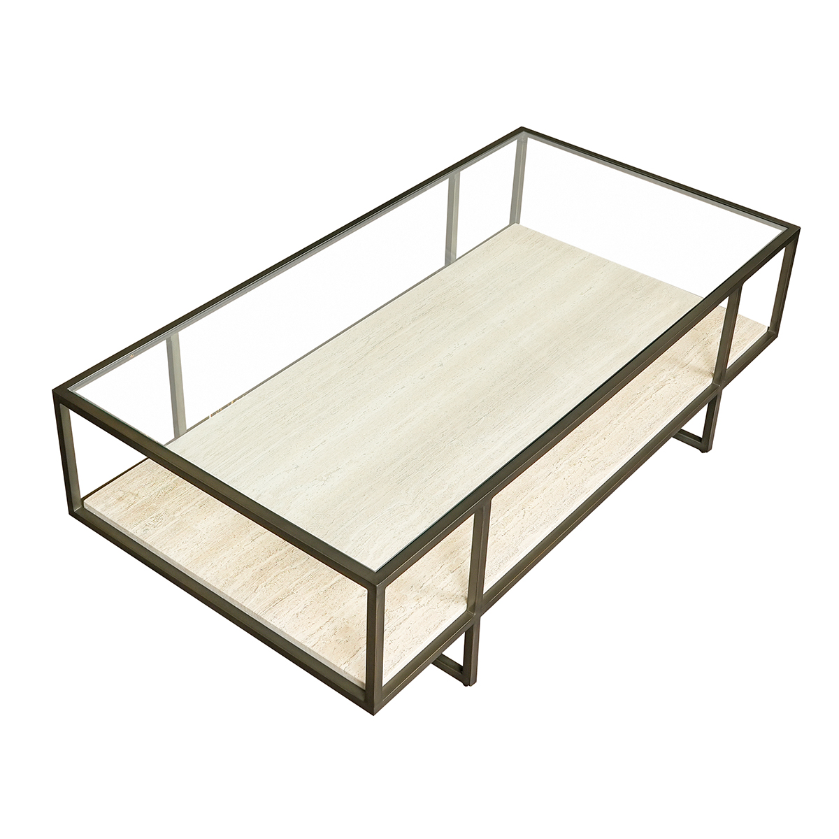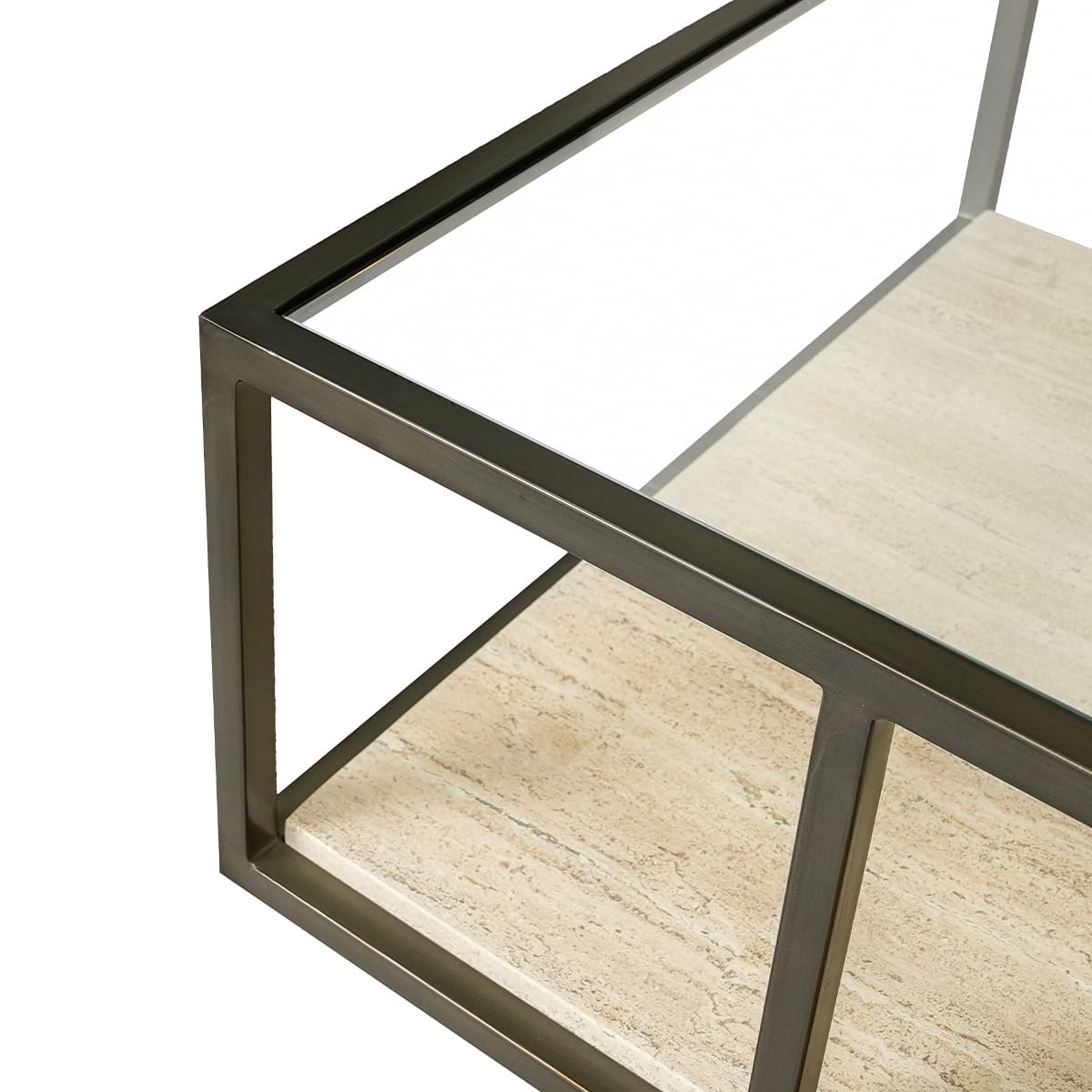 Inset tempered glass top with beveled edge. Tubular steel frame and stretchers in oil-rubbed Bronze finish. White travertine stone shelf