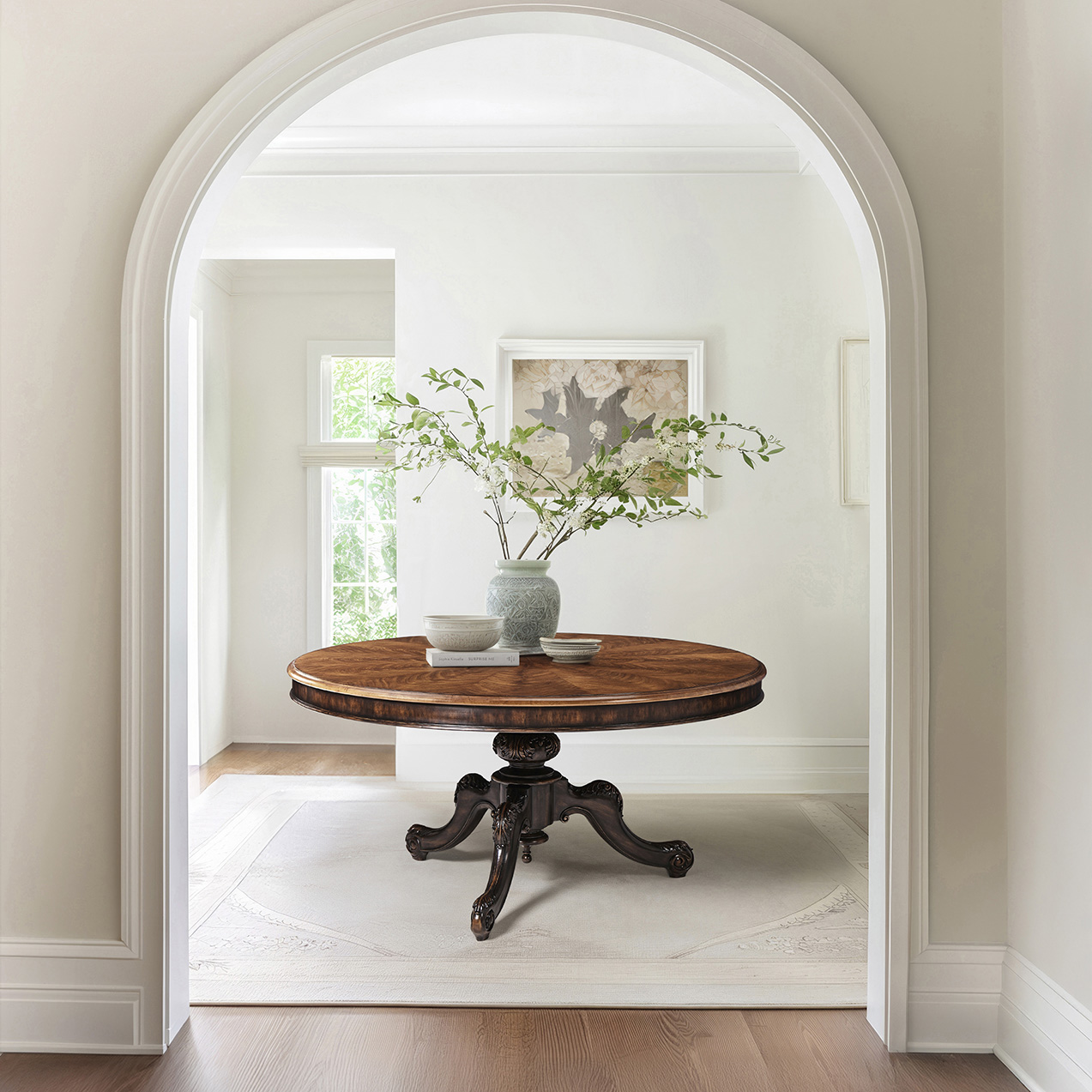 The Hattie sixty-inch round dining table introduces timeless grandeur to the dining room through its intricately crafted design and elevated materials. The tabletop showcases crotch walnut veneers arranged in a striking radial pattern, framed by a molded edge that enhances the natural artistry of the wood grain. The carved pedestal base, finished in a rich ebonized tone, creates a dramatic contrast with the warm hues of the top, emphasizing the table’s classic silhouette. Ideal for formal gatherings or refined everyday dining, the Hattie table embodies enduring elegance and masterful craftsmanship.