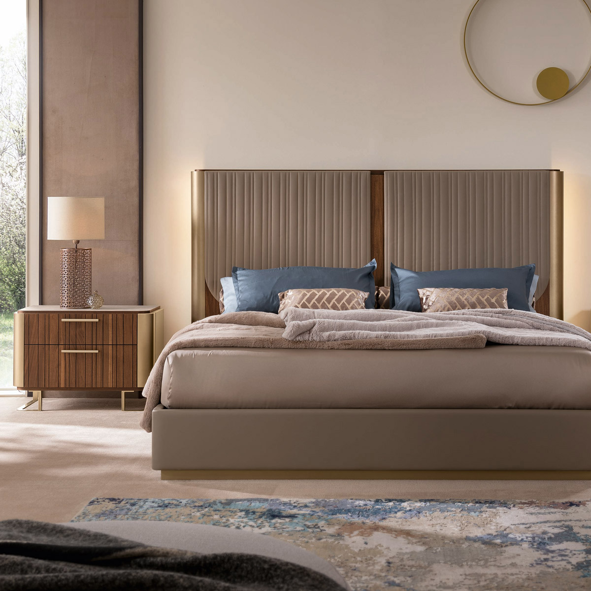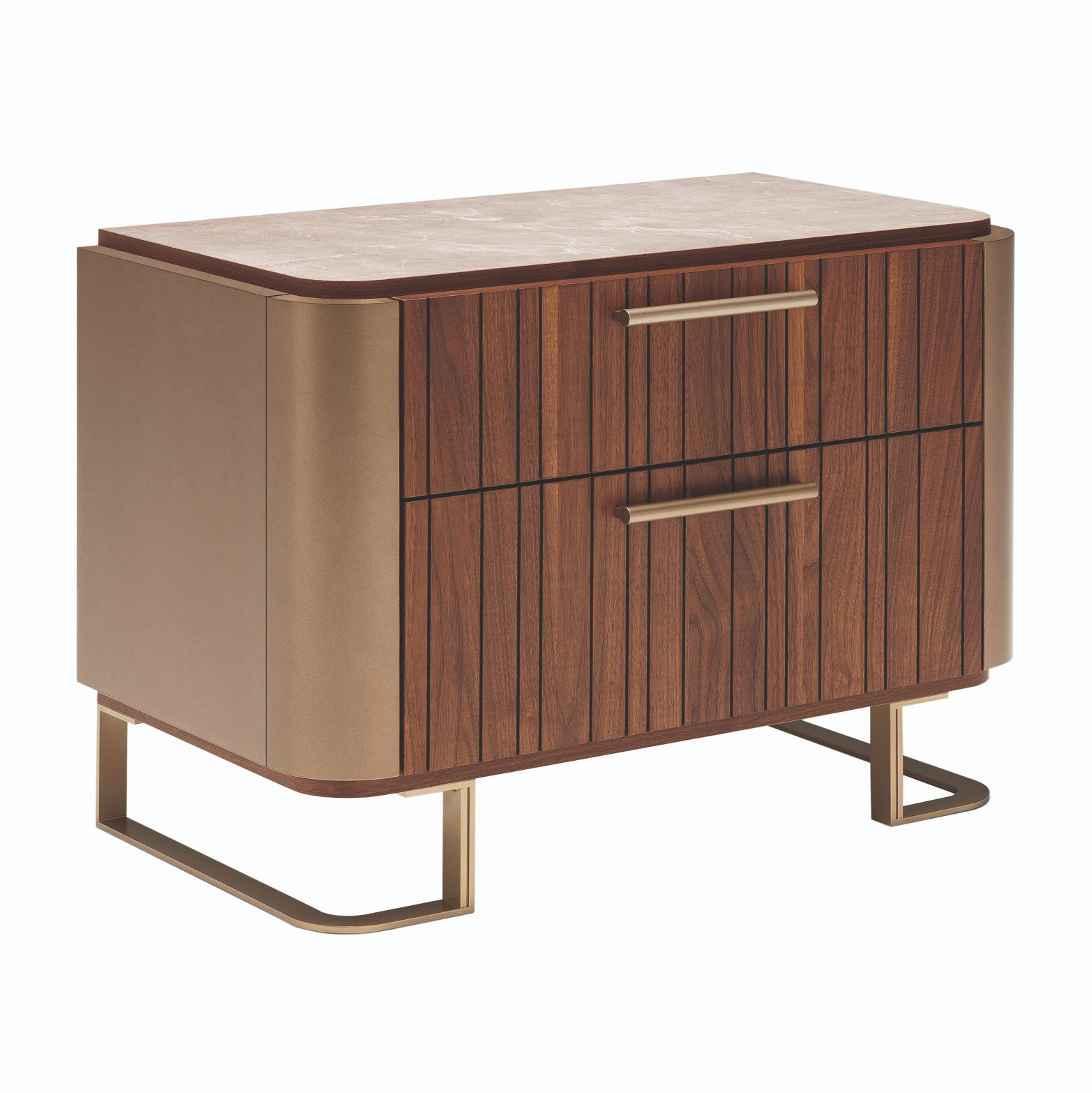 Hera Bedside Table – ALF Italia is an elegant bedroom accent that combines warm walnut wood with refined contemporary detailing. Featuring vertical milling that enhances the natural grain, it is complemented by golden-effect lacquer accents that add a subtle touch of luxury. The design reflects a harmonious blend of natural textures and modern sophistication, making it a stylish and functional bedside piece that enriches the ambiance of refined bedroom interiors.