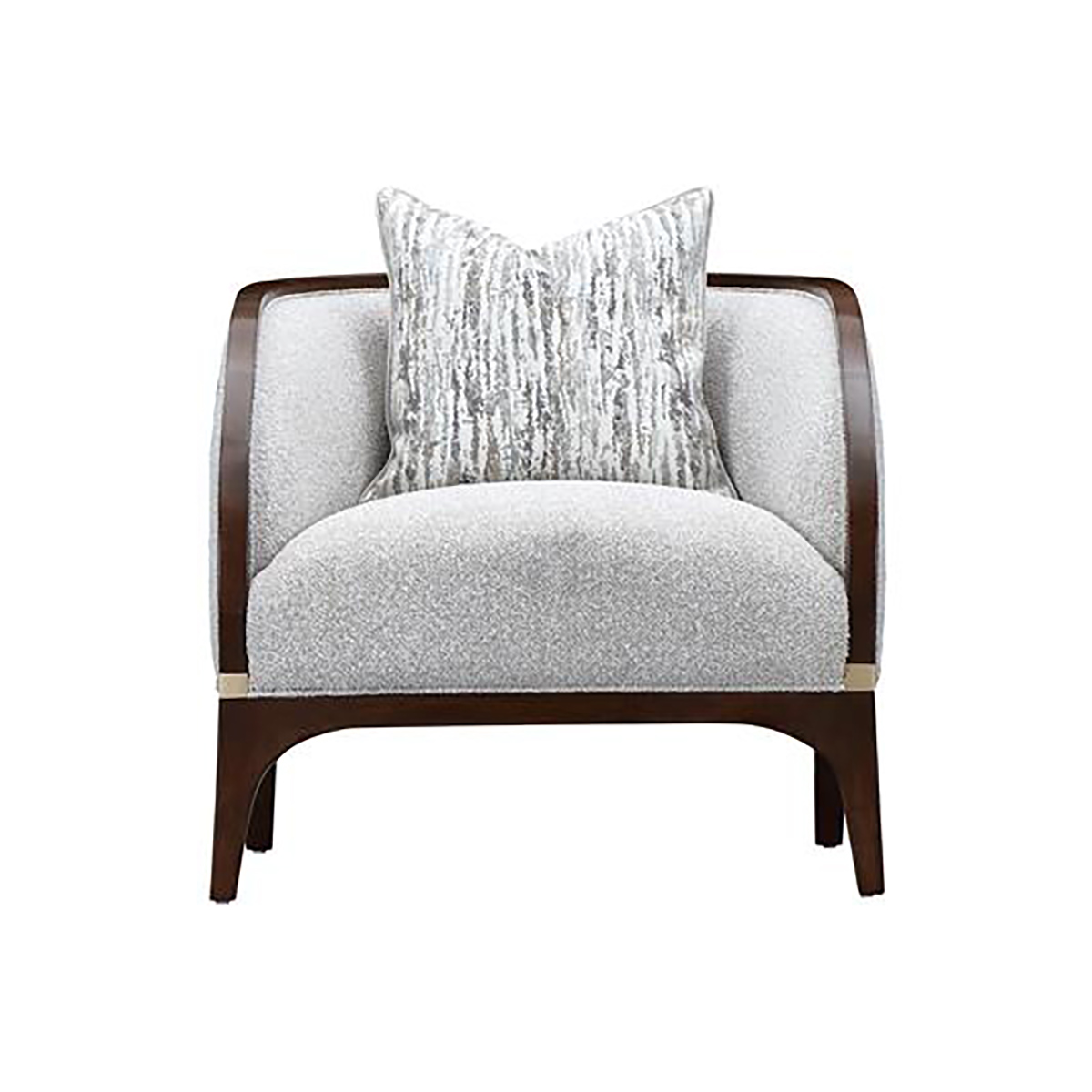 The Houston Sofa and Matching Chair embody refined comfort and timeless elegance. Upholstered in mingled bouclé fabric in soft tones ofGrey, ivory, and tan, they exude understated luxury. Each piece features a gracefully curved wood frame finished in warm walnut with painted gold accents, adding a hint of glamour. Feather-filled pillows in curated textures and hues complete the ensemble, creating a harmonious blend of sophistication and comfort for any living space.