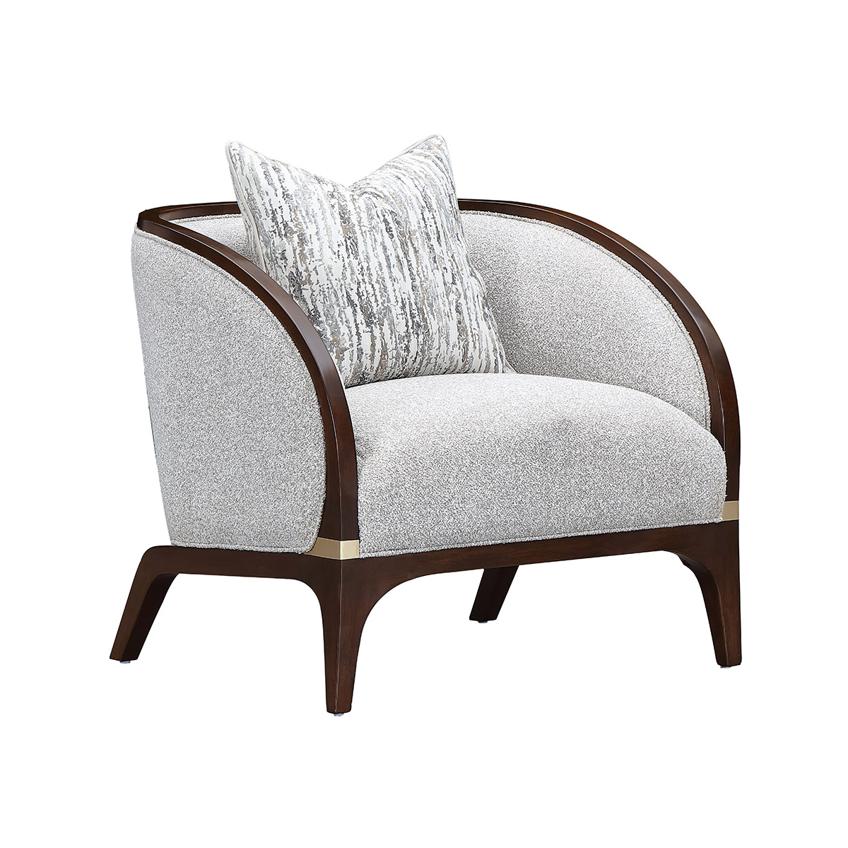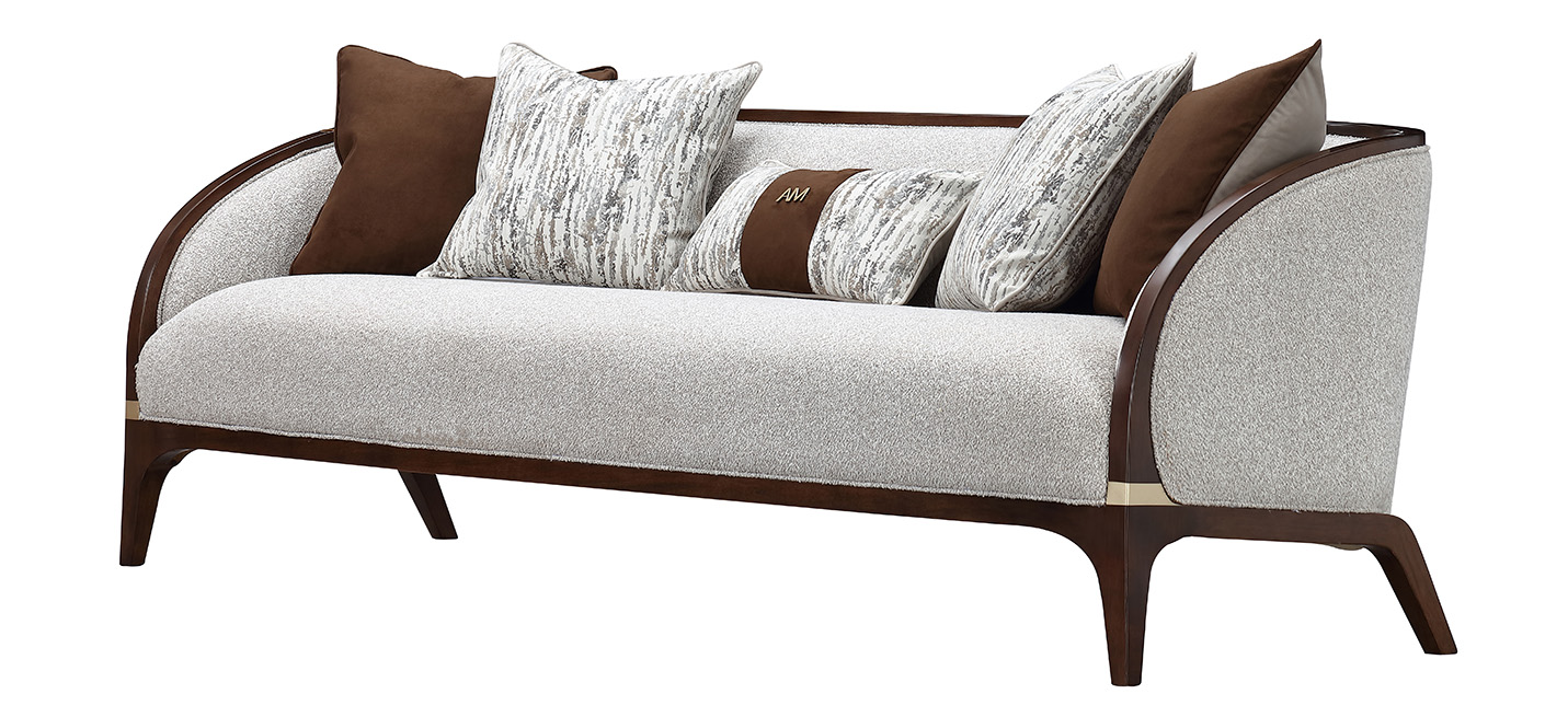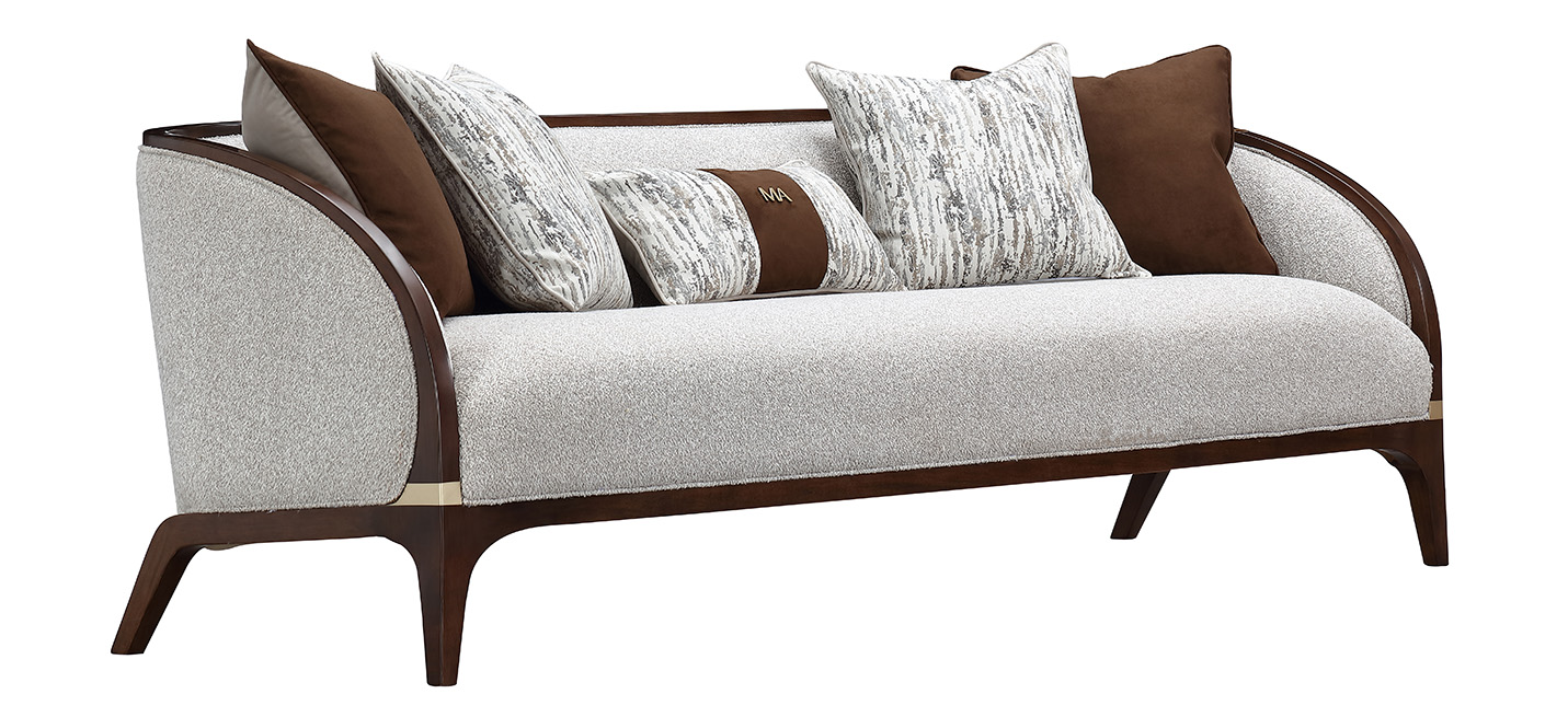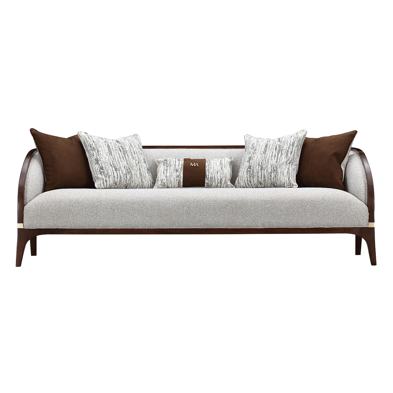 Designed for refined comfort, the Houston Sofa blends understated elegance with plush relaxation. Upholstered in a mingled bouclé fabric featuring hues of gray, ivory, and tan, it offers a soft yet sophisticated aesthetic. The gracefully curved wood frame is finished in warm walnut and accented with painted gold details, adding a subtle touch of glamour. Five feather-filled pillows in a thoughtfully curated mix of textures and colors complete the look, creating an inviting and polished presence in any living space.