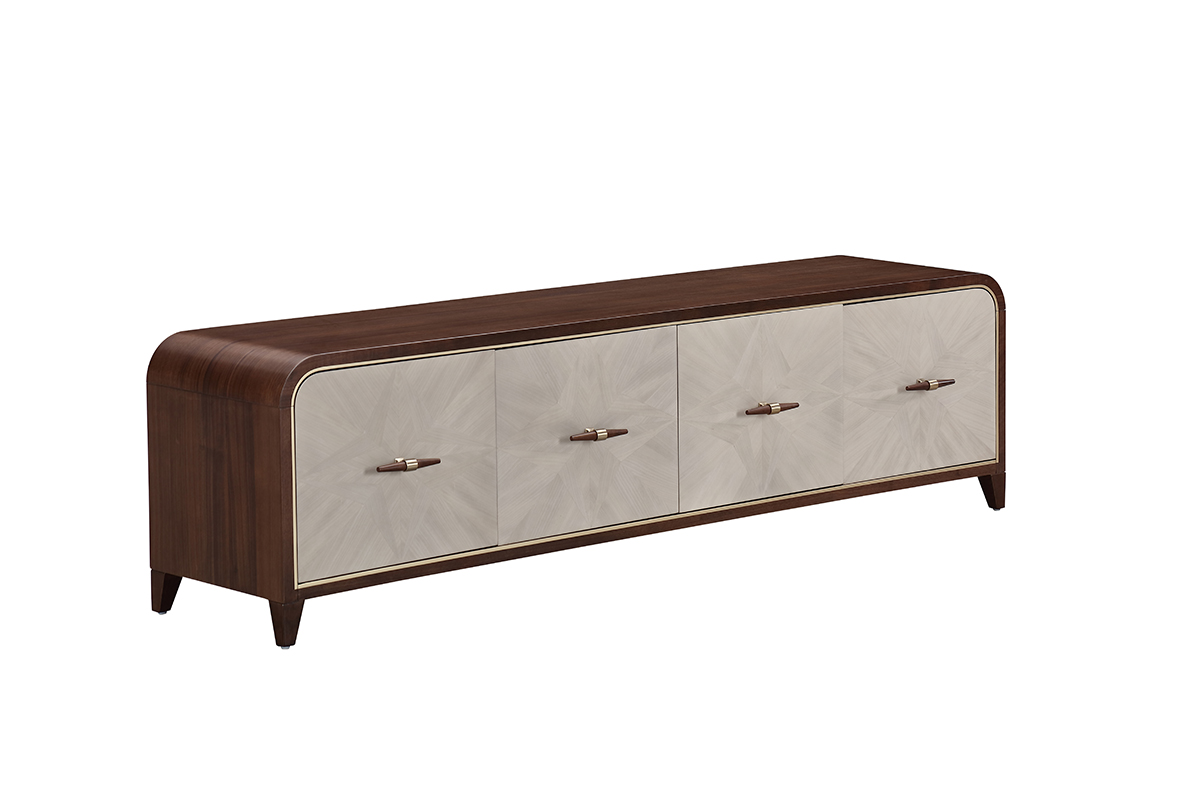 Elevate your entertainment space with the Houston Media Cabinet, a sophisticated blend of modern design and functional elegance. Its sleek silhouette is finished in warm walnut, offering a timeless foundation for any living room or media setup. The doors feature a strikingGrey hue with a subtle starburst pattern and a softly textured surface, beautifully contrasted by a gold trim. Designed for convenience, the spacious interior provides ample storage, while thoughtful details like cable management and adjustable shelving ensure seamless organization.