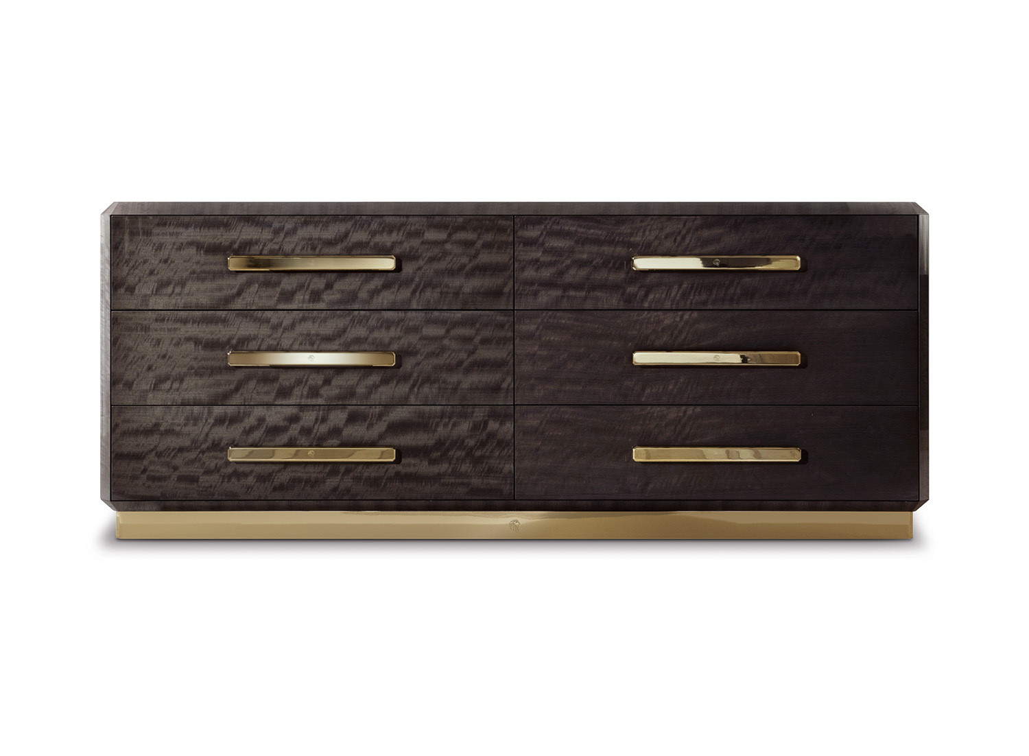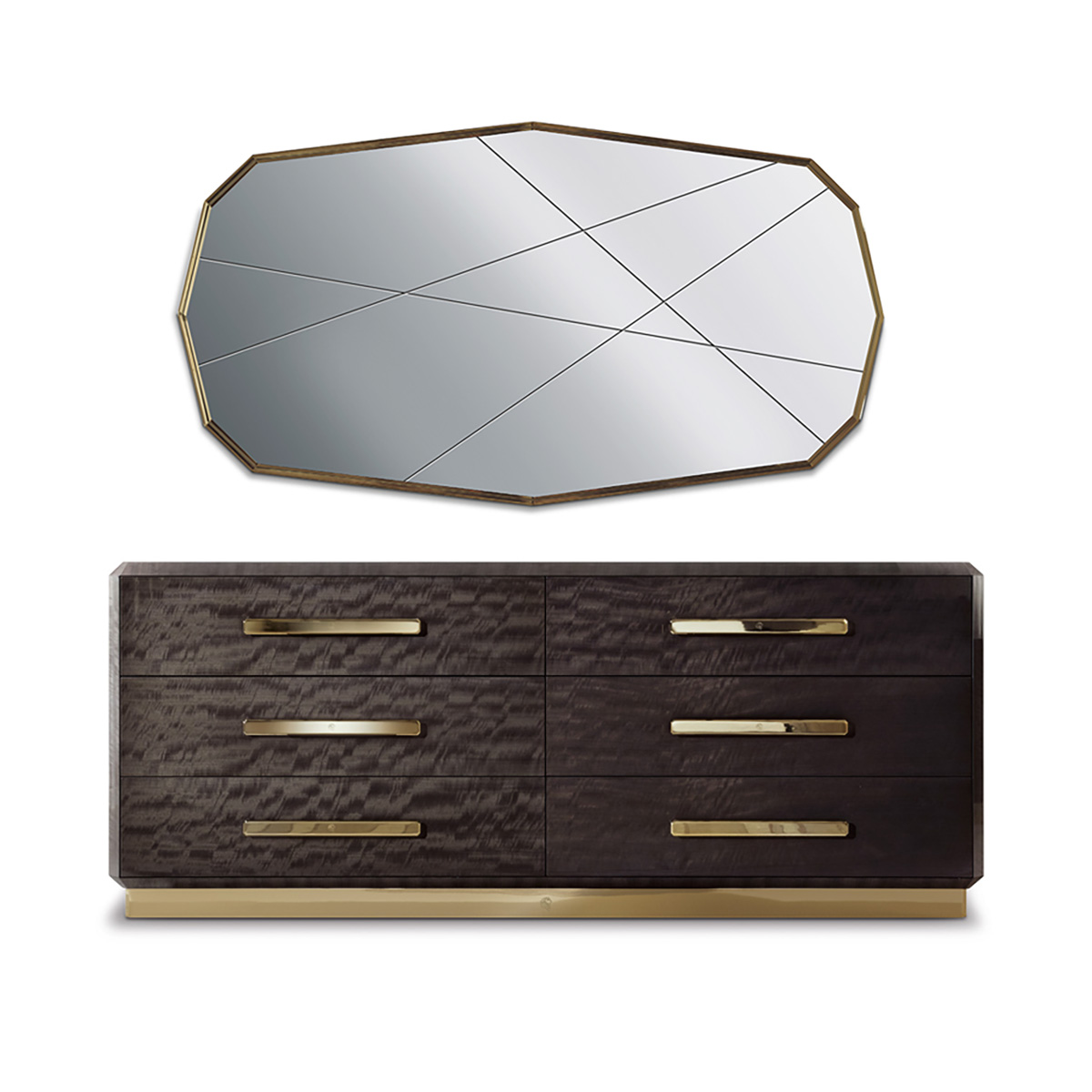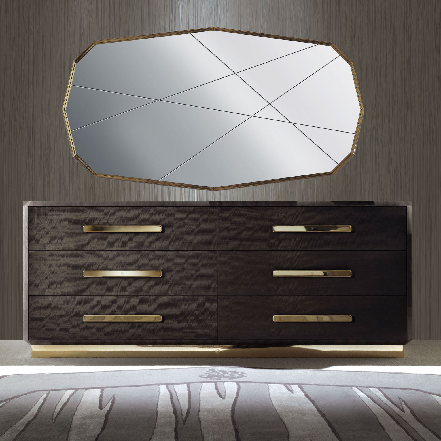 Dresser in makore mahogany veneer with high gloss polyester finish. Inlaid veneer top, 6 full extension drawers with bottom part in velvet fabric. Base and handles in light gold chrome stainless steel with Giorgio Collection logo. Rectangular mirror with light gold chrome stainless steel frame. Inlaid mirror with tempered glass.