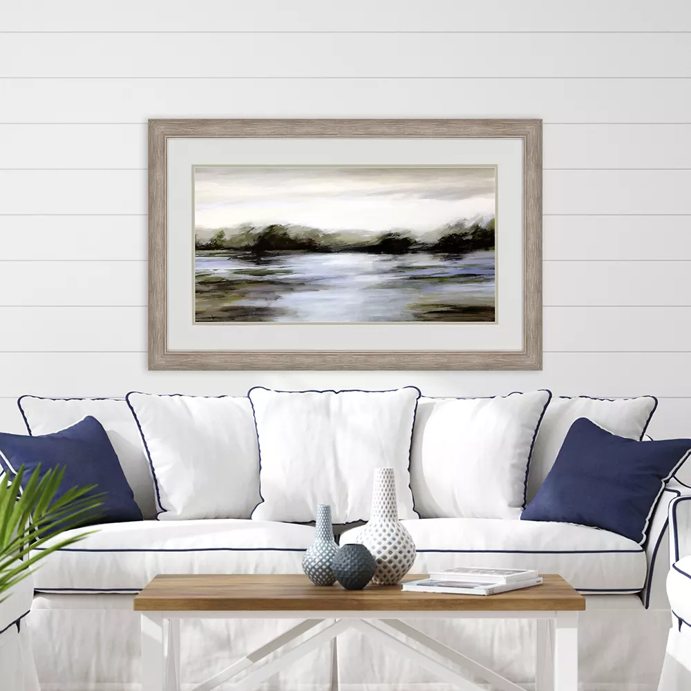 Soothing lakeside landscape is neutrally matted. Framed in a silver distressed moulding.