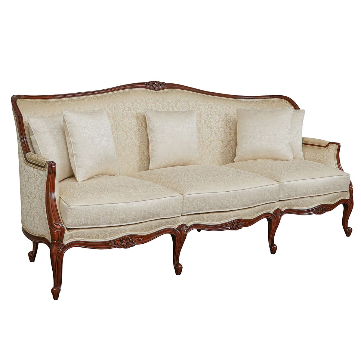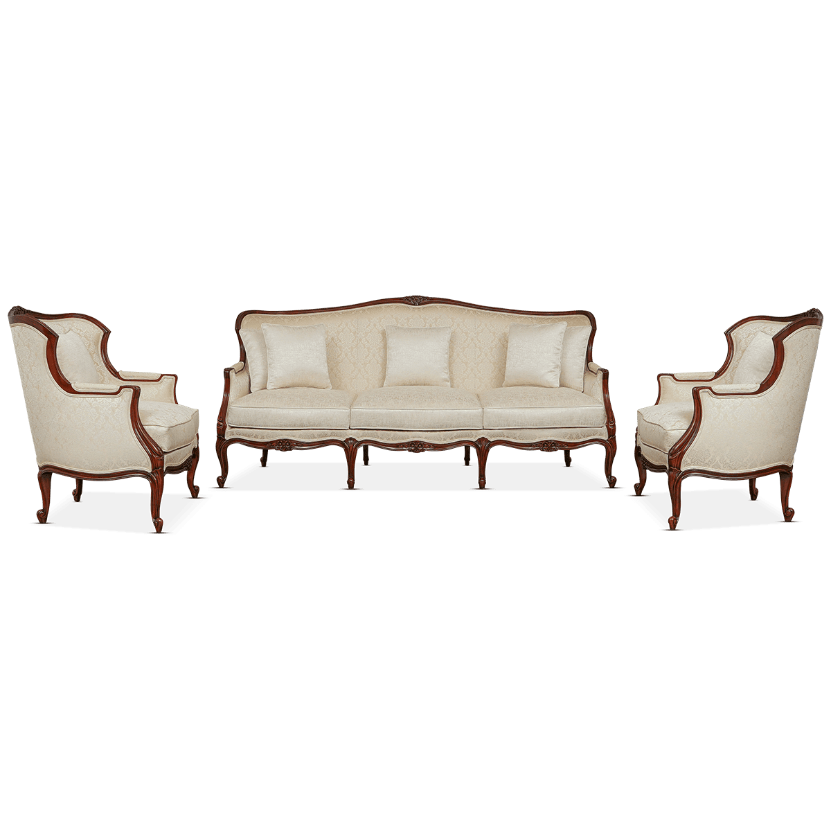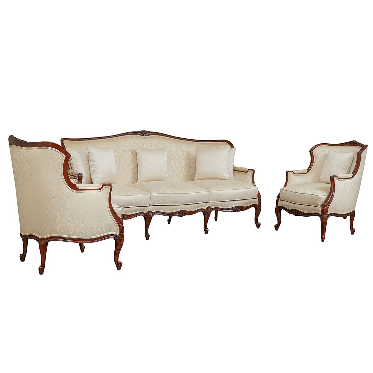 The Jayne sofa set is a stunning Louis XV-inspired piece, featuring delicate hand-carved floral details and elegant cabriole legs. Shown here in a rich walnut finish and luxurious velvet fabric, the French Bergère style combines classic sophistication with timeless craftsmanship.
