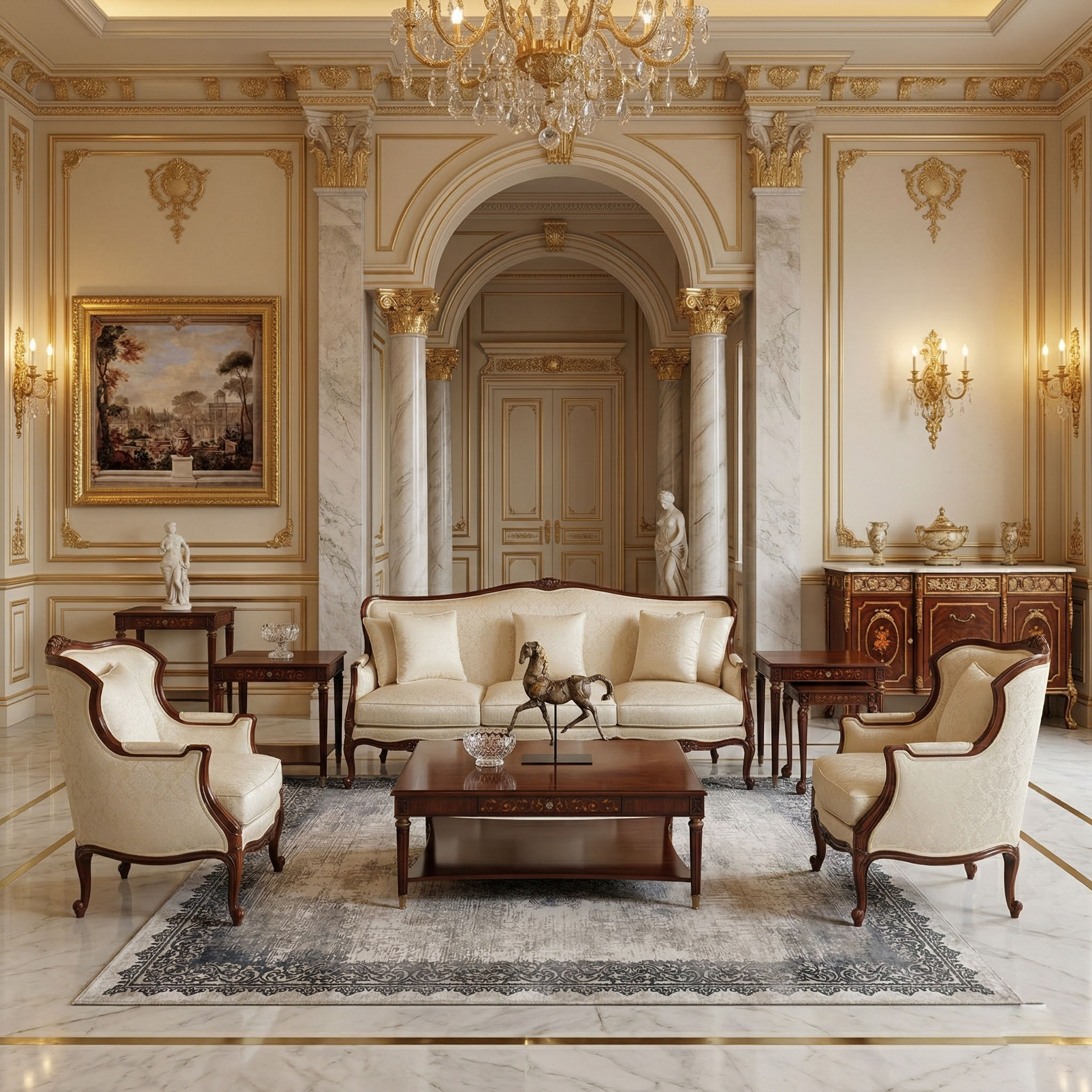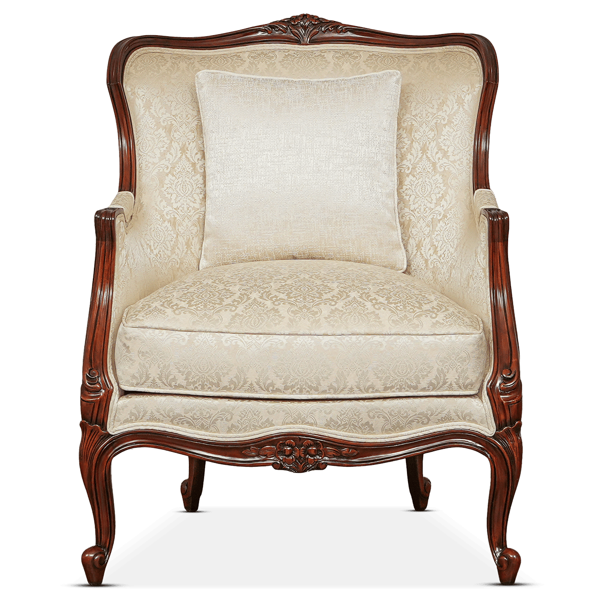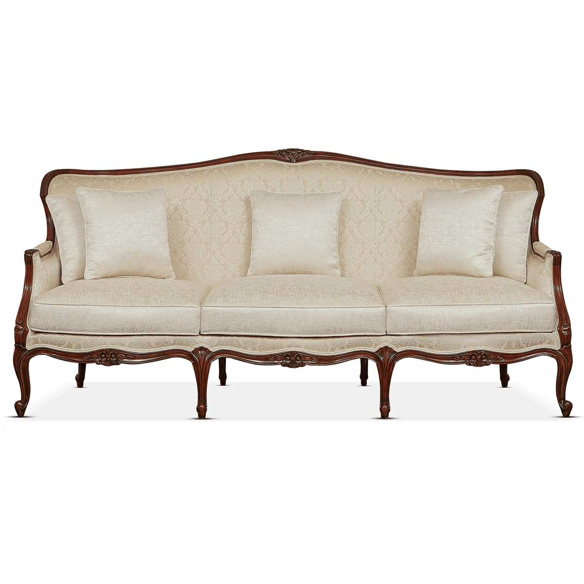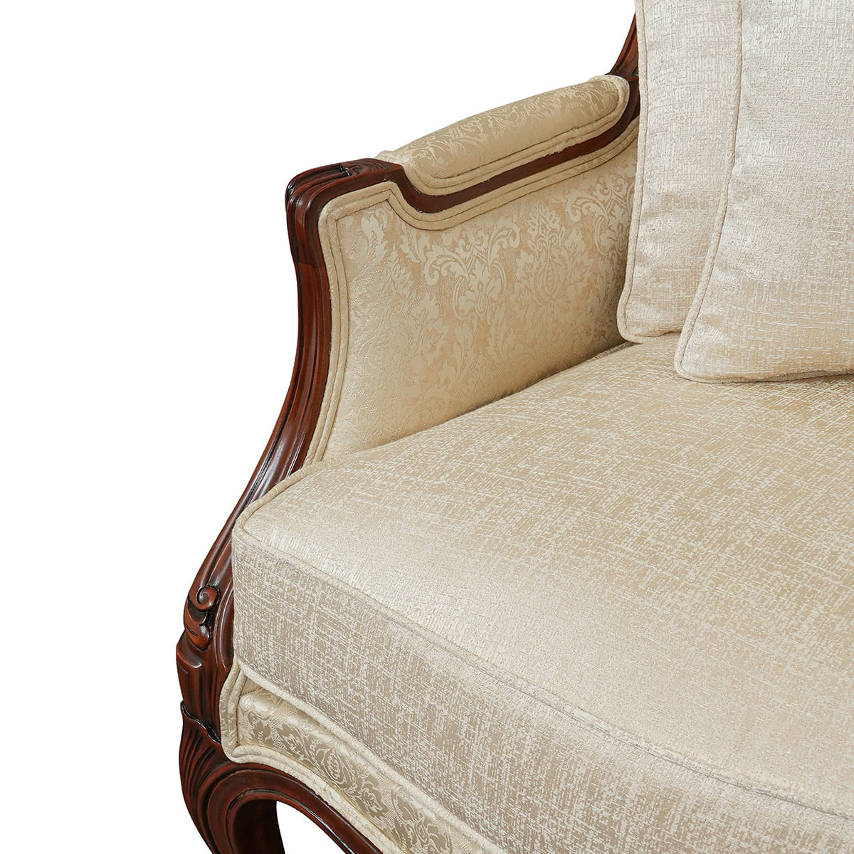 The Jayne sofa set is a stunning Louis XV-inspired piece, featuring delicate hand-carved floral details and elegant cabriole legs. Shown here in a rich walnut finish and luxurious velvet fabric, the French Bergère style combines classic sophistication with timeless craftsmanship.
