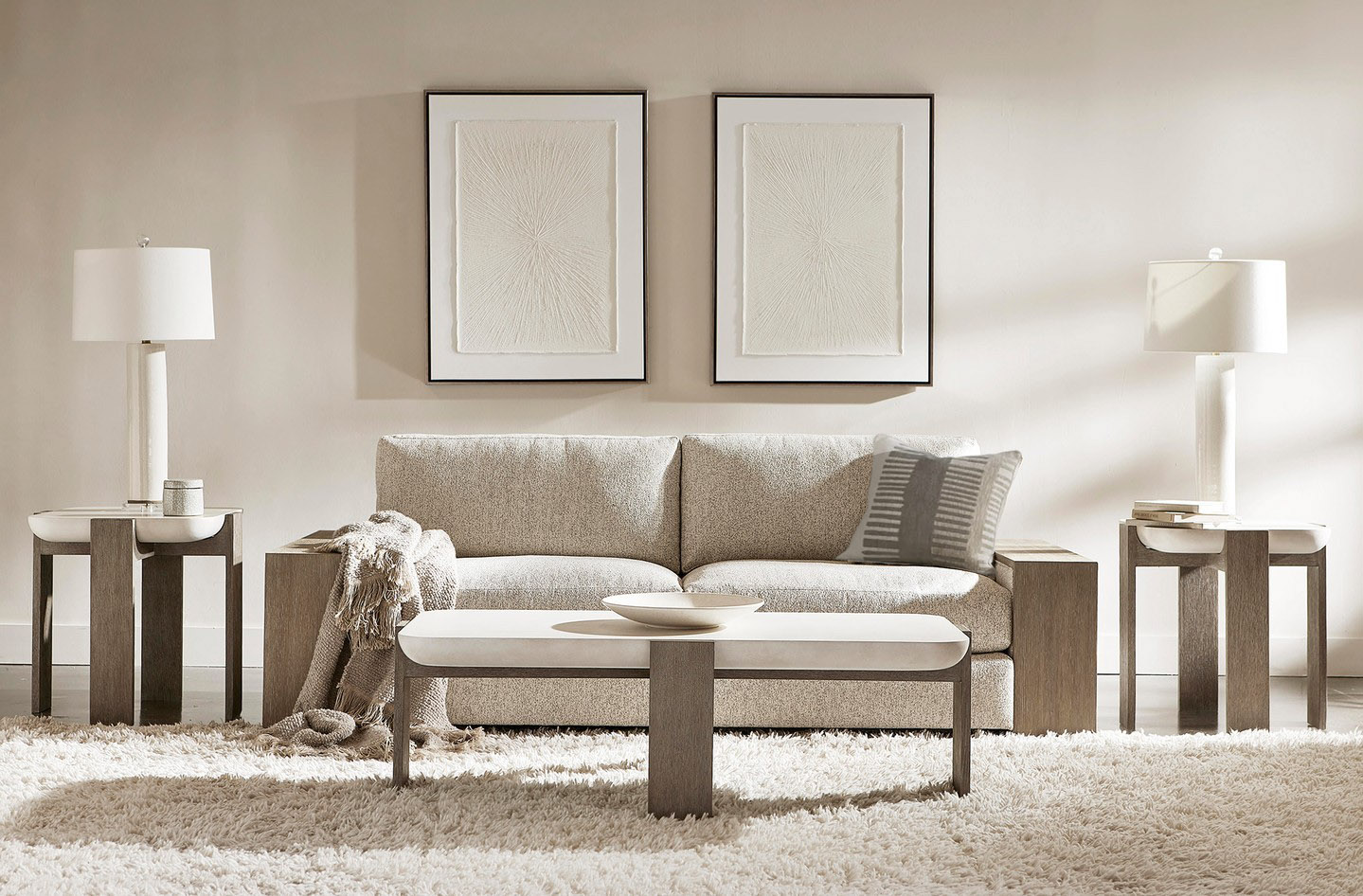Structural arms of exposed wood in Flint finish frame inset upholstered panels on either side of the unique Kali sofa. Floating between the arms is a sumptuous seat with back cushions that have a box-edge border.