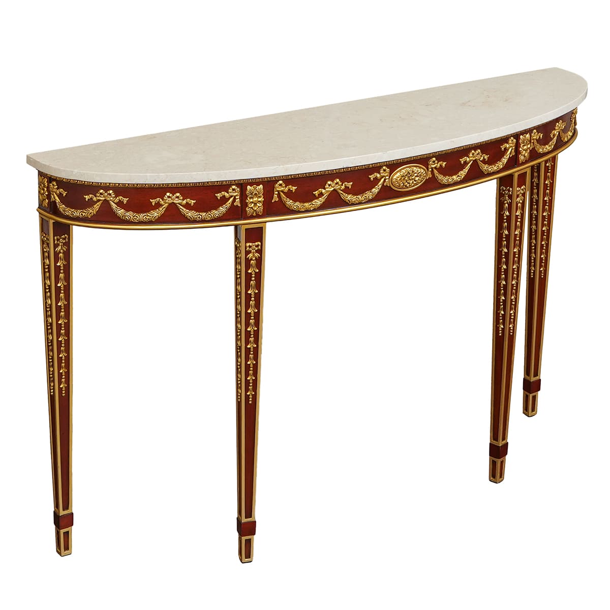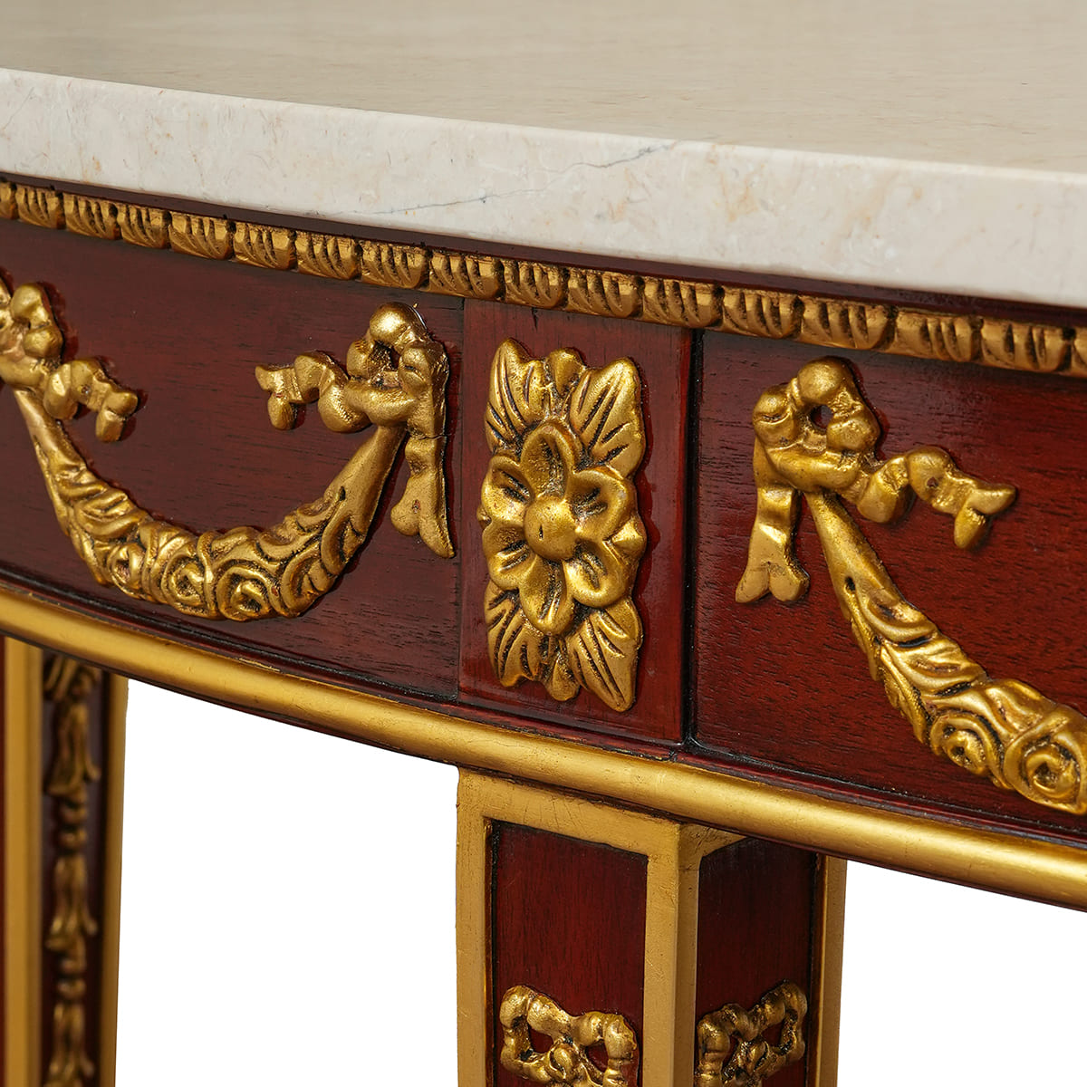 Elevate your space with the distinguished beauty of the Lauter Console Table. The warm English Mahogany finish graces the top, while the hand-carved base, finished in Jansen’s white with gilded accents, adds an exquisite touch.