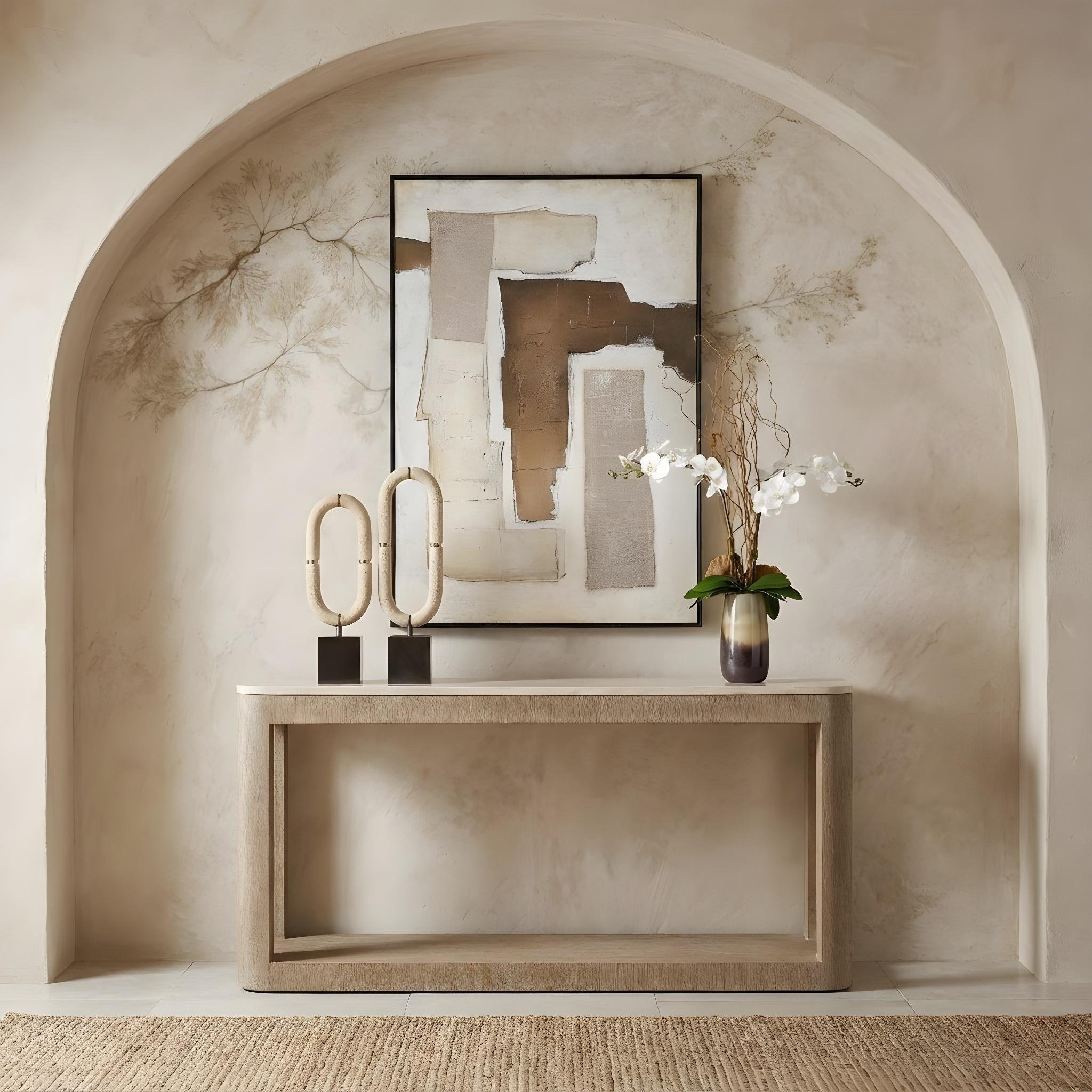 The Loggia console table uses simple lines and curves to craft a uniquely modern form. The supports are gently rounded, complementing the curved corners of the travertine stone top. The textured wood in Aria finish creates dimension.