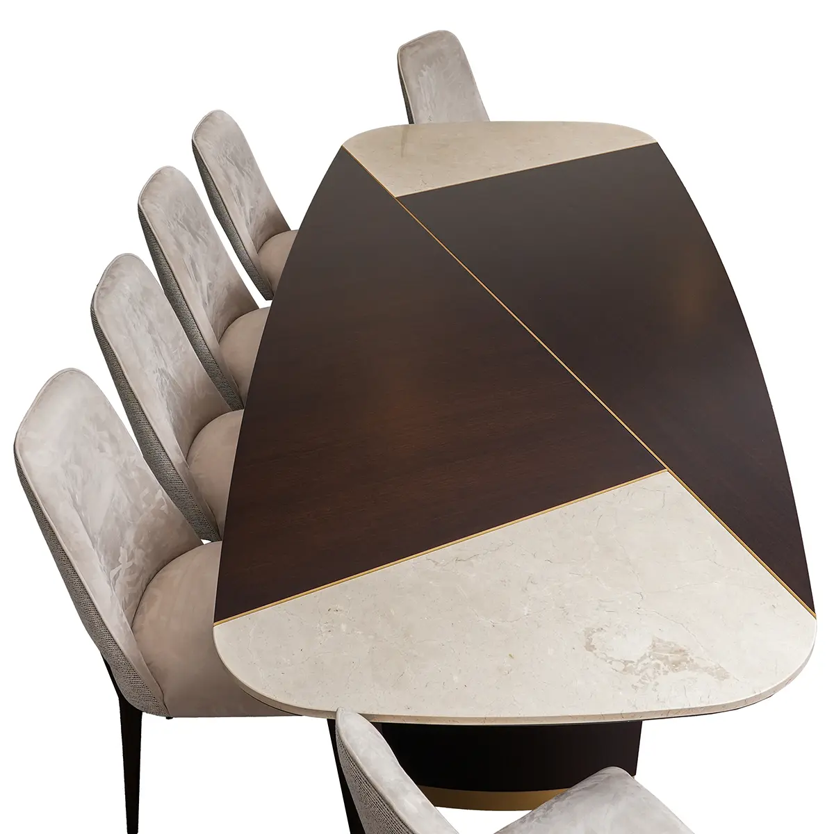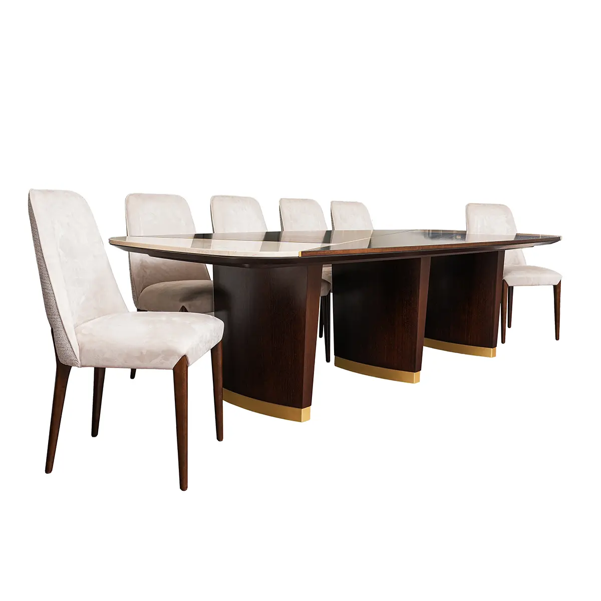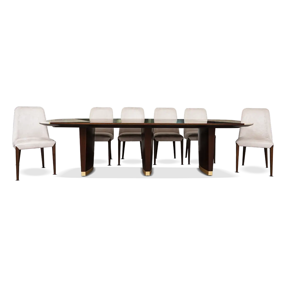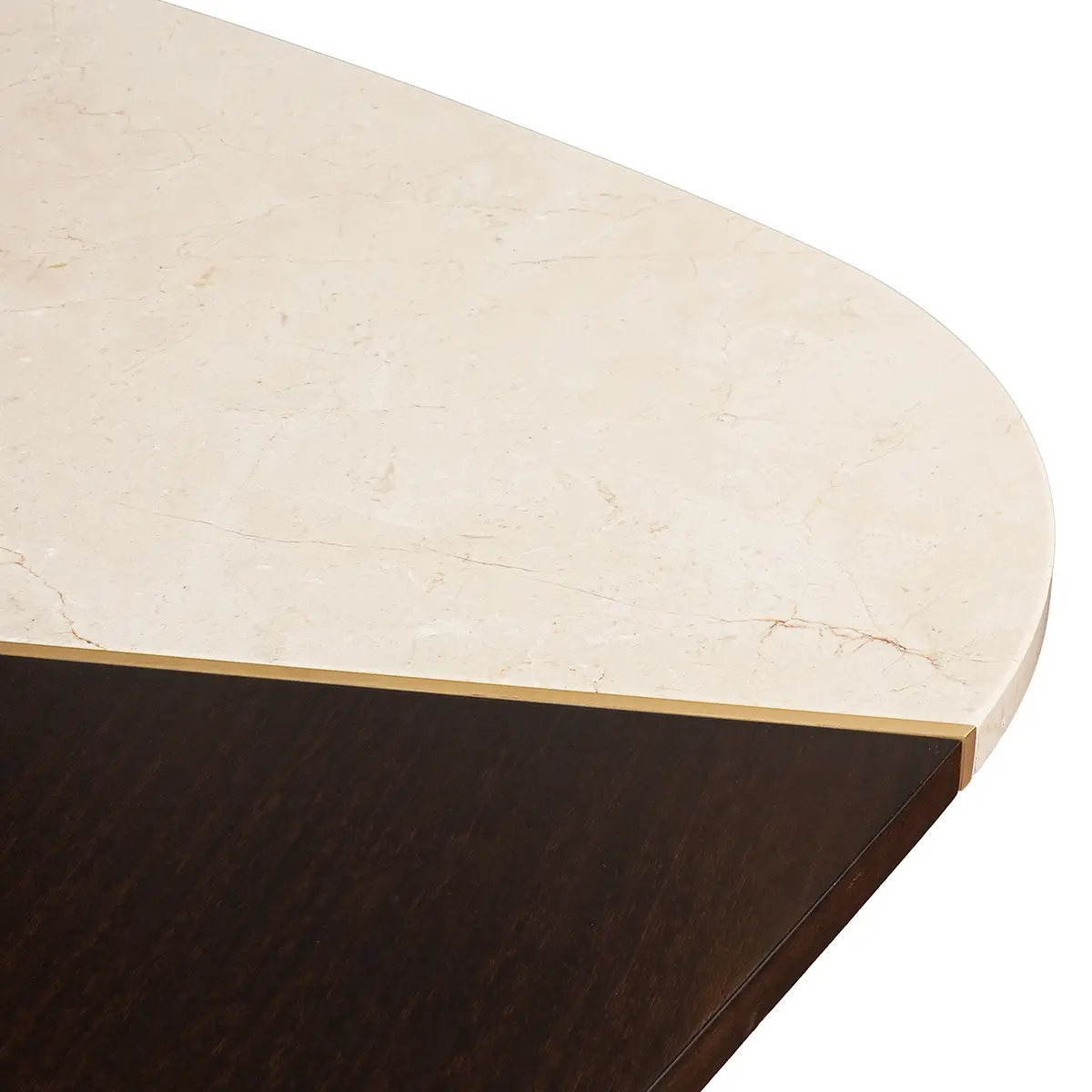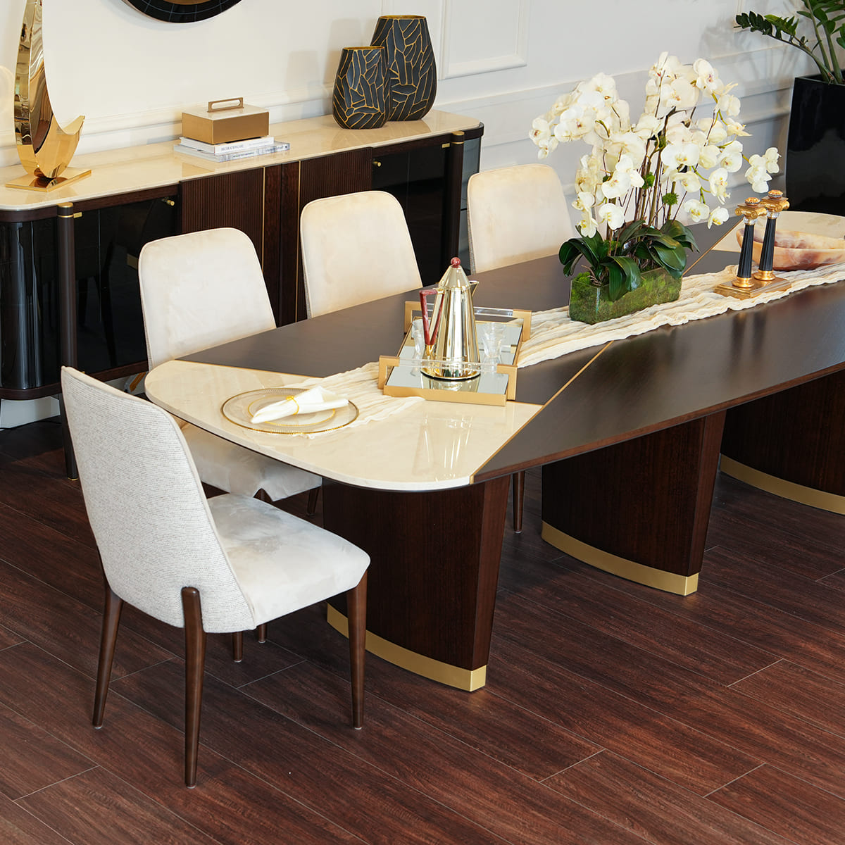 The Louise Dining Table embodies refined elegance and exceptional craftsmanship. Its fixed tabletop features luxurious marble ends, while the center and legs are finished in rich eucalyptus veneer with a subtle 30% sheen. Brushed brass metal details accentuate the feet and tabletop, adding a touch of sophistication and warmth. Designed to blend beauty and durability, the Louise Dining Table serves as a stunning centerpiece that elevates any modern dining space with timeless luxury.