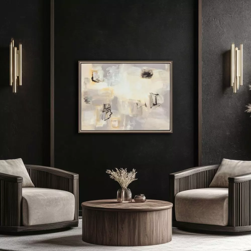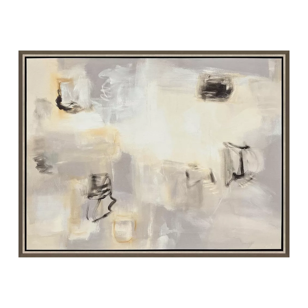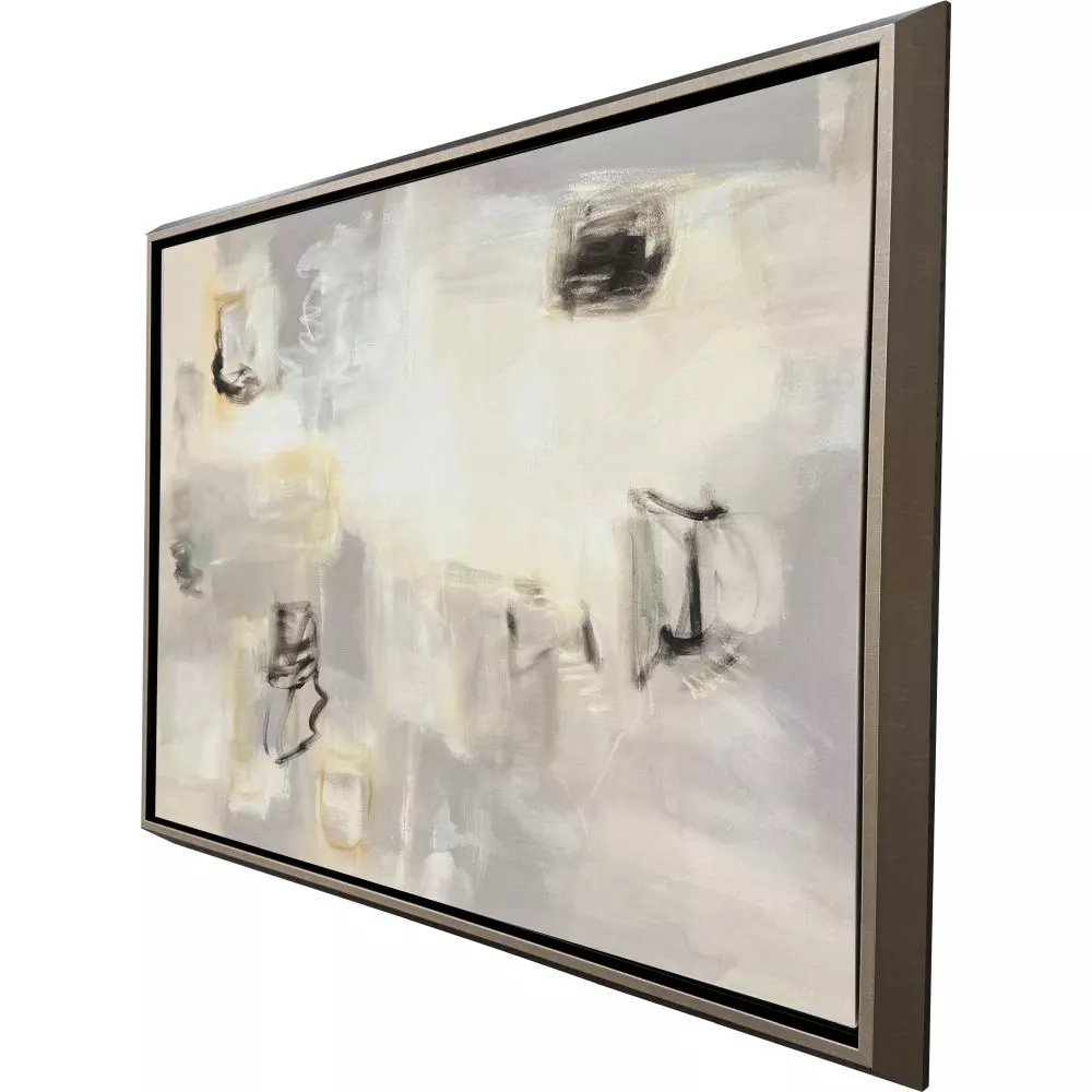 A contemporary abstract lends a harmonious blend of colors for a soothing balm. The canvas is mounted in a champagne gold finish floater frame.