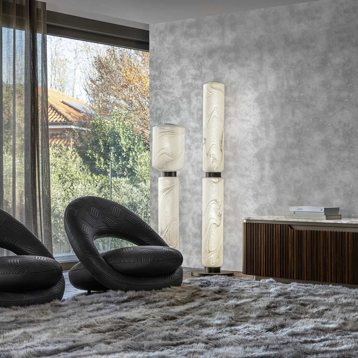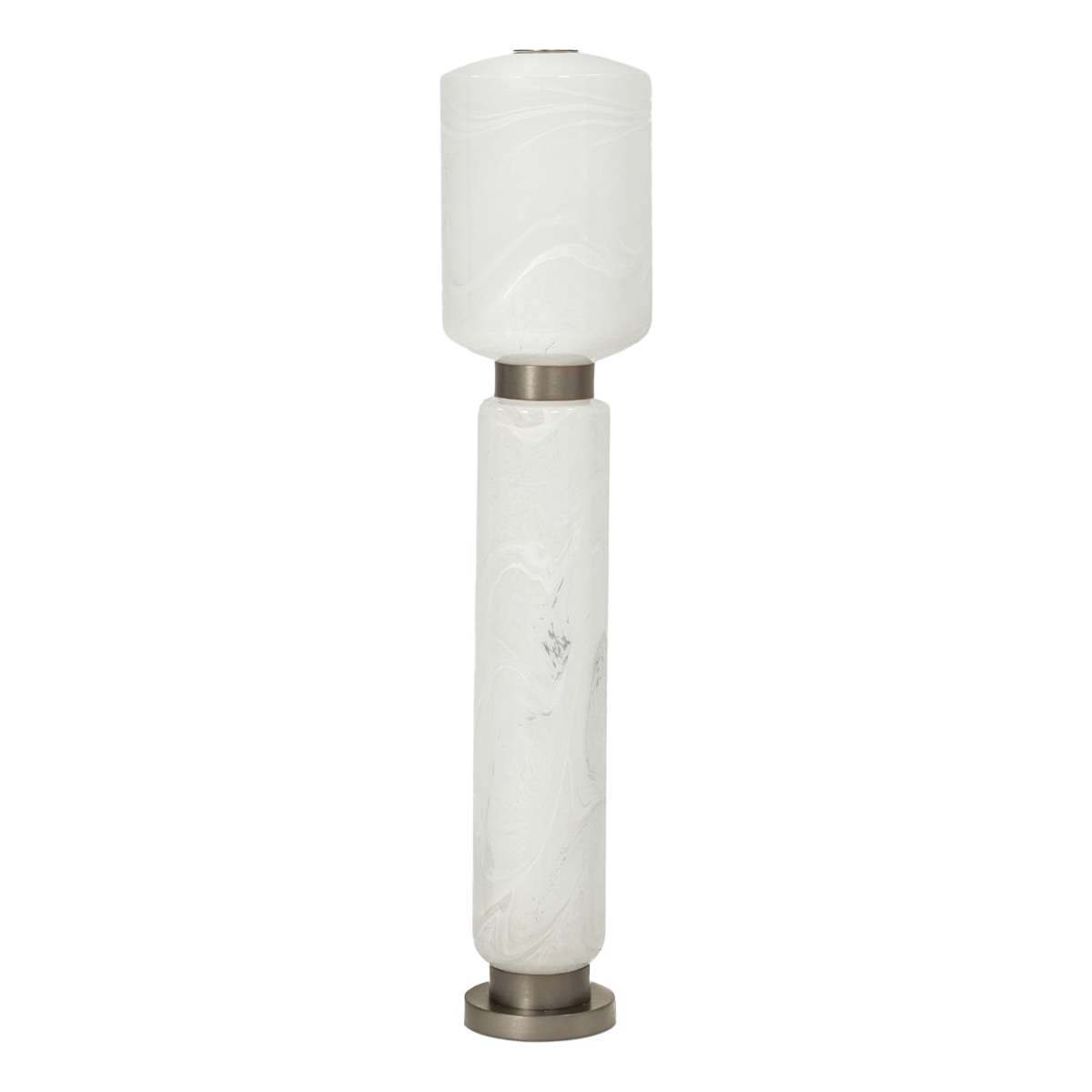 Big floor lamp in marbled finish Venetian "Murano" blown glass with base and details in satined galvanized titanium finish stainless steel. Led light included.