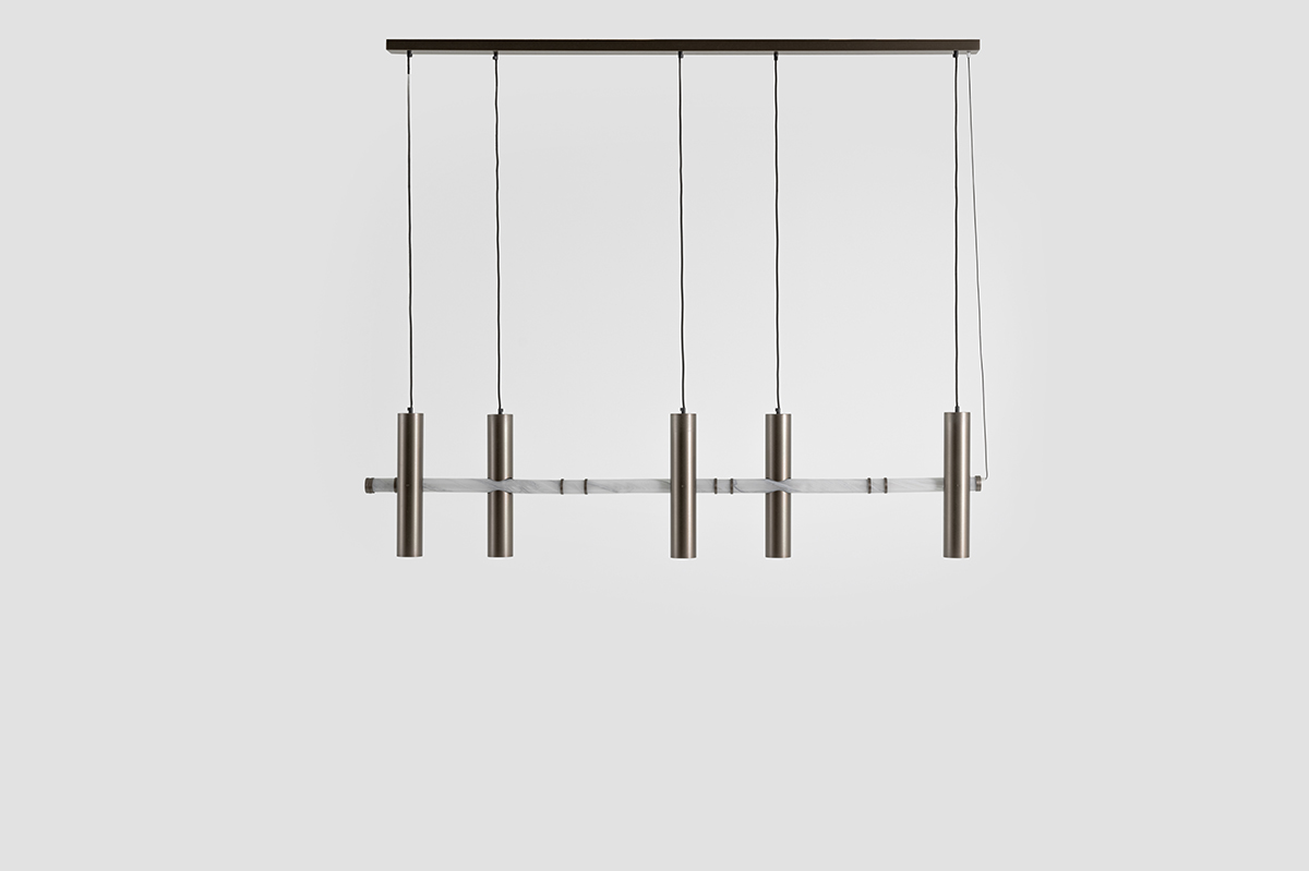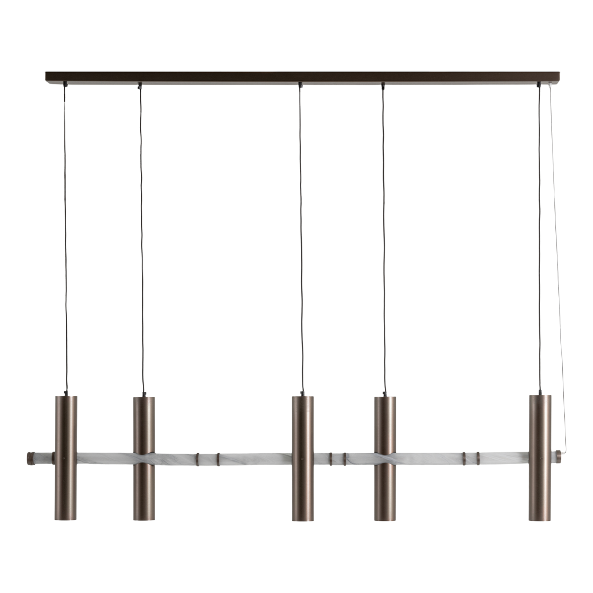 Chandelier in combination of satined galvanized titanium finish. Stainless steel and marbled finish venetian "murano" blown glass. 5 gu10. 3000°k white led lights, max 5w, needed (not included)