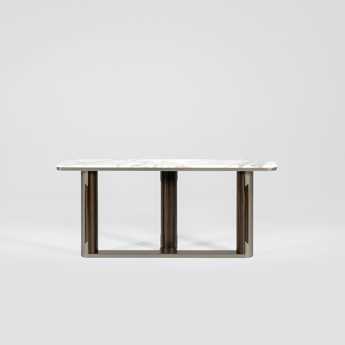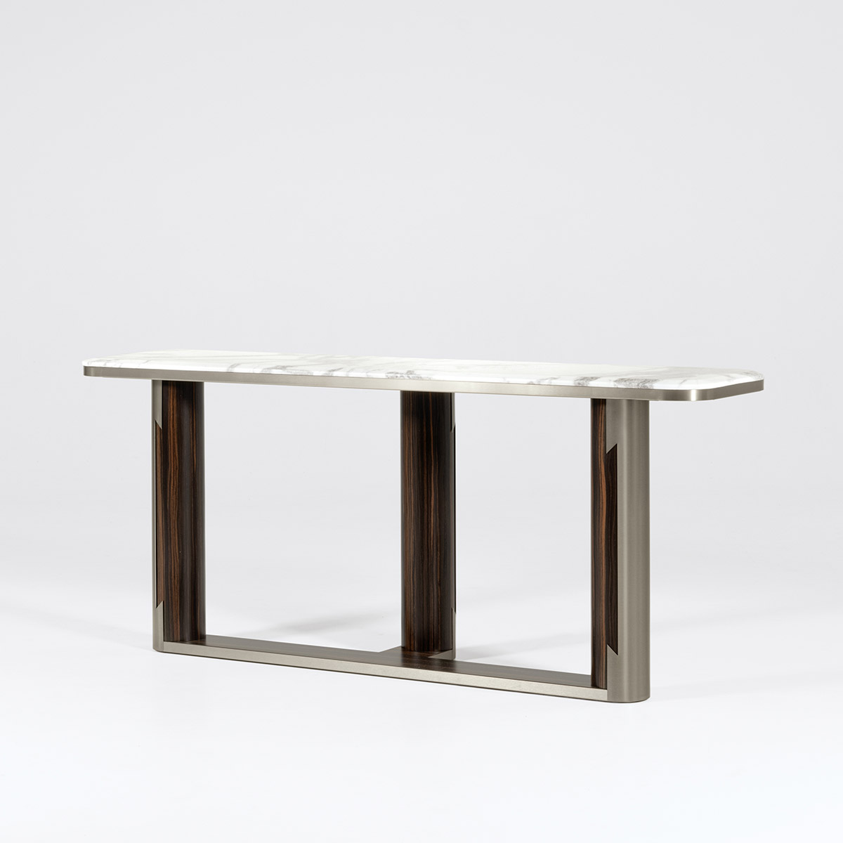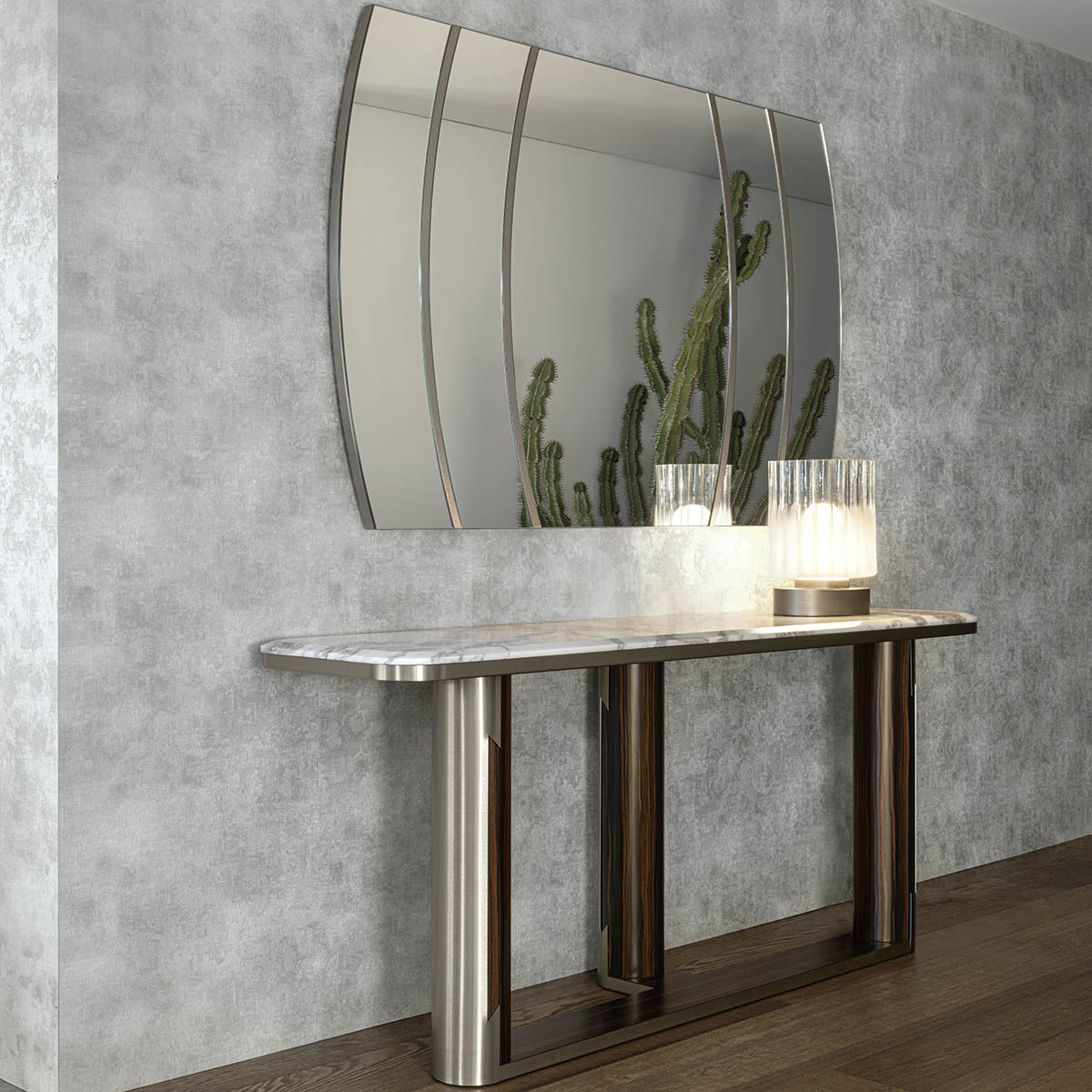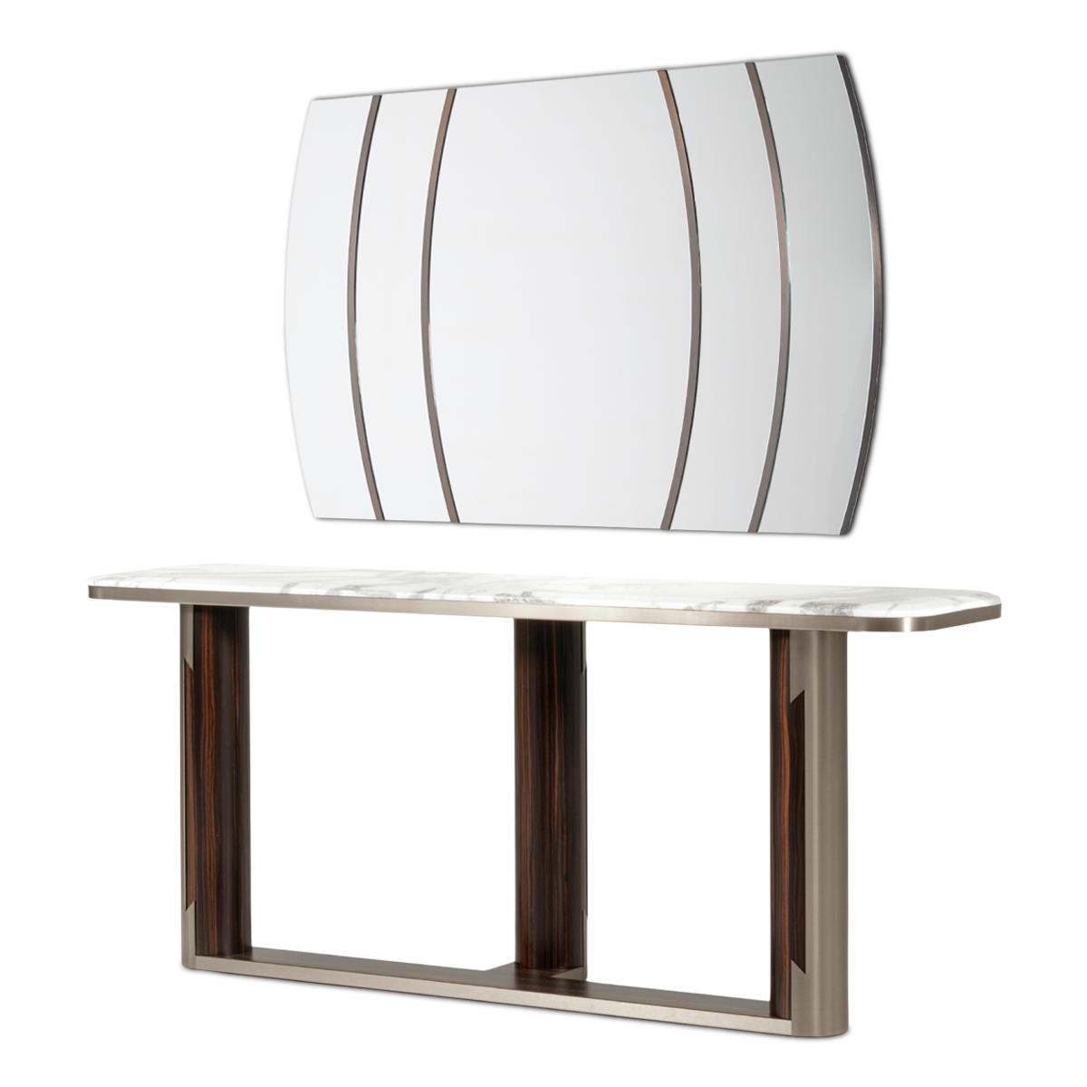 Consolle with beveled top in high gloss finish Namibian Oyster marble. 3 legs and base in combination of satined Makassar Ebony veneer and satined galvanized titanium finish stainless steel. Mirror with frame and inserts in satined galvanized titanium finish stainless steel.