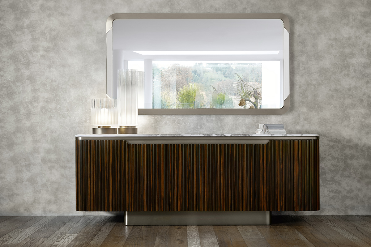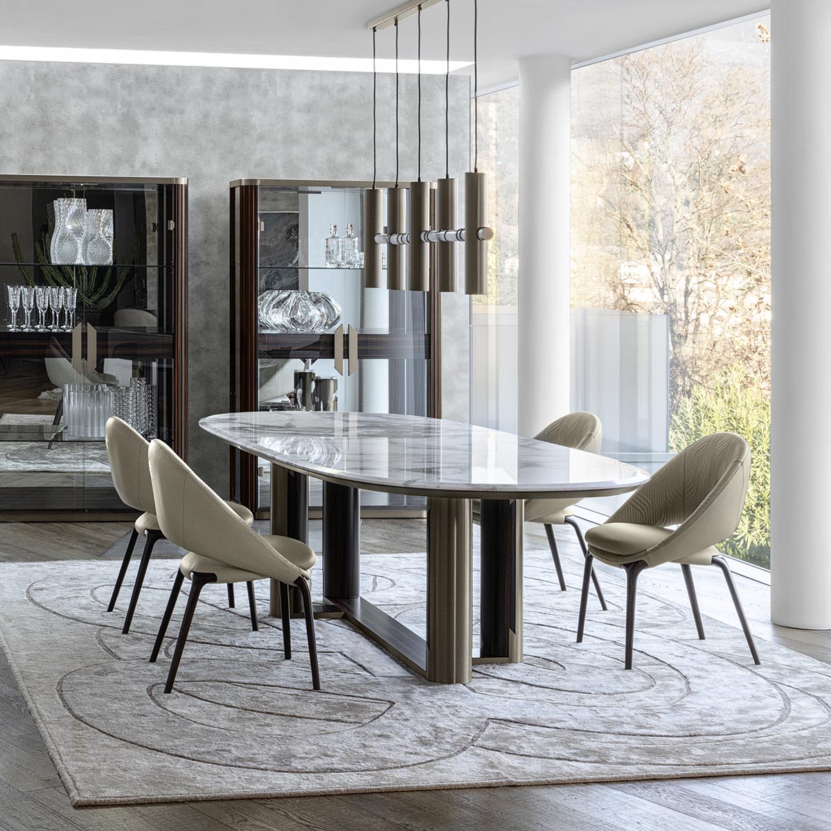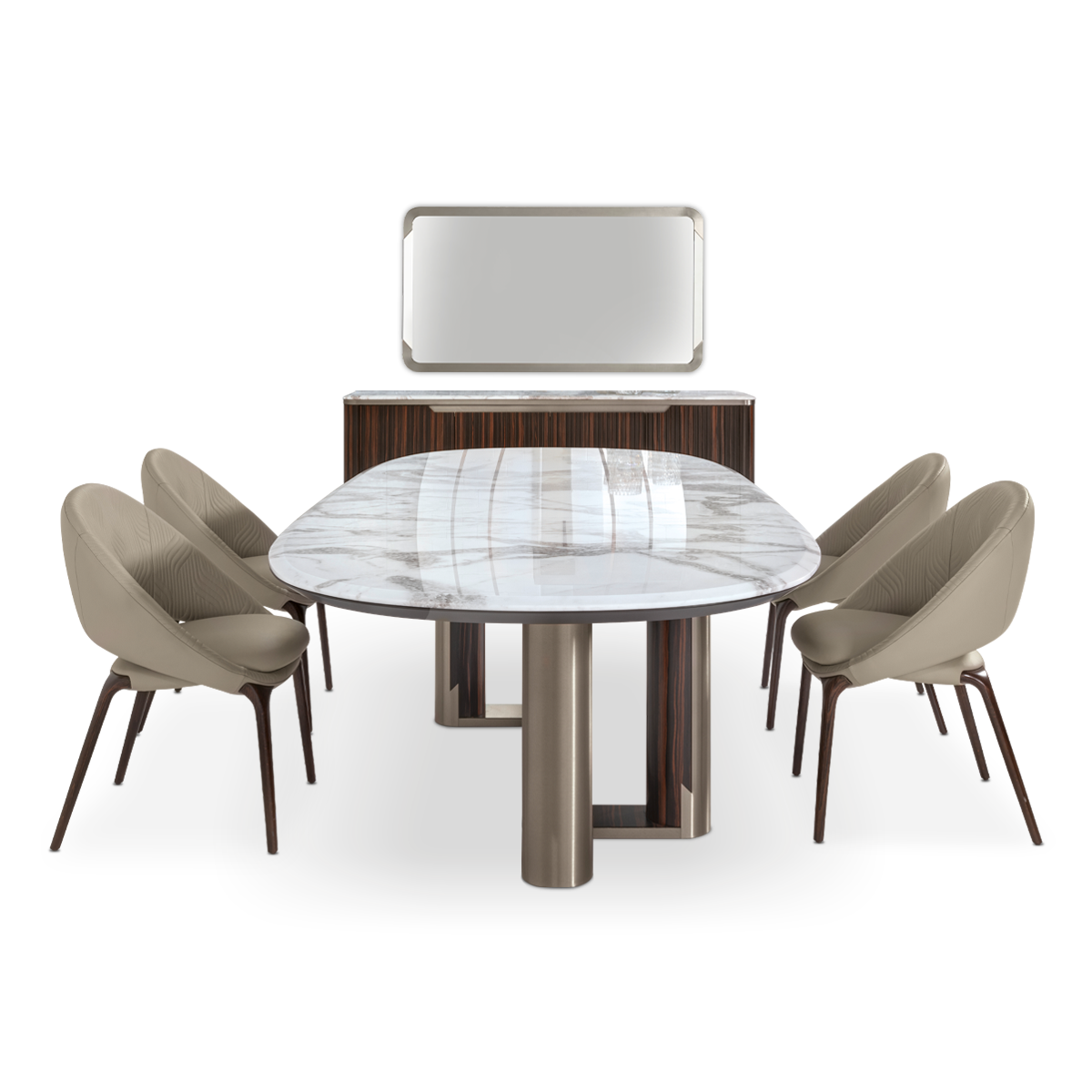 Boat shape oval table with beveled top in high gloss finish Namibian Oyster marble. 4 legs and base in combination of satined Makassar Ebony veneer and satined galvanized titanium finish stainless steel. Fully upholstered chair in solid beech available in first grade leather. Quilted inside back and outside back with embroidered Giorgio Collection logo. Seat height cm.47. Buffet with 4 doors in ribbed satined Makassar Ebony veneer. Beveled top in high gloss finish Namibian Oyster marble. Base and details in satined galvanized titanium finish stainless steel. 1 interior full extension drawer with front in satined Makassar Ebony veneer, bottom part in velvet fabric. 3 adjustable tempered glass shelves. Mirror: Rectangular mirror with frame in combination of glass and satined galvanized titanium finish stainless steel.